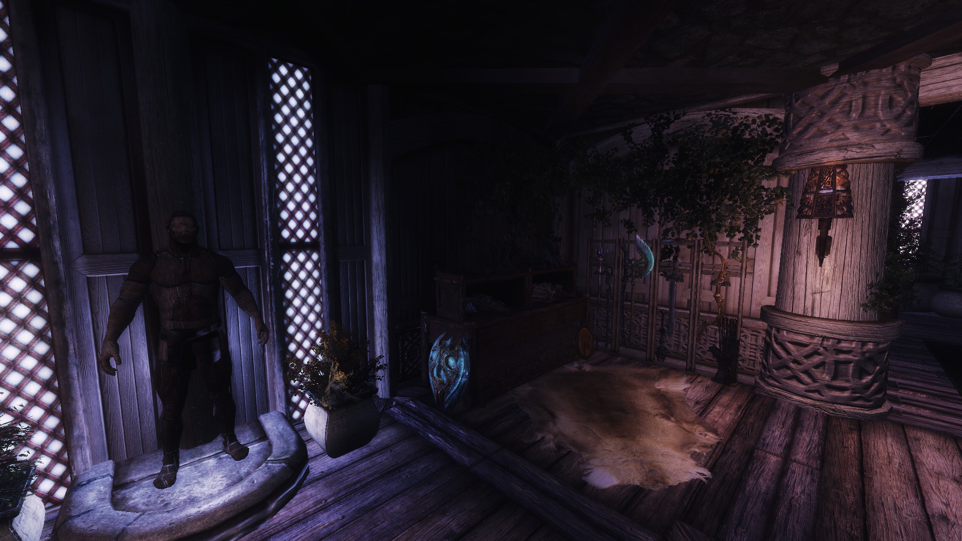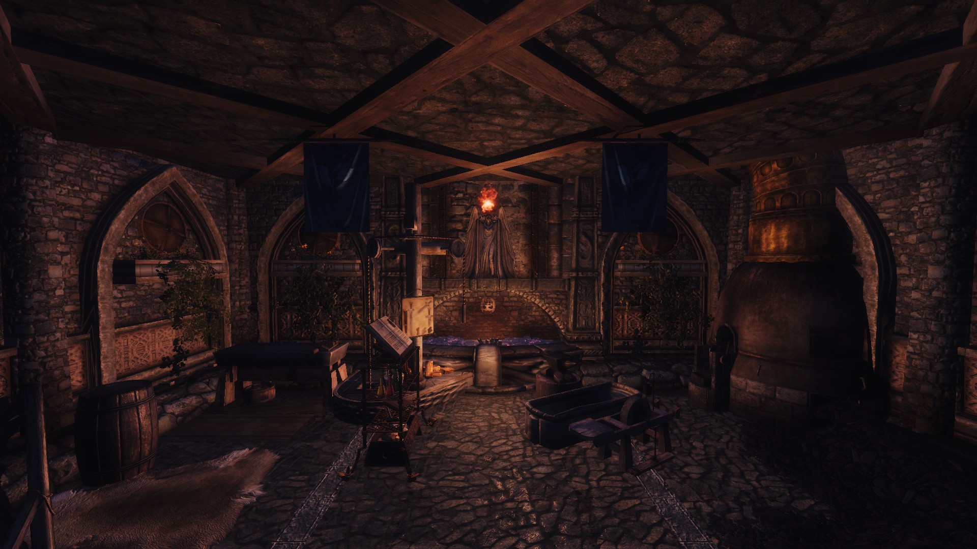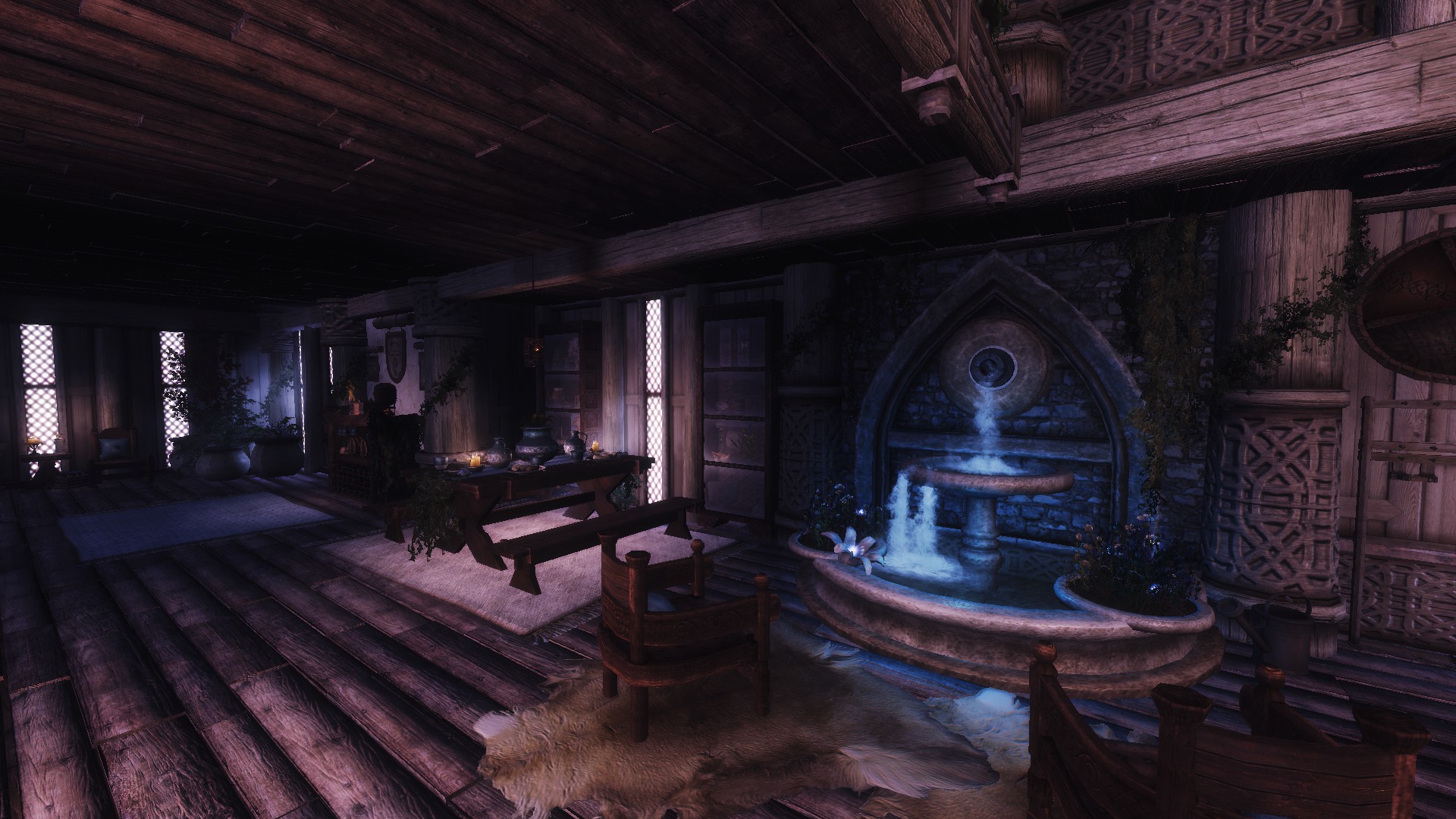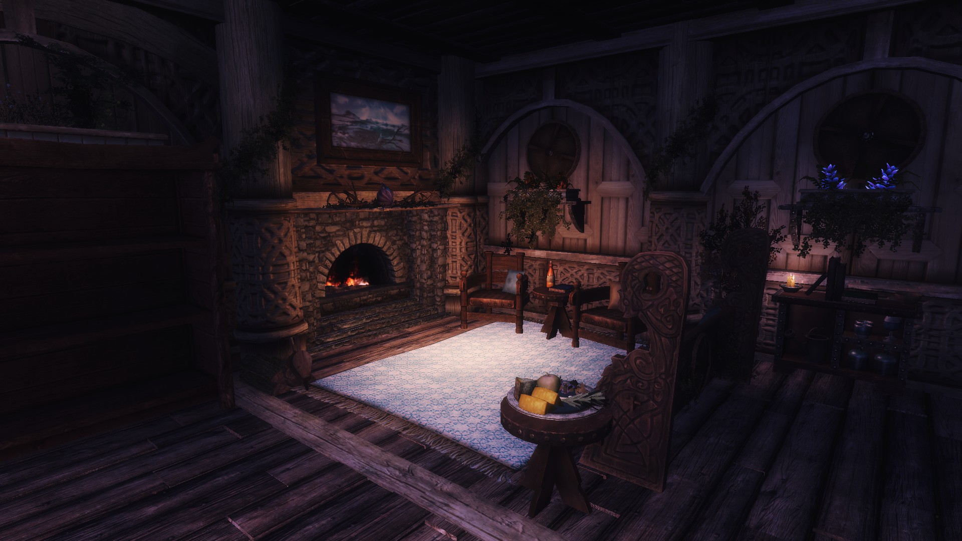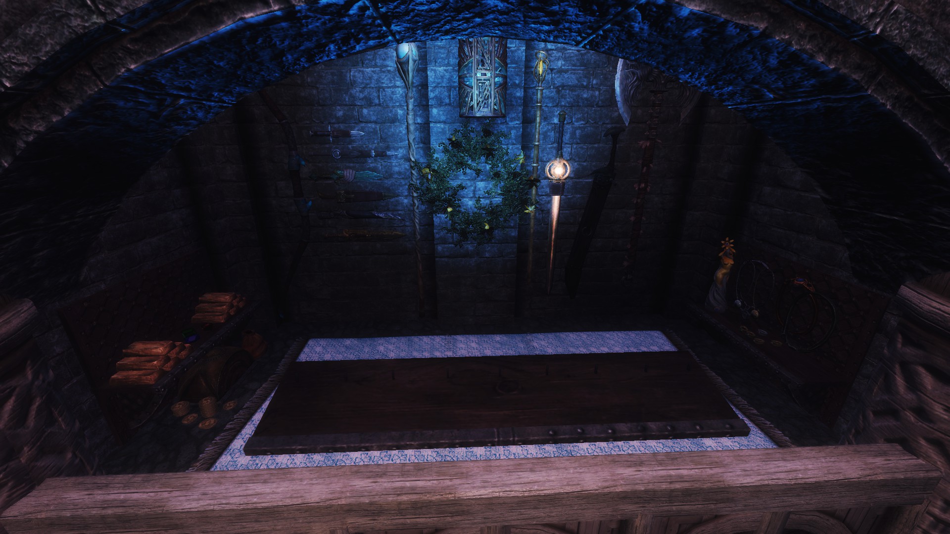 - Жилые комнаты Довакина, где есть кабинет с камином, банная комната, спальня с хранилищем и витриной для амулетов богов.