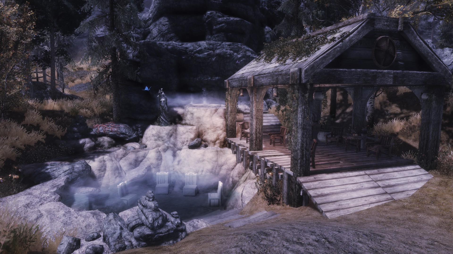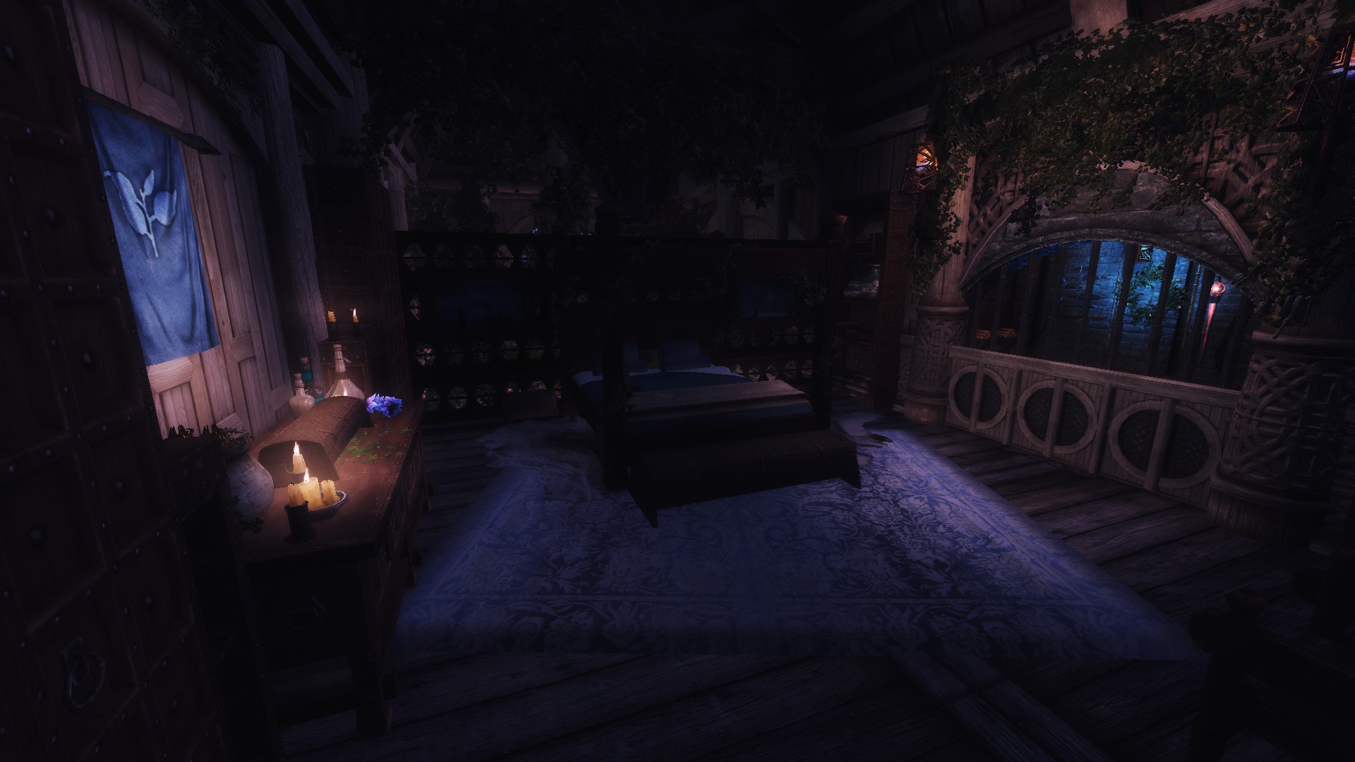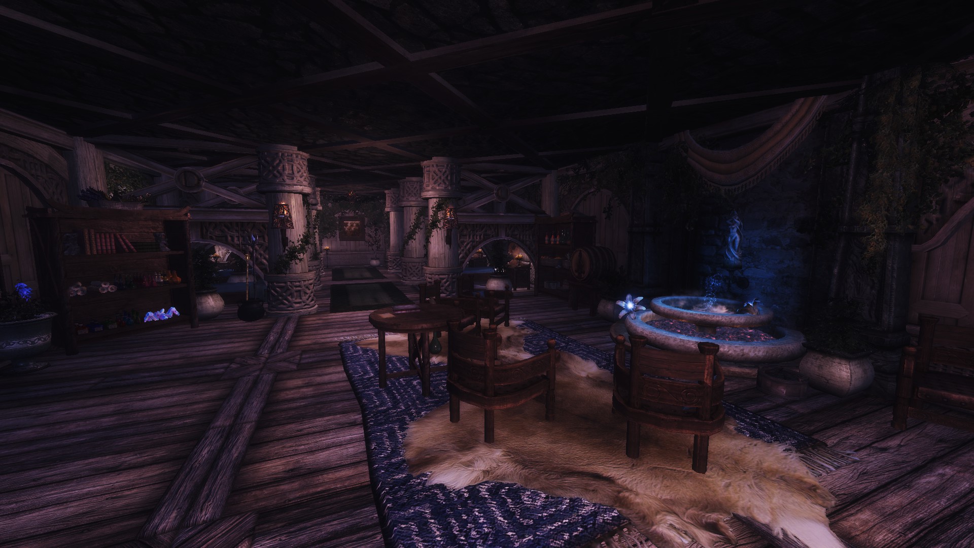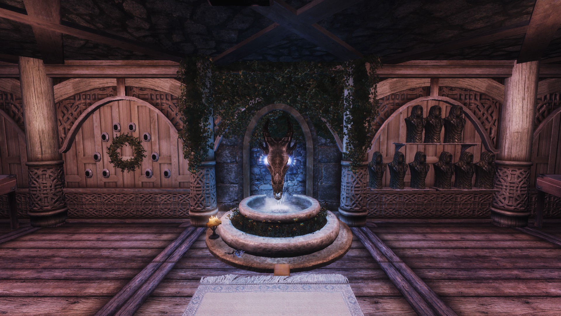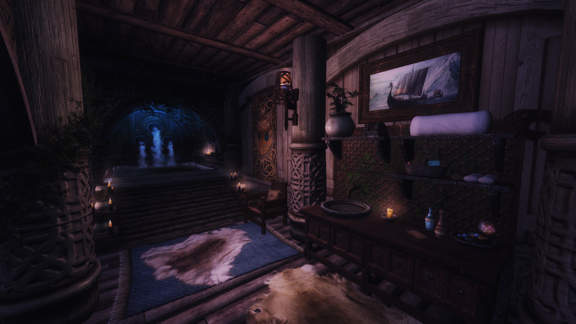 - Жилые комнаты Довакина, где есть кабинет с камином, банная комната, спальня с хранилищем и витриной для амулетов богов.