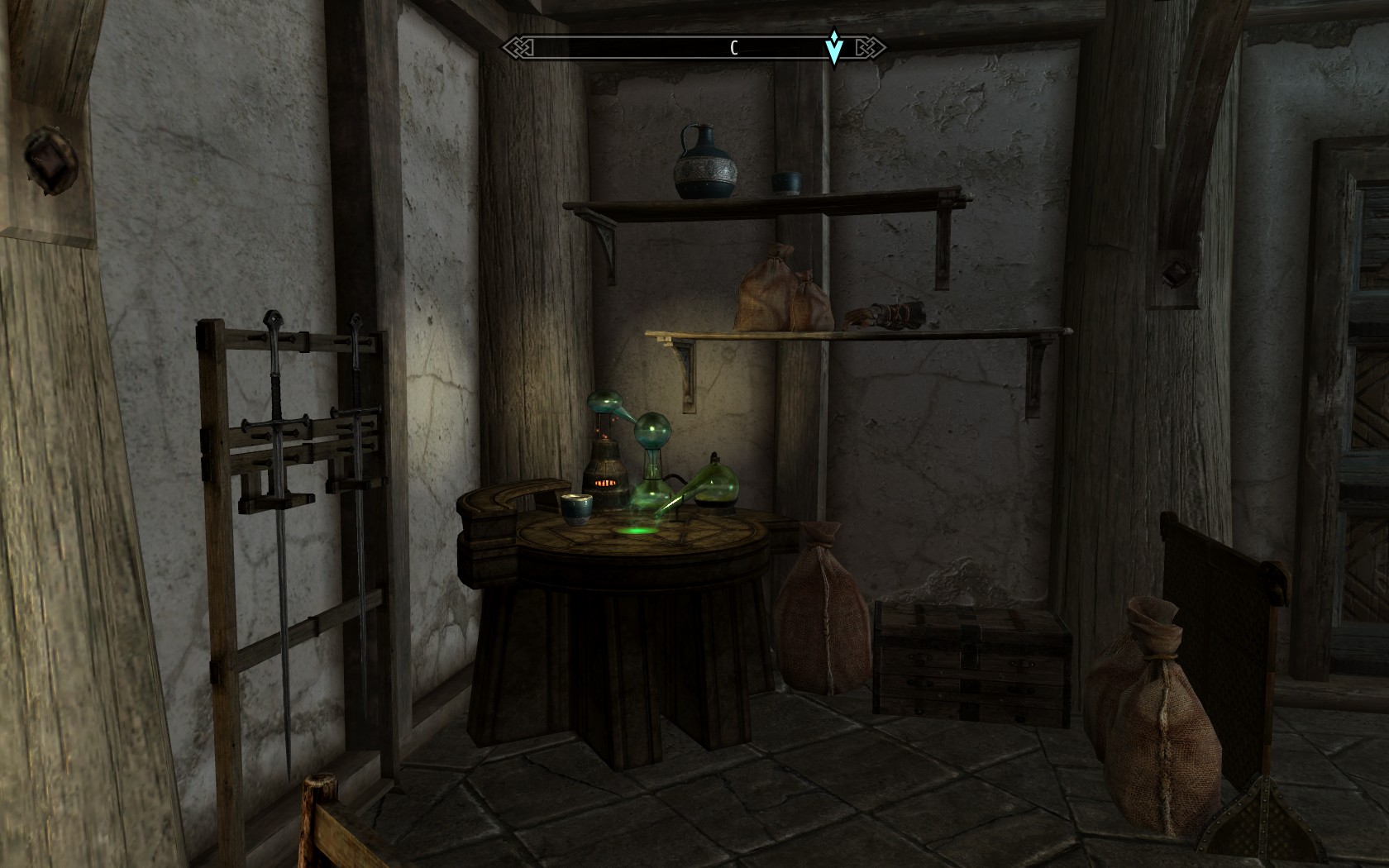 В доме есть кухня,спальня, алтарь зачарования, алхимический столик, шкафы для книг и одежды, мешки для запасов еды, сундуки для зелий и сокровищ, стойки для оружия и др.