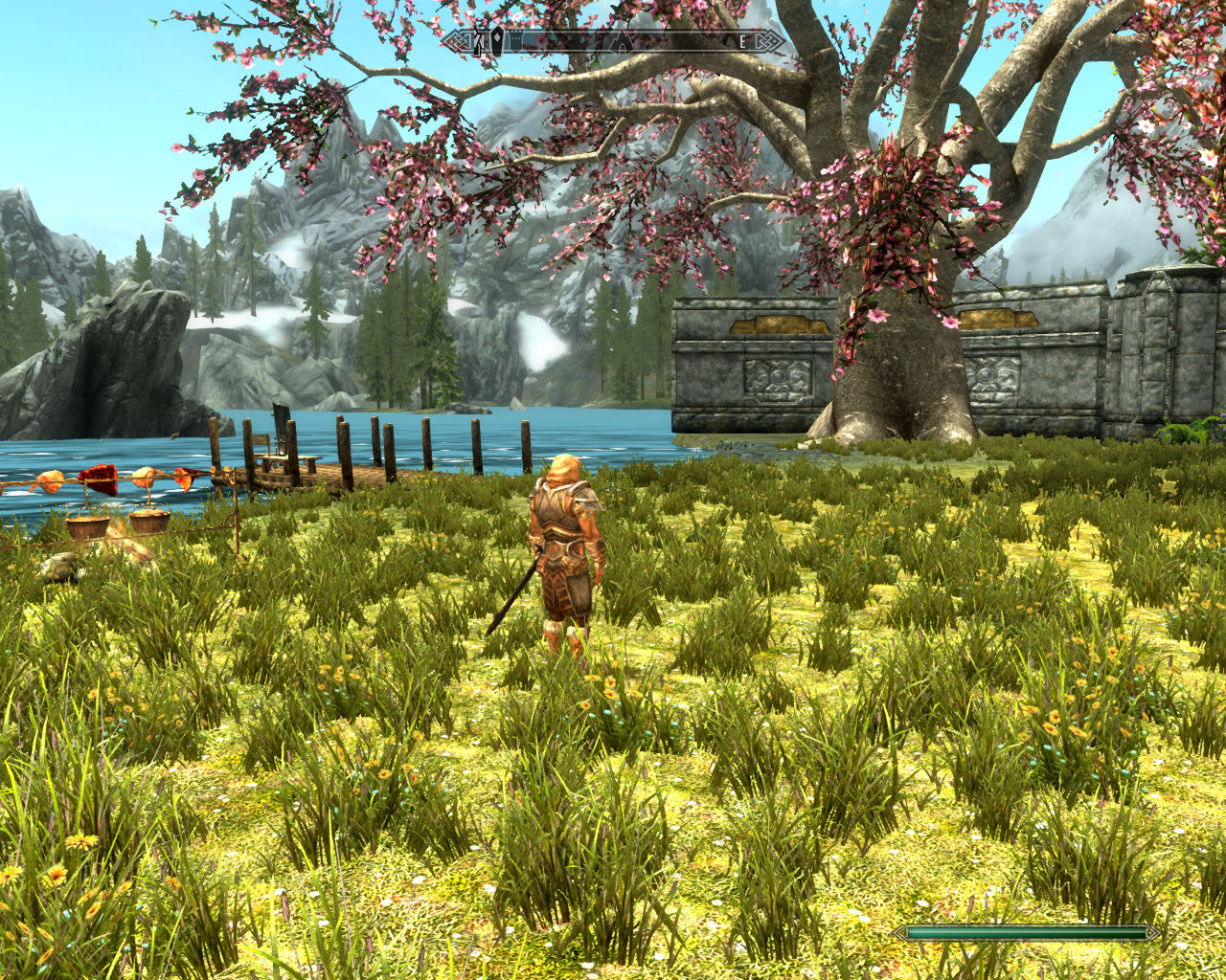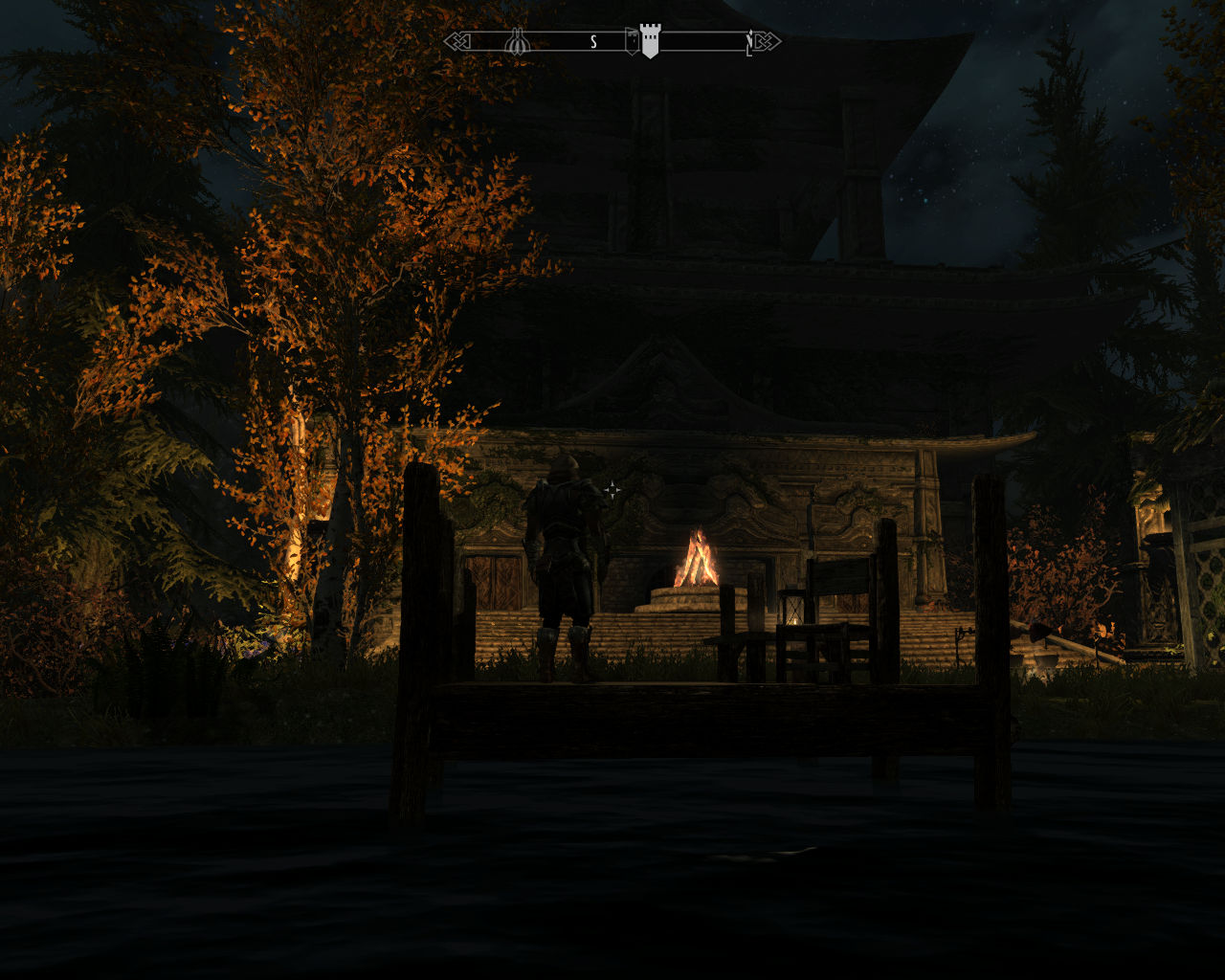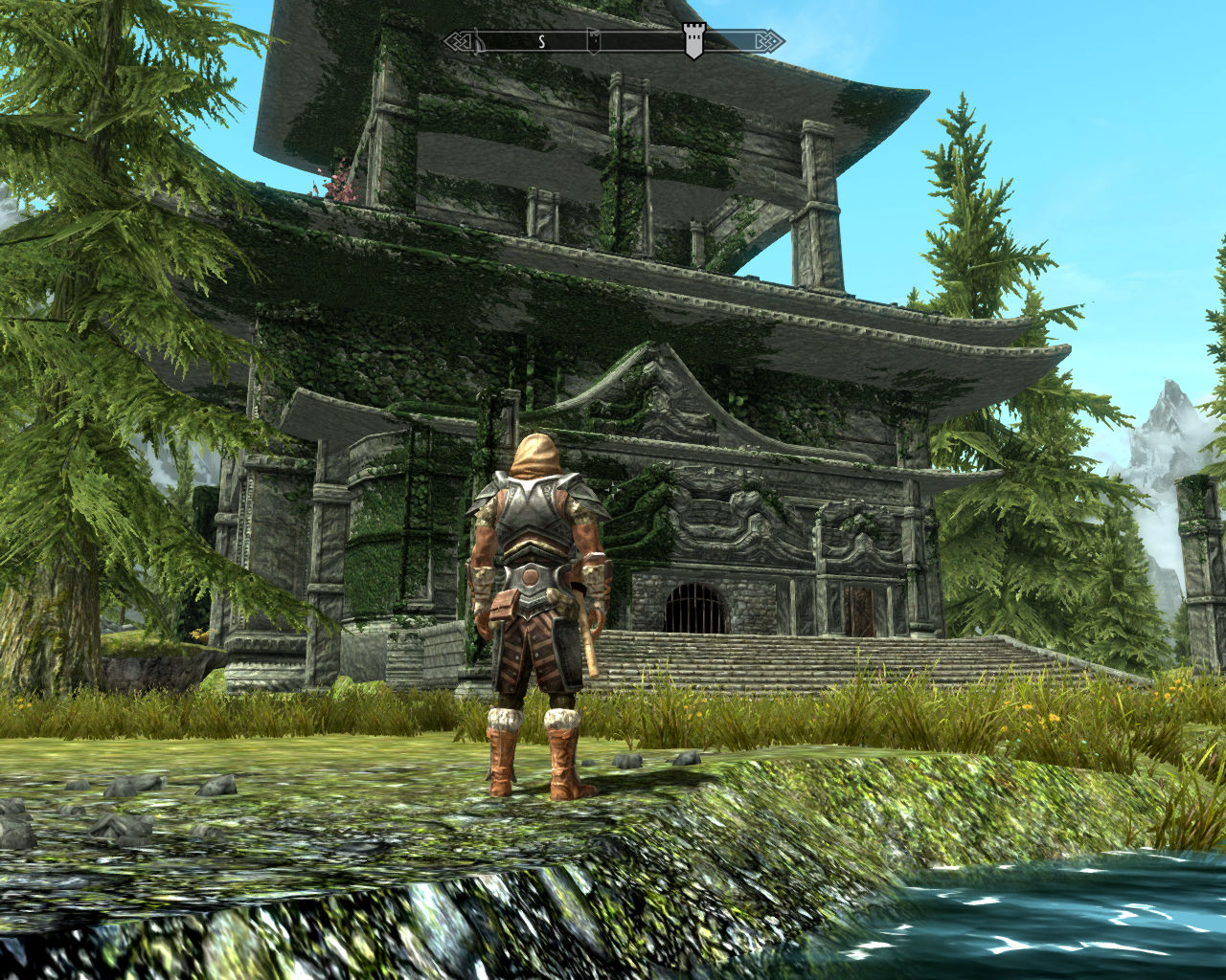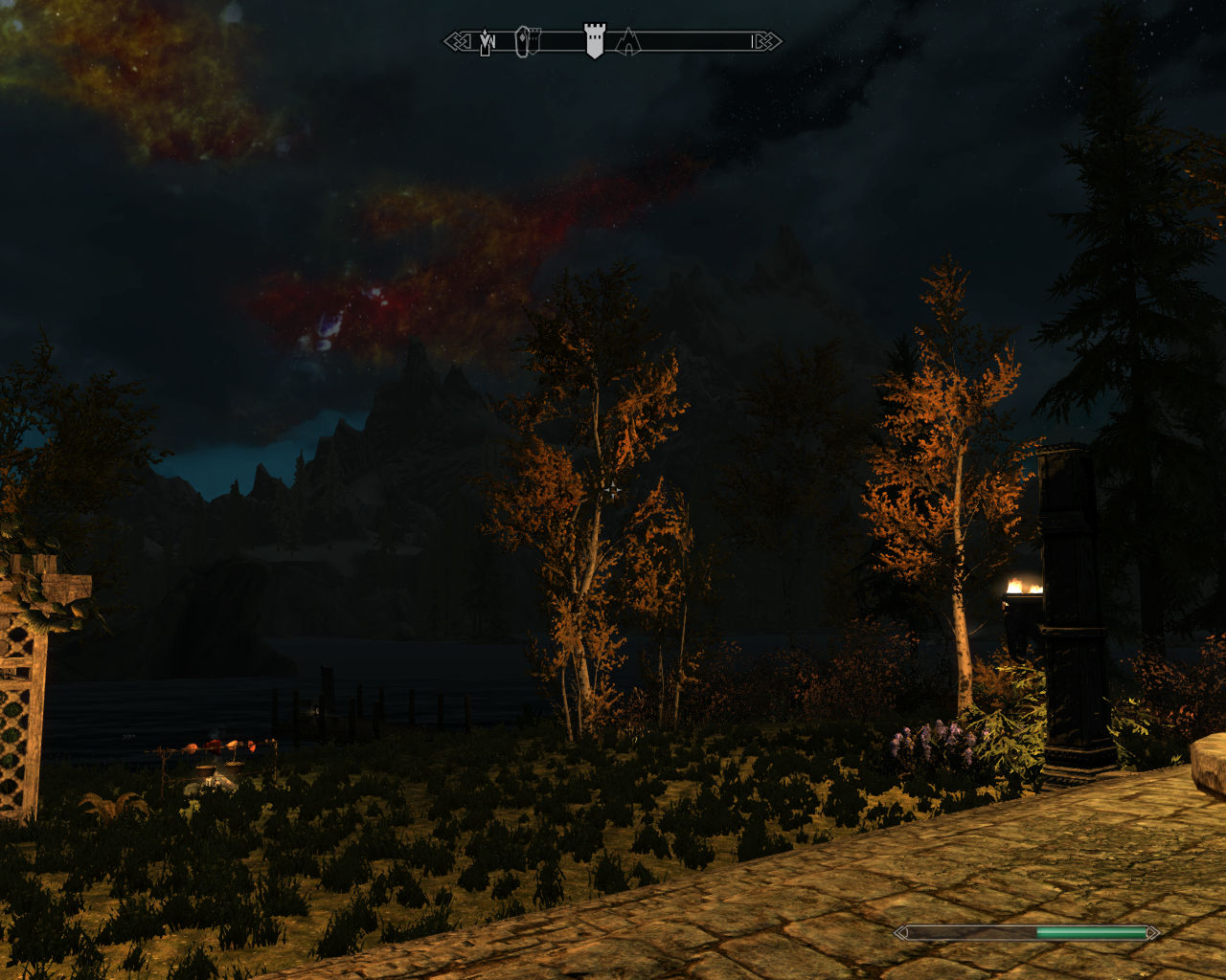 Никаких enb на скринах не использовалось. Для достижения эффекта как на скринах используйте мод SkyrimURWL (не нагружает систему).