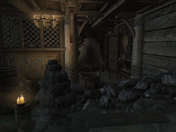 Поместья из Hearthfire изначально лишены бань. Имеются две серии модов, исправляющих это - "
