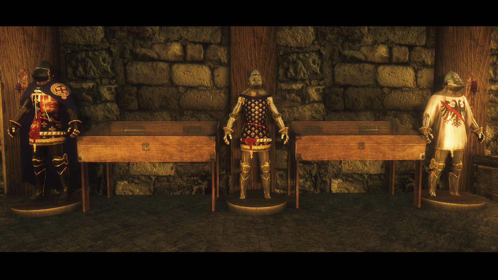 О: Я добавил геральдические доспехи для всех 26 оригинальных членов-основателей Ордена Подвязки, а также нескольких более поздних членов. Также добавлены доспехи нескольких известных личностей и королевств периода Столетней войны. Что касается оружия, то мод содержит 4 варианта полиэкса, кинжал, гербовый щит в комплект к каждому доспеху, и 7 вариантов мечей (некоторые имеют двуручные и одноручные версии). Также мод содержит одежду, 16 вариантов шаперонов (средневековый головной убор), 7 вариантов пуленов и 10 вариантов пурпуэна (средневековый камзол).