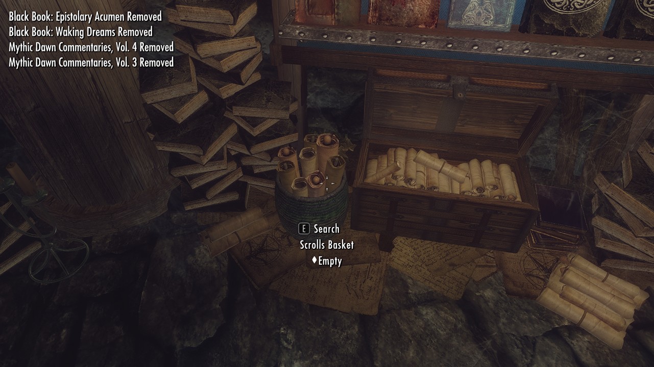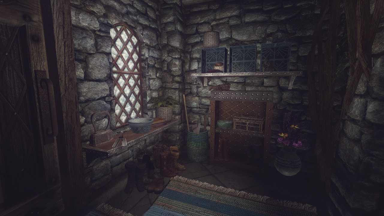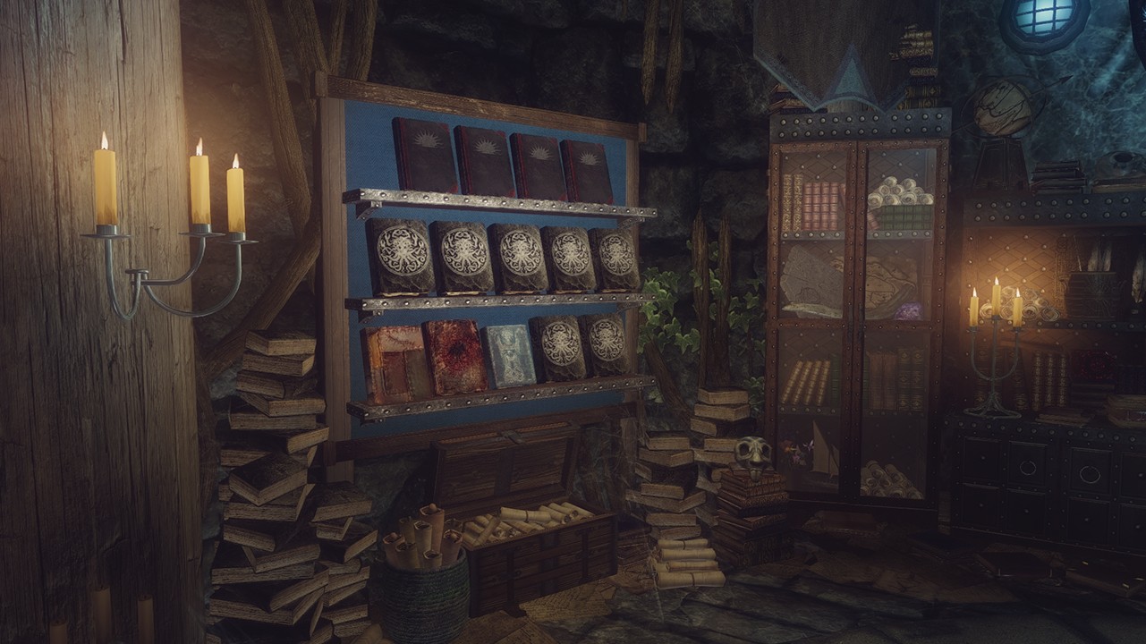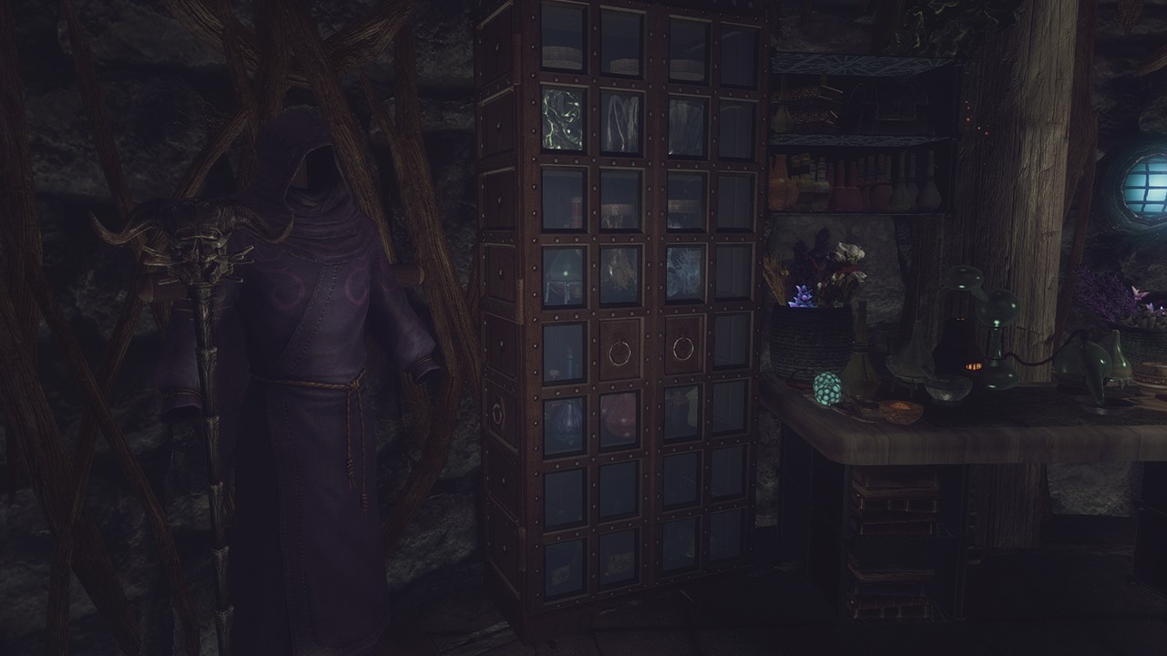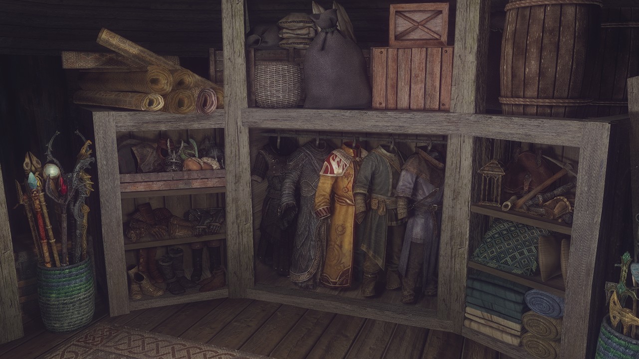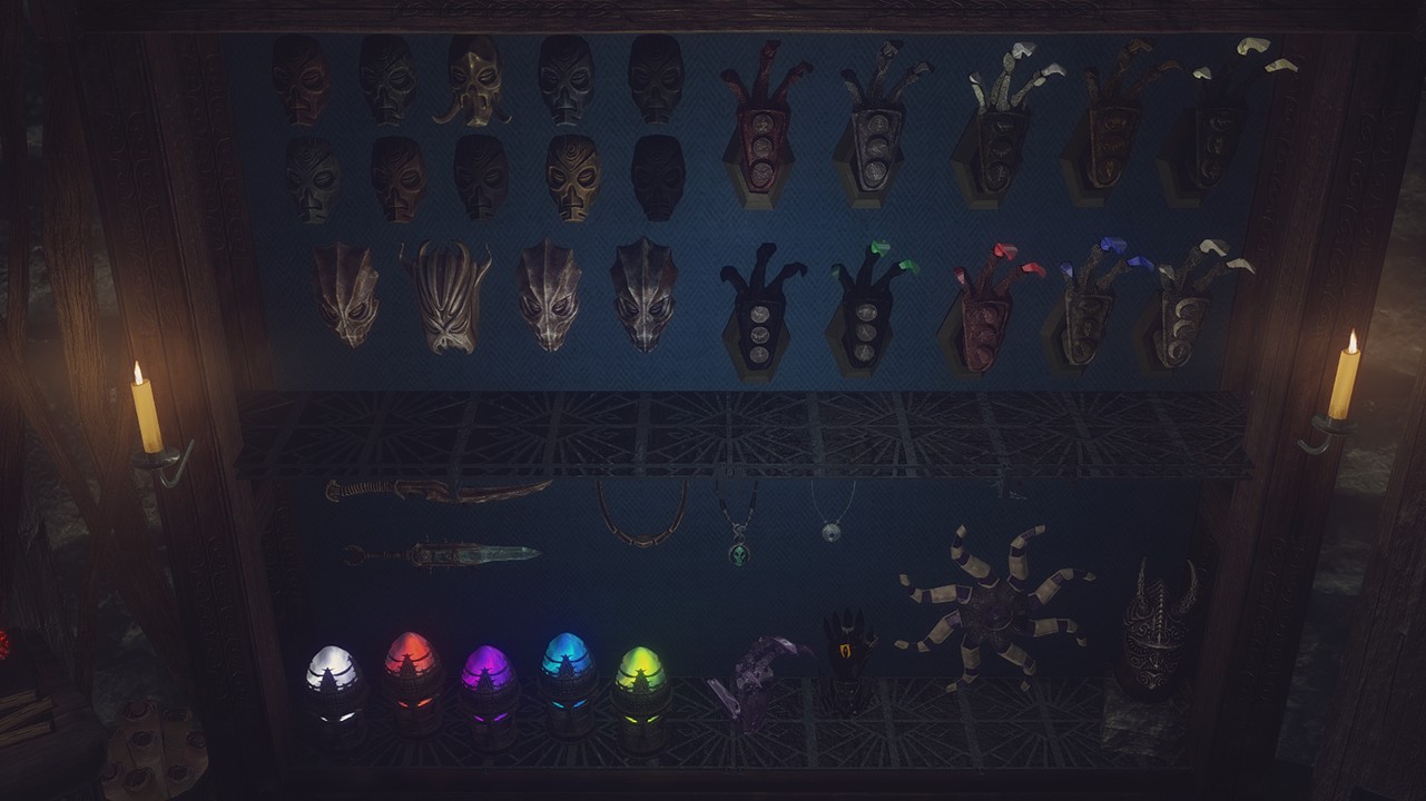 - Витрины, стойки для брони и подставки для многих уникальных предметов из игры: масок, когтей, даэдрических предметов, черных книг, древних свитков