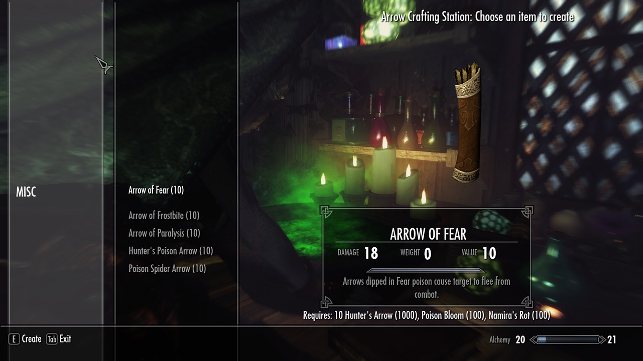 Найти книгу навыков можно в доме на полке, где покоятся склянки с ядом. После прочтения книг вы сможете изготавливать охотничьи стрелы в кузнице, а затем использовать их для закалки ядом на соответствующем столе напротив алхимической лаборатории.