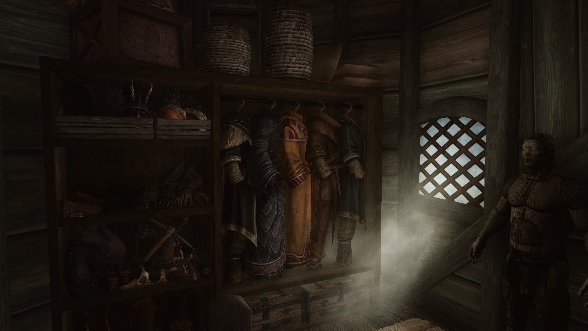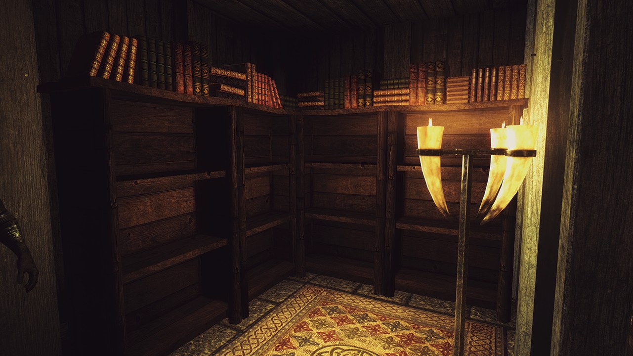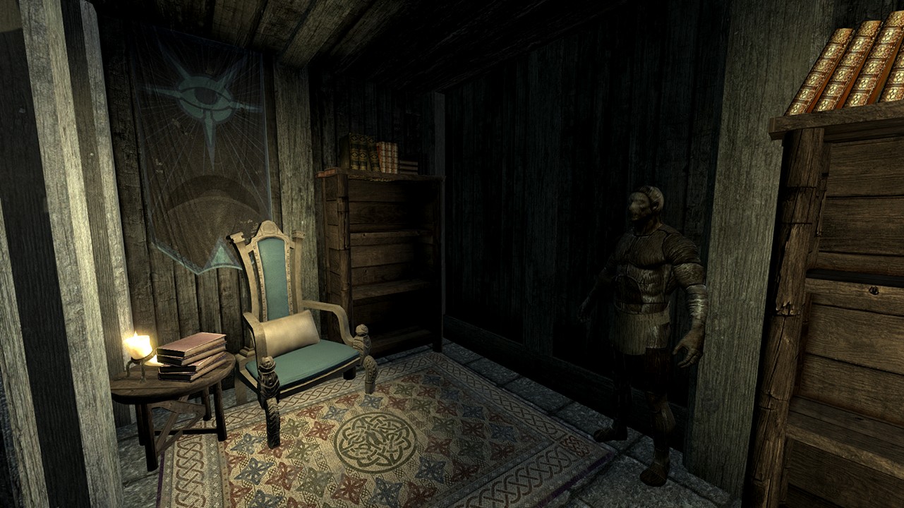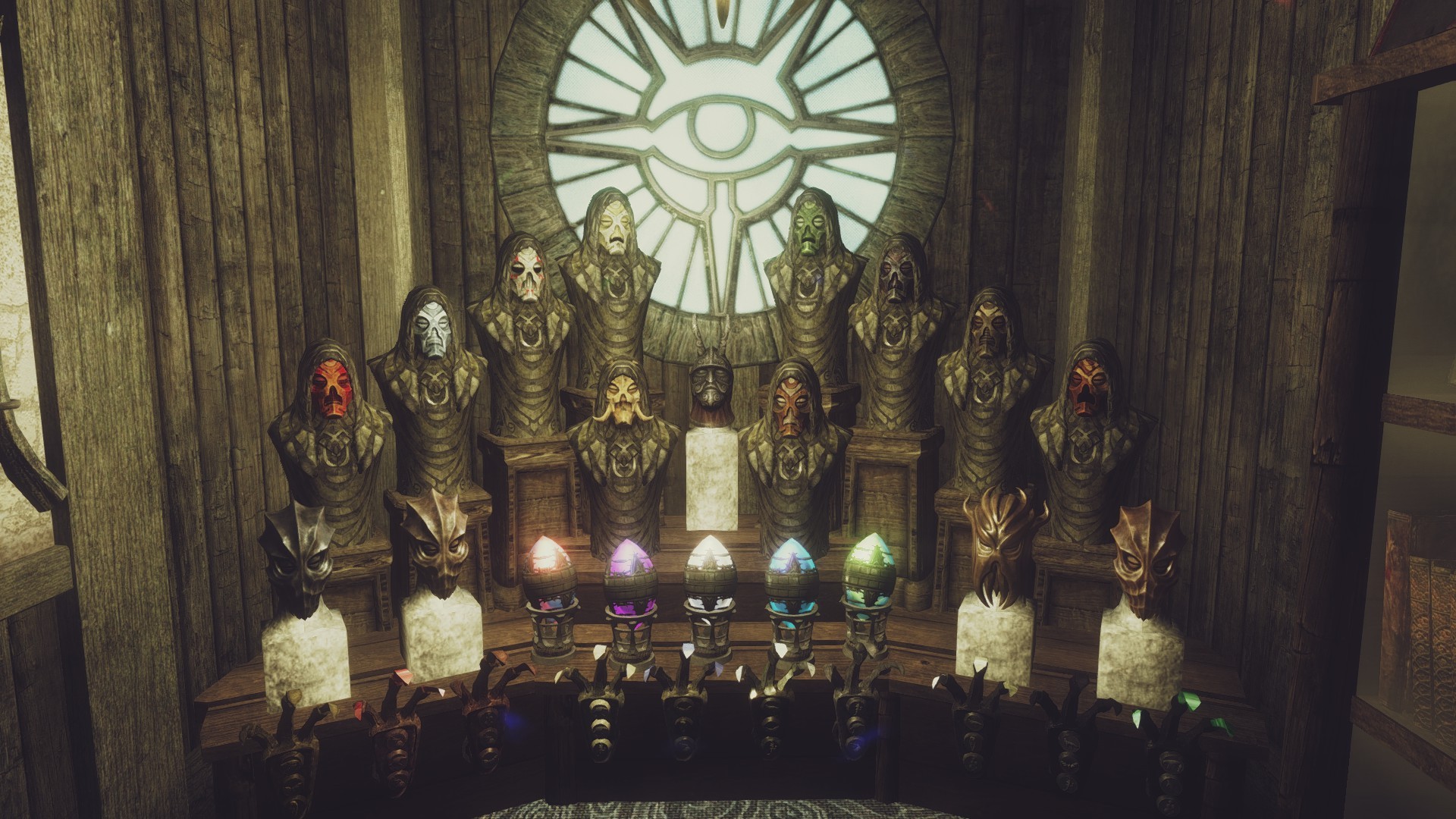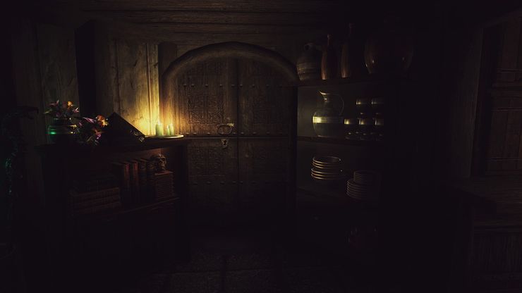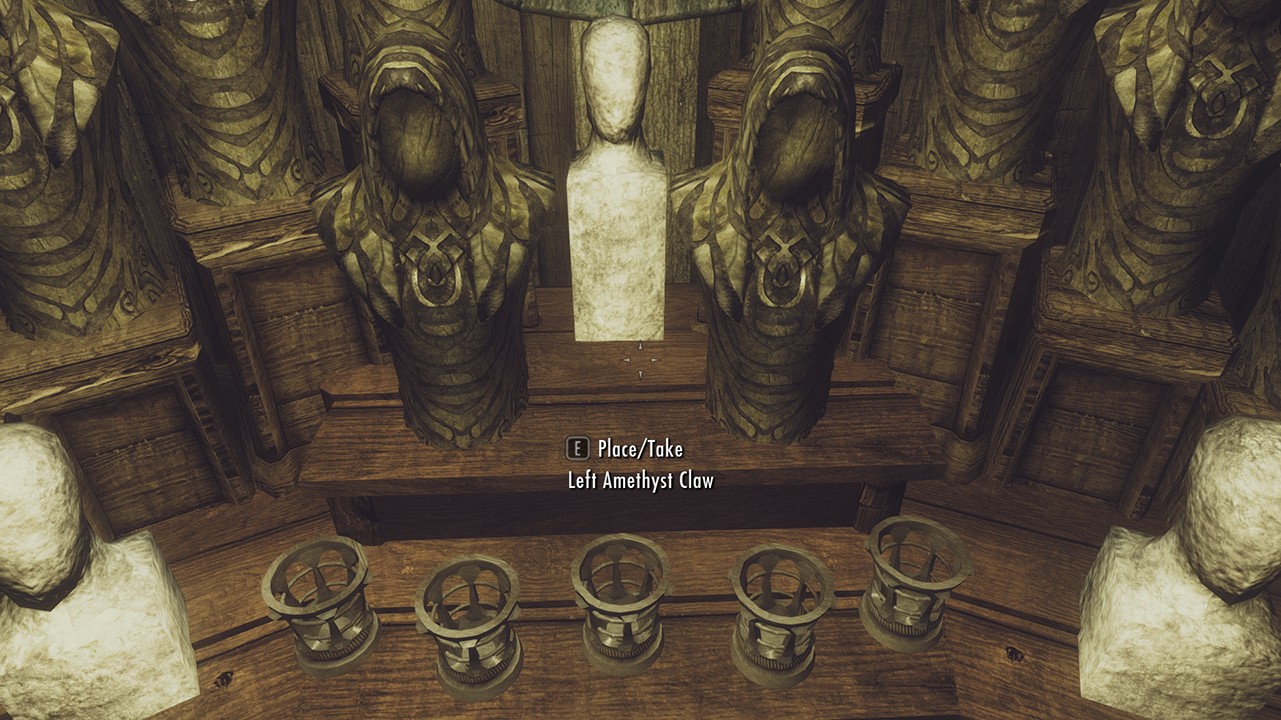 - Секретная комната с множеством витрины для уникальных предметов (маски, когти и другие магические/даэдрические предметы)