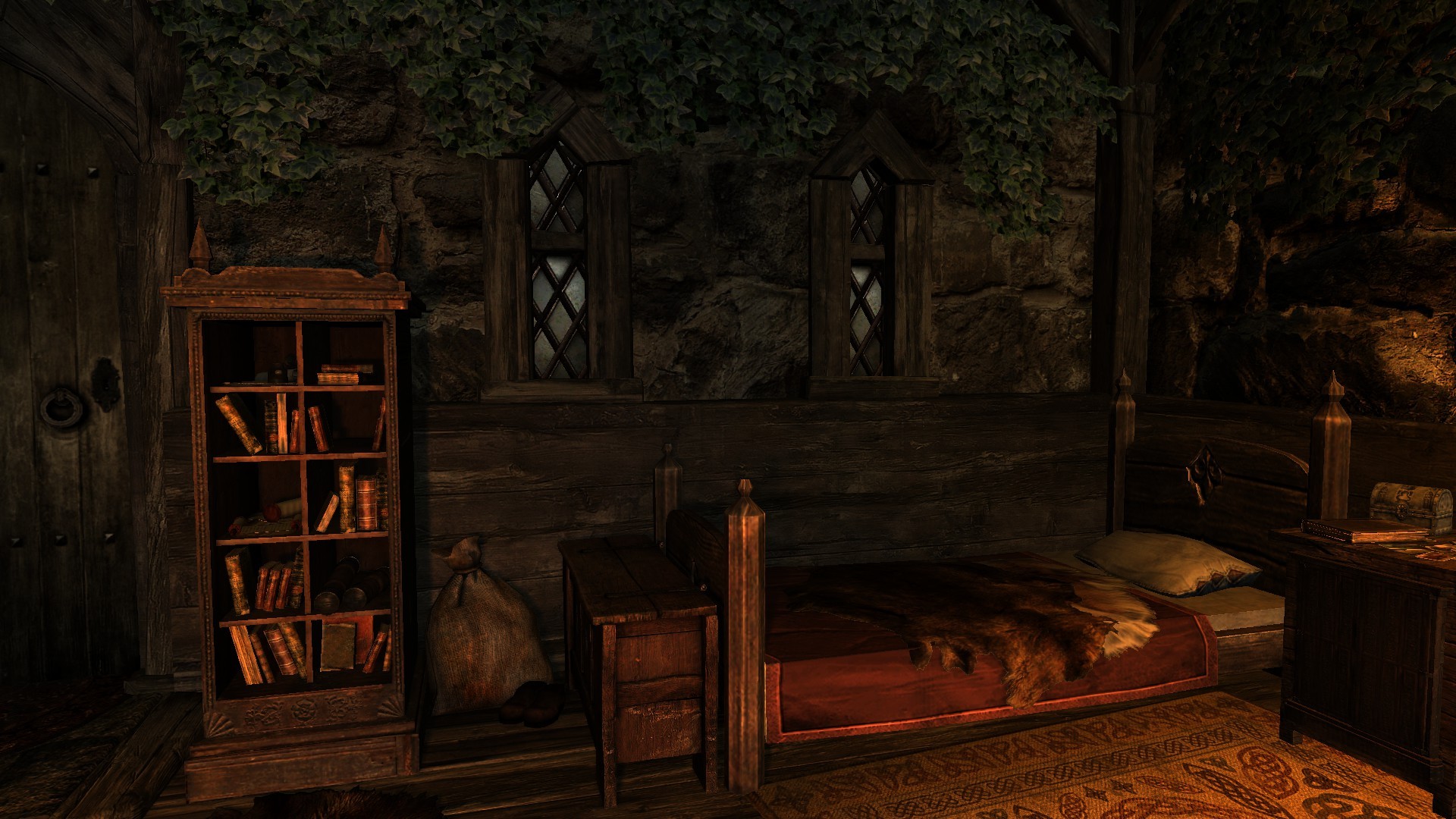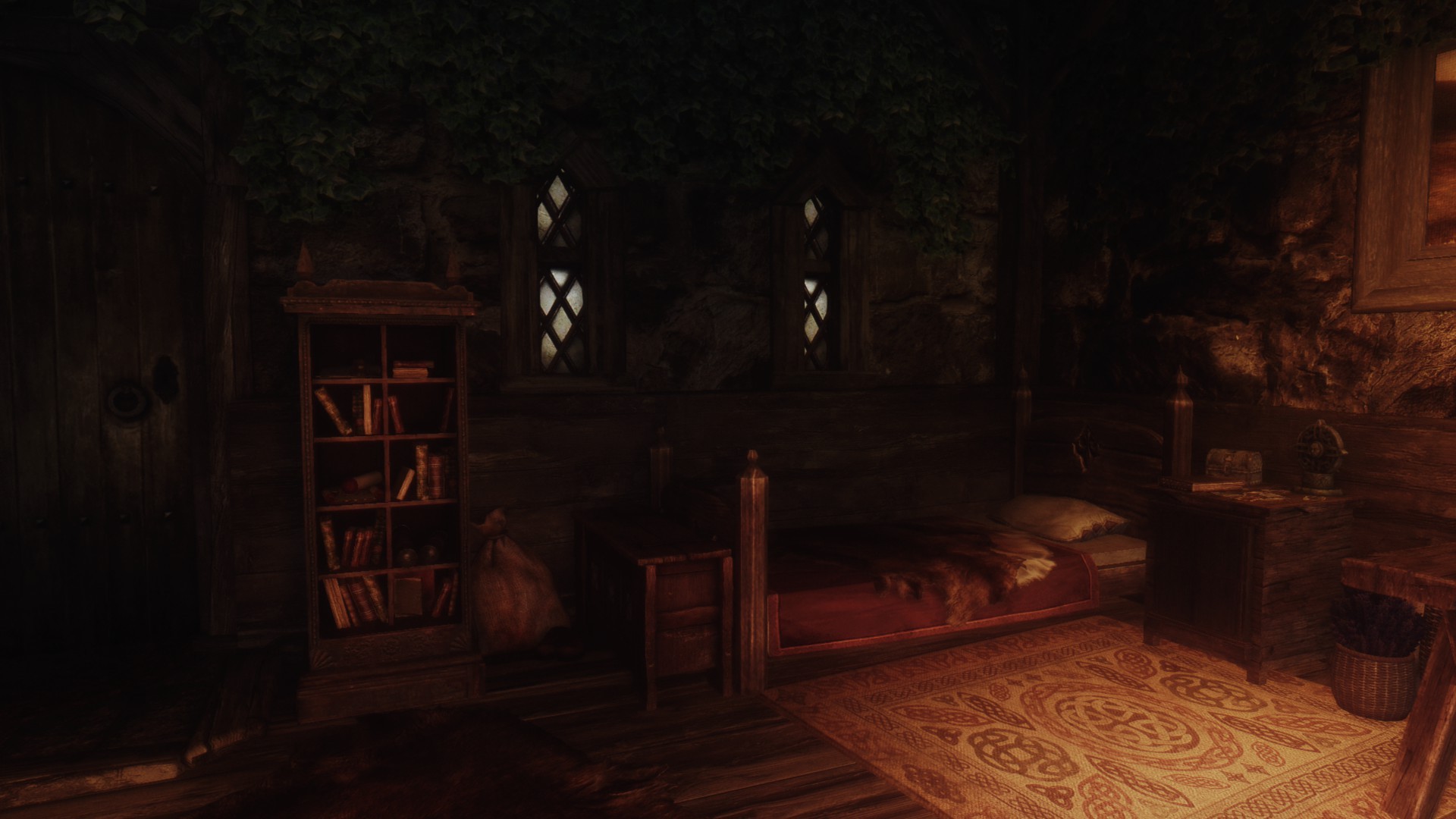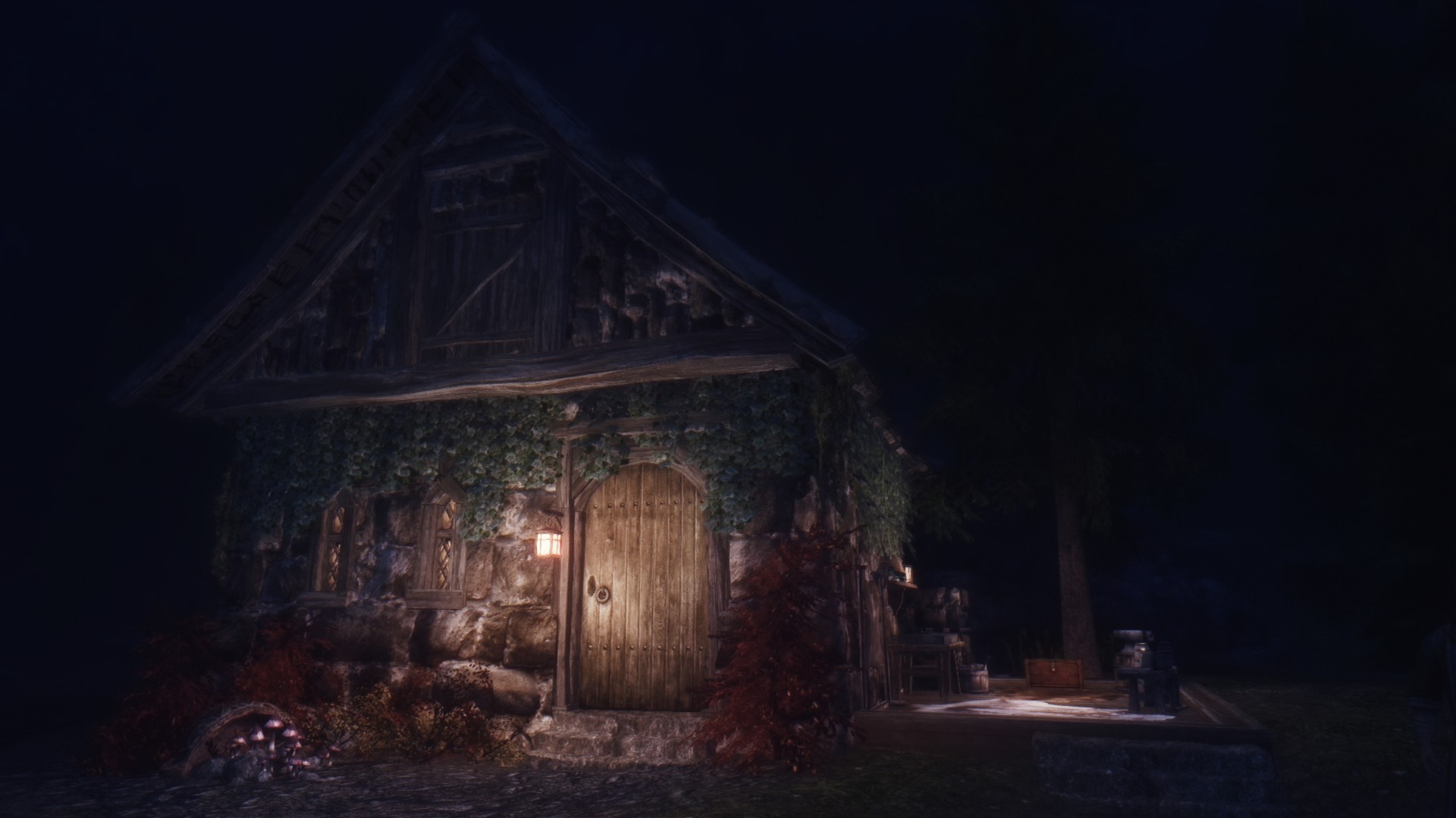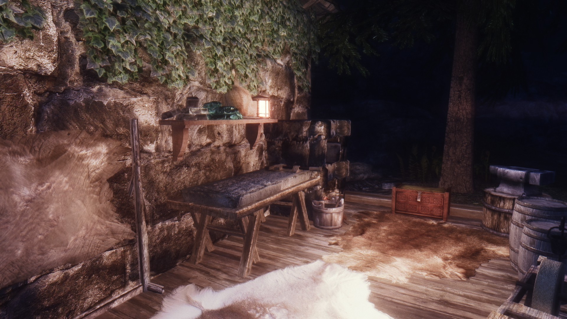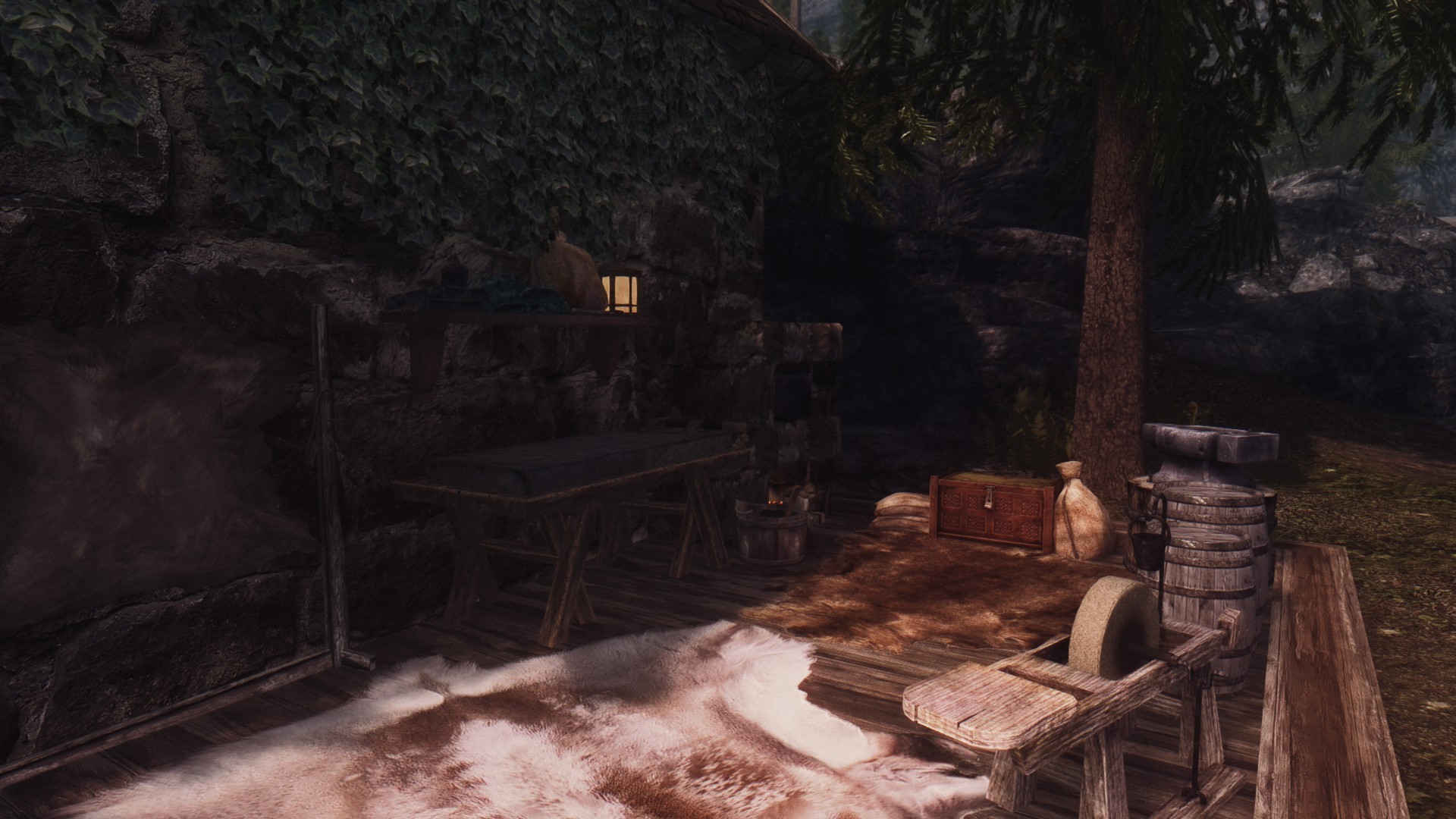 Это очень простой домик с одной комнатой и кроватью, котелком для приготовления еды, а также столами для занятий алхимией и зачарованием. Кузницу вы найдете снаружи. В доме полно безопасных хранилищ. Снаружи вы также найдете два фонаря, которые можно зажечь и погасить. В доме проложен навмеш, так что спутники смогут зайти внутрь