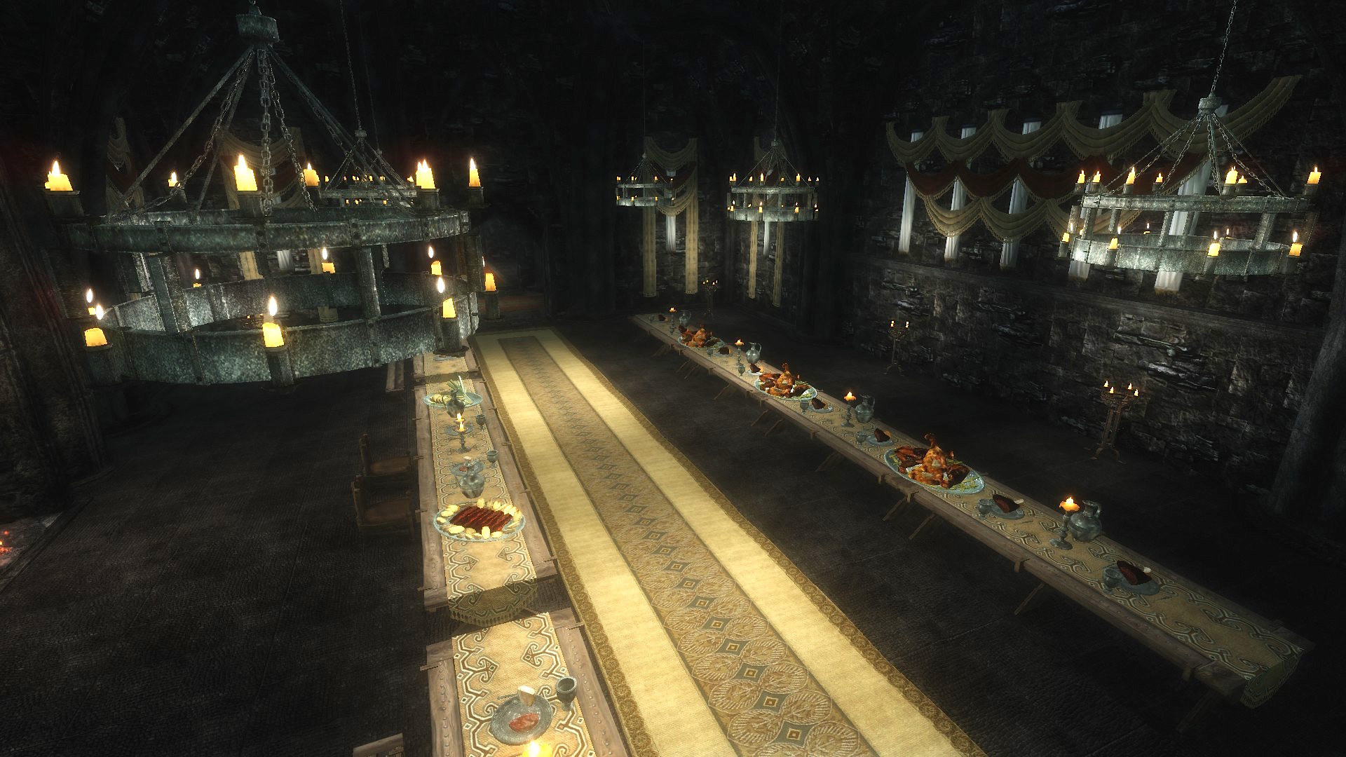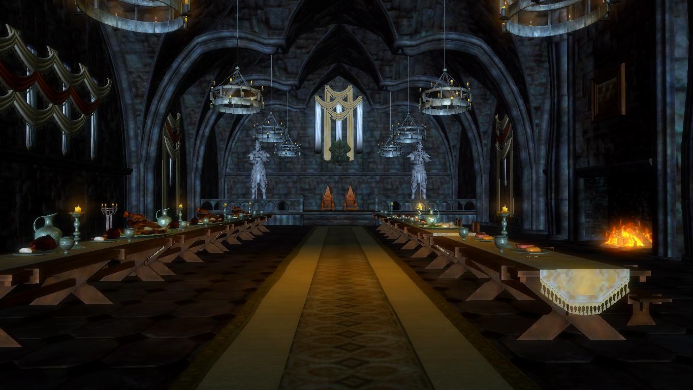- огромный обеденный зал с рыцарской атрибутикой и на возвышении 2 трона