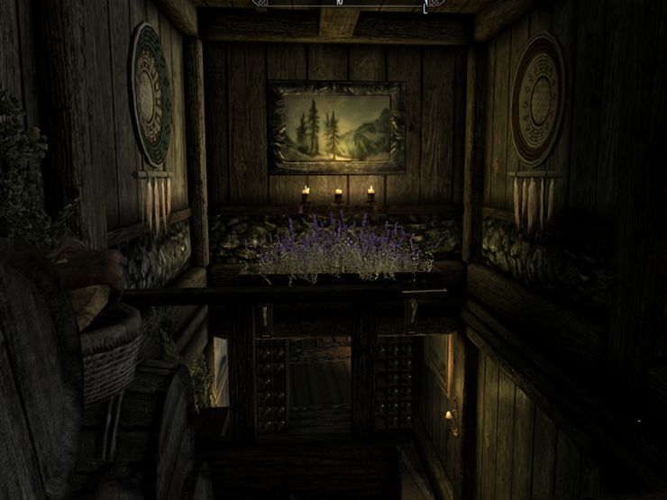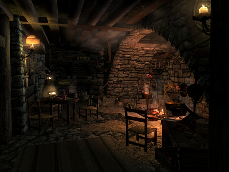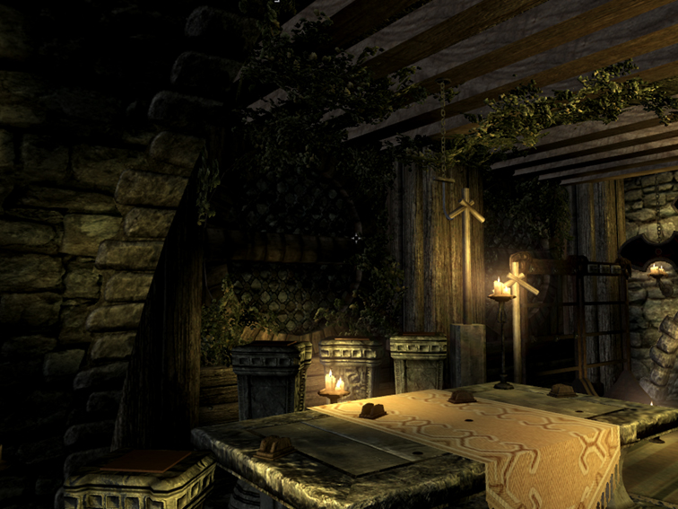 В отличии от первой версии в доме появился погреб с хранилищем фактически для всего: маски, когти, свитки, артефакты даэдра, черные и не только книги, редкие вещи типа банок насекомых, вплоть до зажаренной ногы/головы быка и головы гленморильской ведьмы. Короче сами увидите, список активаторов для редких вещей артефактов – большой! Сами активаторы можно найти и в подвале, и в погребе, и в самом коттедже.