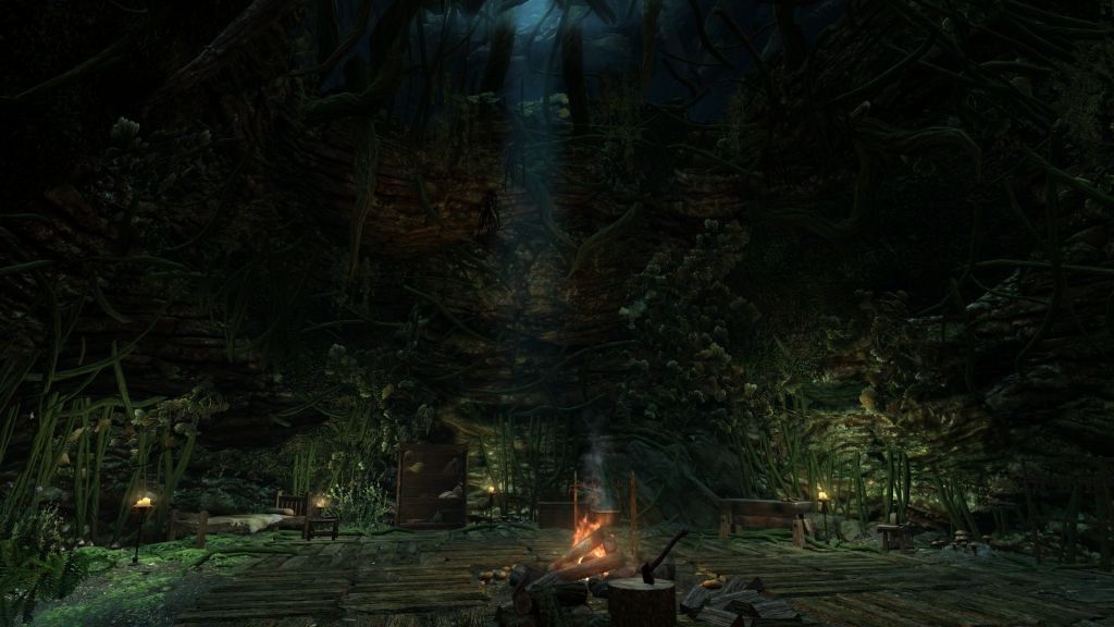 * Сокрытый пнем дерева, с протоптанной дорожкой, покоится маленький домик для игрока с основными удобствами.