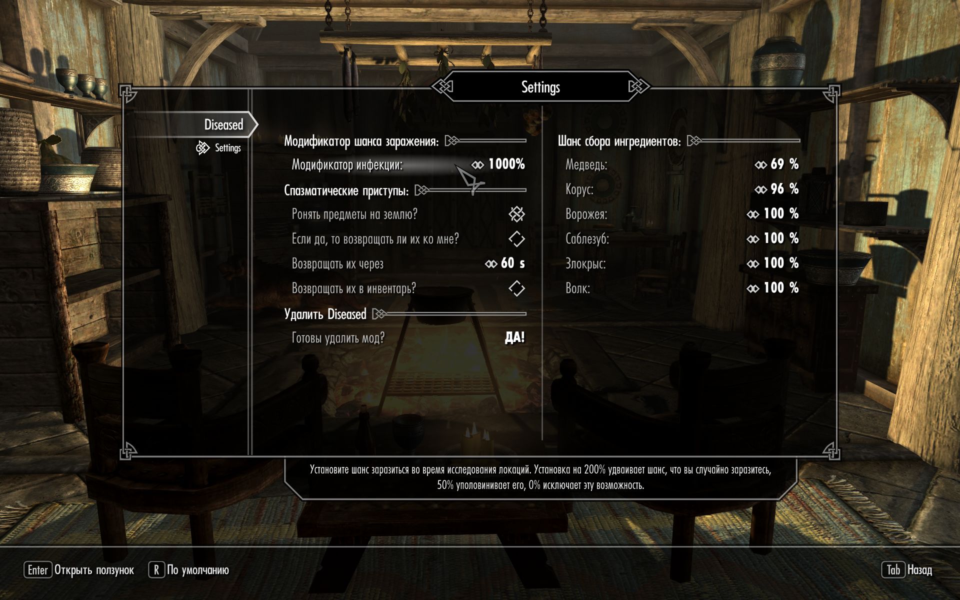 - Мод хорошо работает вместе с Realistic Needs and Diseases. Ставьте Diseased после RND и убедитесь, что в момент загрузки игры вы ничем не больны (имеющиеся болезни нужно вылечить средствами RND).
