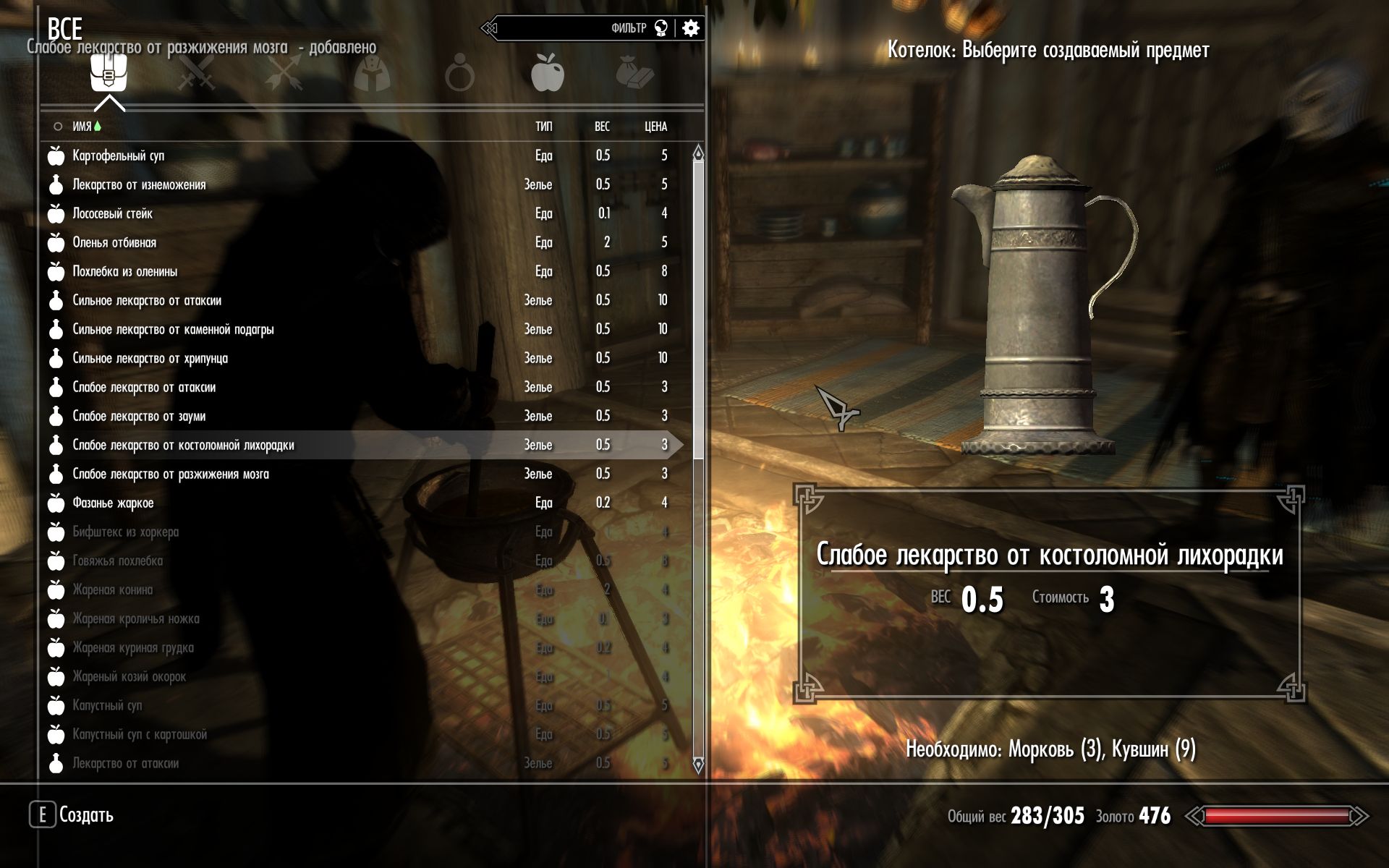 б) Алхимия: Изначально игроку неизвестно, чем он заболел. Шанс распознать болезнь зависит от уровня алхимии и от того, какие книги по медицине герой прочитал. Для каждой болезни есть специальное зелье, которое стоит меньше, чем обычное зелье исцеления болезней. Игрок может приготовить их из добавляемых модом ингредиентов. Специальные алхимические зелья исцеления болезней по-прежнему эффективны, но они помогают пройти только одну проверку во время кризиса. Обычное зелье исцеления болезней повышает сопротивляемость болезням до следующей проверки.
