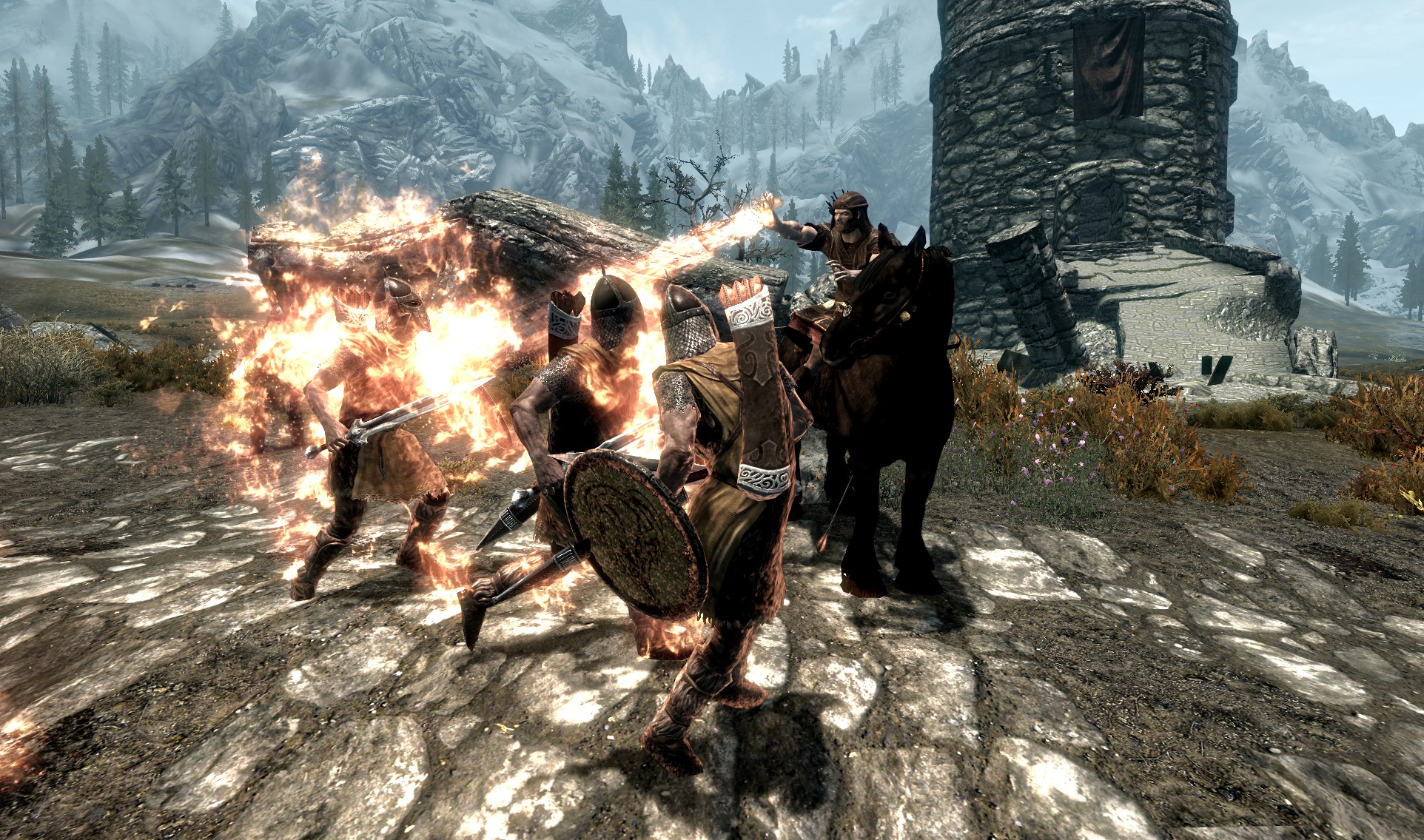 Вы находите раздражающим, что ваш персонаж спокойно сражается боевым топором верхом на лошади, но не может использовать ни одного заклинания? Теперь вы можете бросать шаровые молнии или призвать свой даэдрический боевой топор прямо во время верховой езды, обгоняя вражеских магов и атакуя их с фланга. ВАЖНО: вы можете использовать заклинания ТОЛЬКО из правой руки.