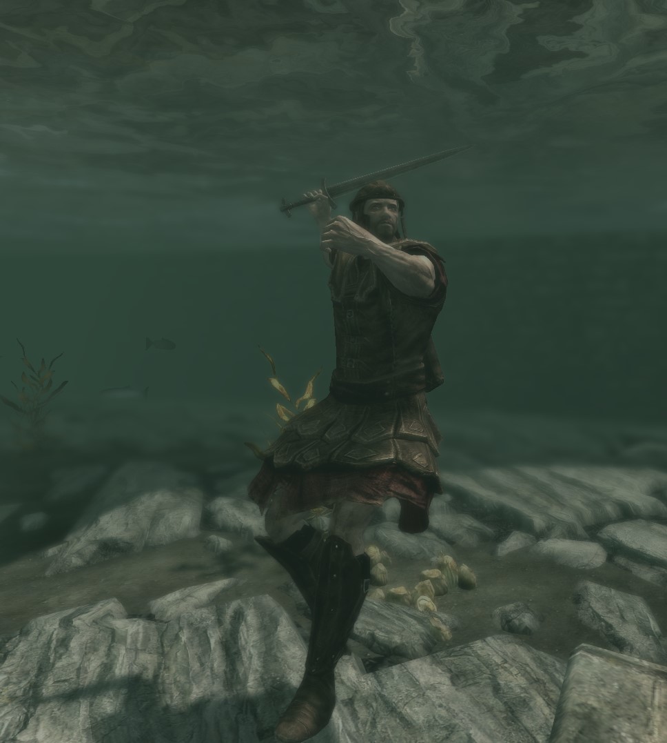 Устали от рыбы-убийцы, издевающейся над вашим героем? Или просто хотите порыбачить с кинжалом? С этим модом вы можете нырять с оружием/магией наготове и использовать их под водой (используйте клавишу активации скрытности, чтобы достать/убрать оружие под водой). Вы также можете блокировать и наносить удары плашмя. НЕЛЬЗЯ использовать: луки; арбалеты; факелы; ритуальные заклинания; атаки левой рукой.