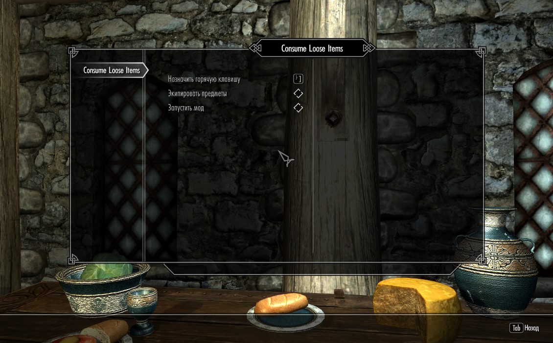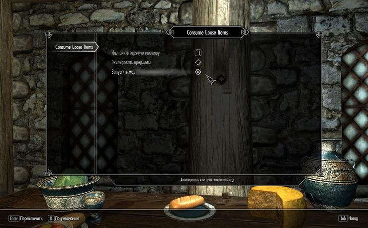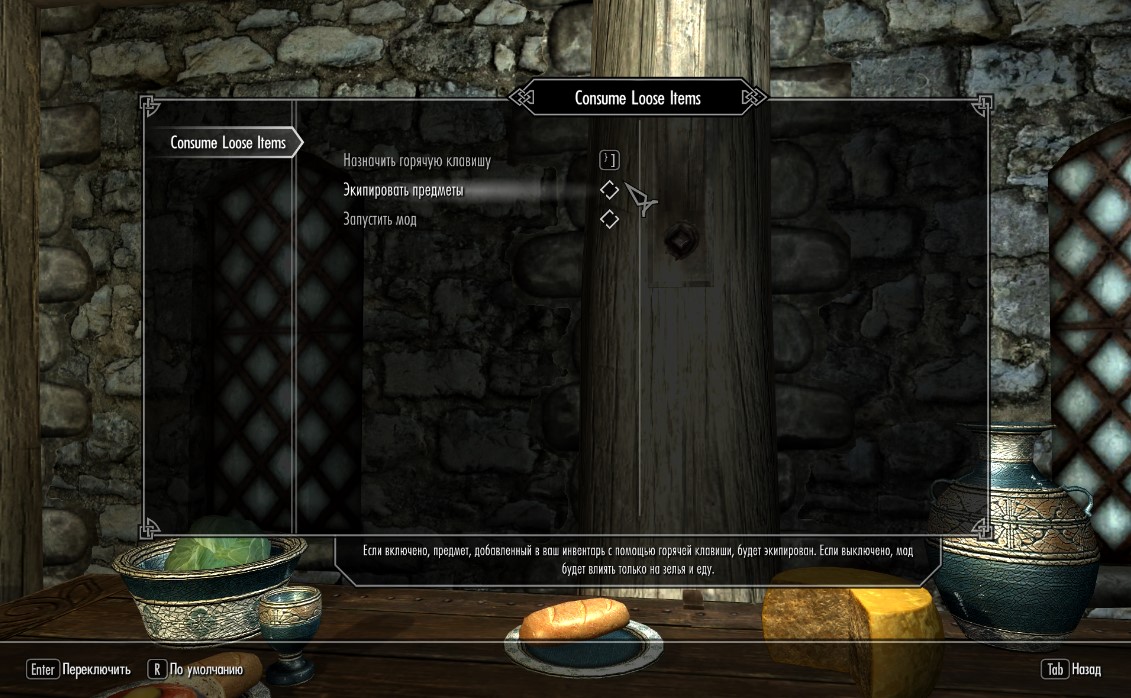 Мод добавляет горячую клавишу, которая позволяет вам употреблять лежащие в мире зелья, еду и ингредиенты. Используйте горячую клавишу вместо клавиши активации, чтобы автоматически употребить или экипировать предмет из мира.