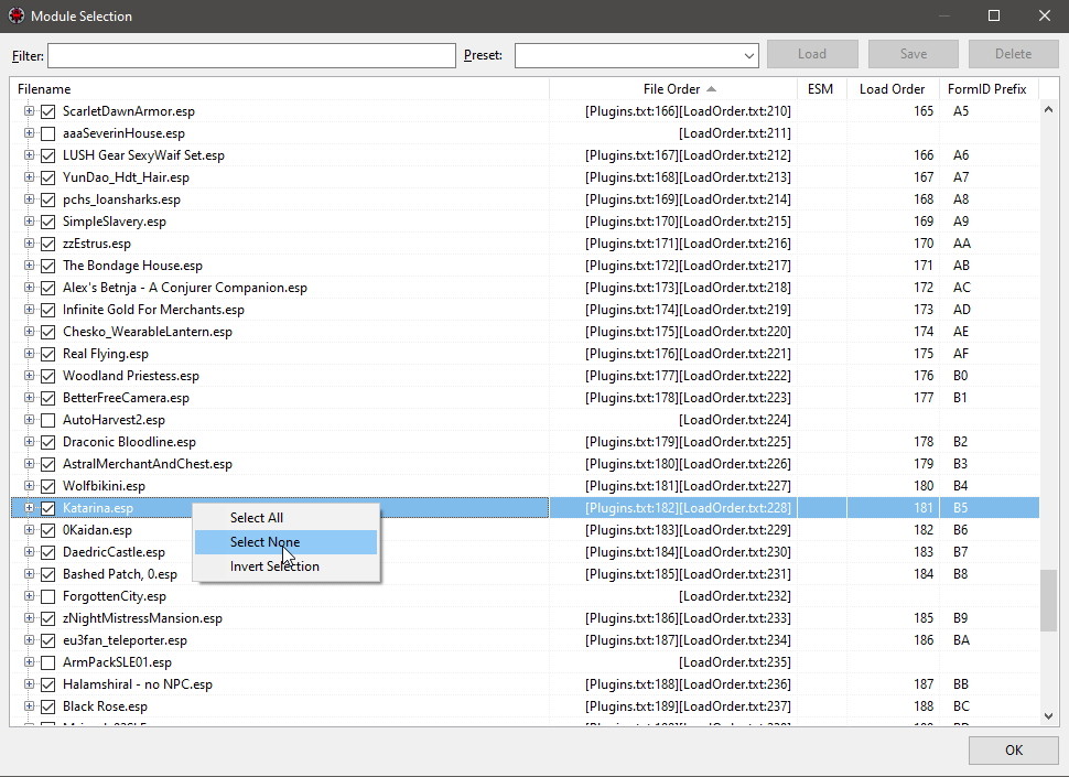 *В открывшемся окне нажать ПКМ на любом моде и выбрать "Select Non". Со всех модов будут сняты галки.