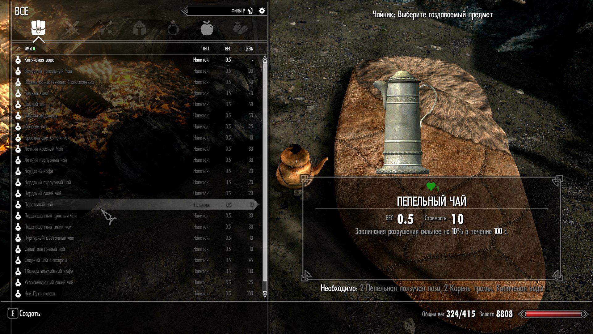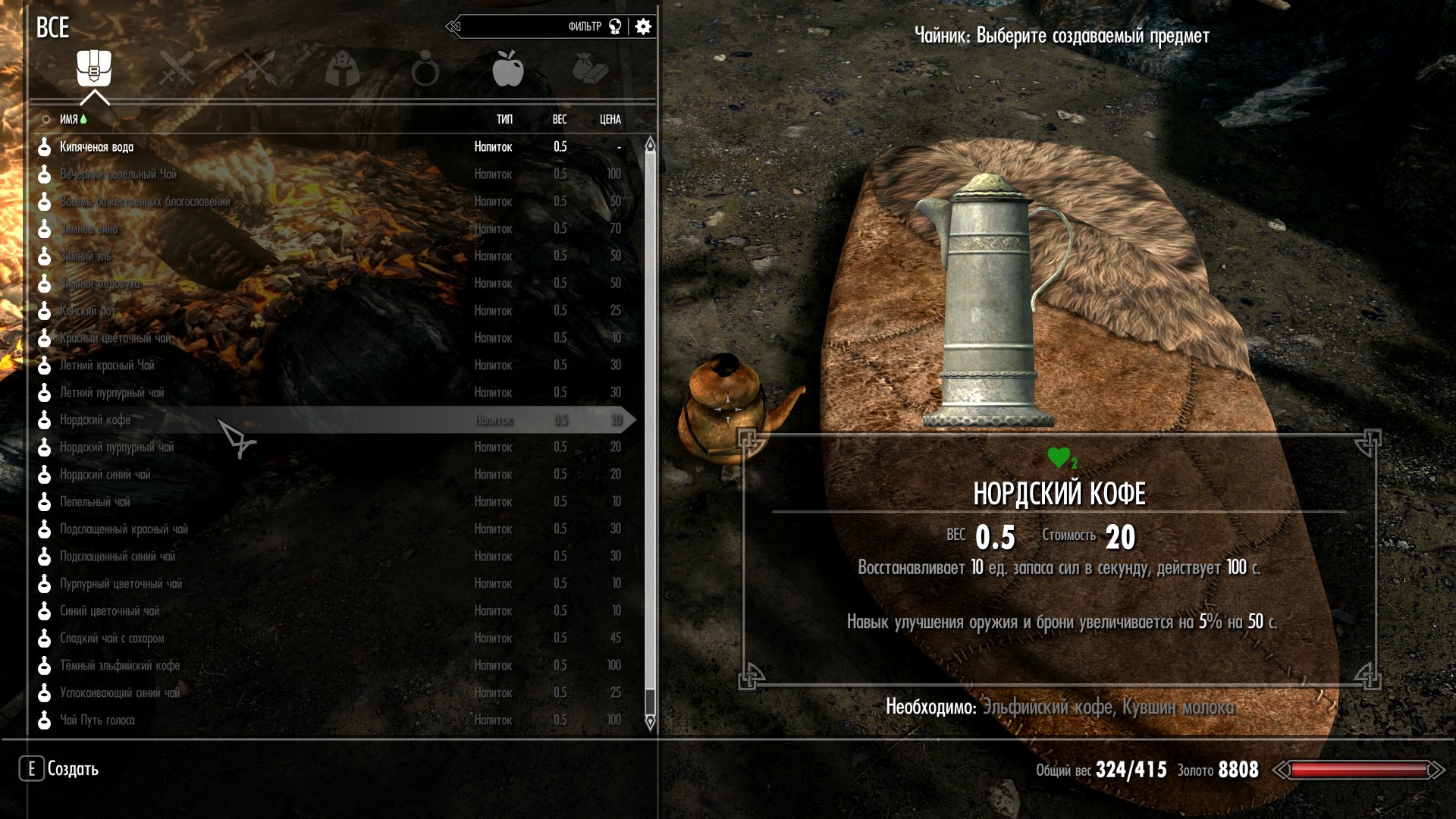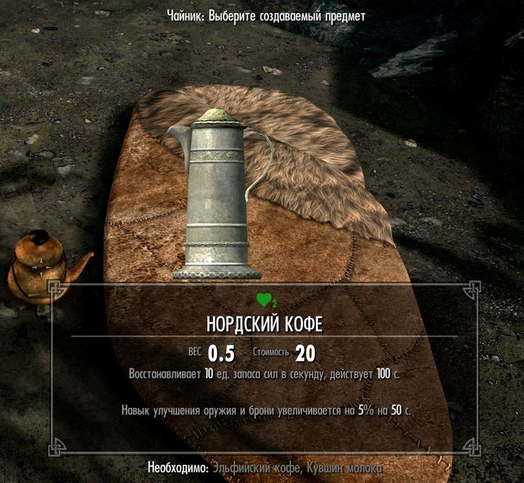 Для приготовления напитков нужен чайник, который можно создать в кузнице из старого ржавого чайника (можно купить у торговцев, таких как Белетор, или найти в разных ящиках или бочках) и двух слитков корунда.