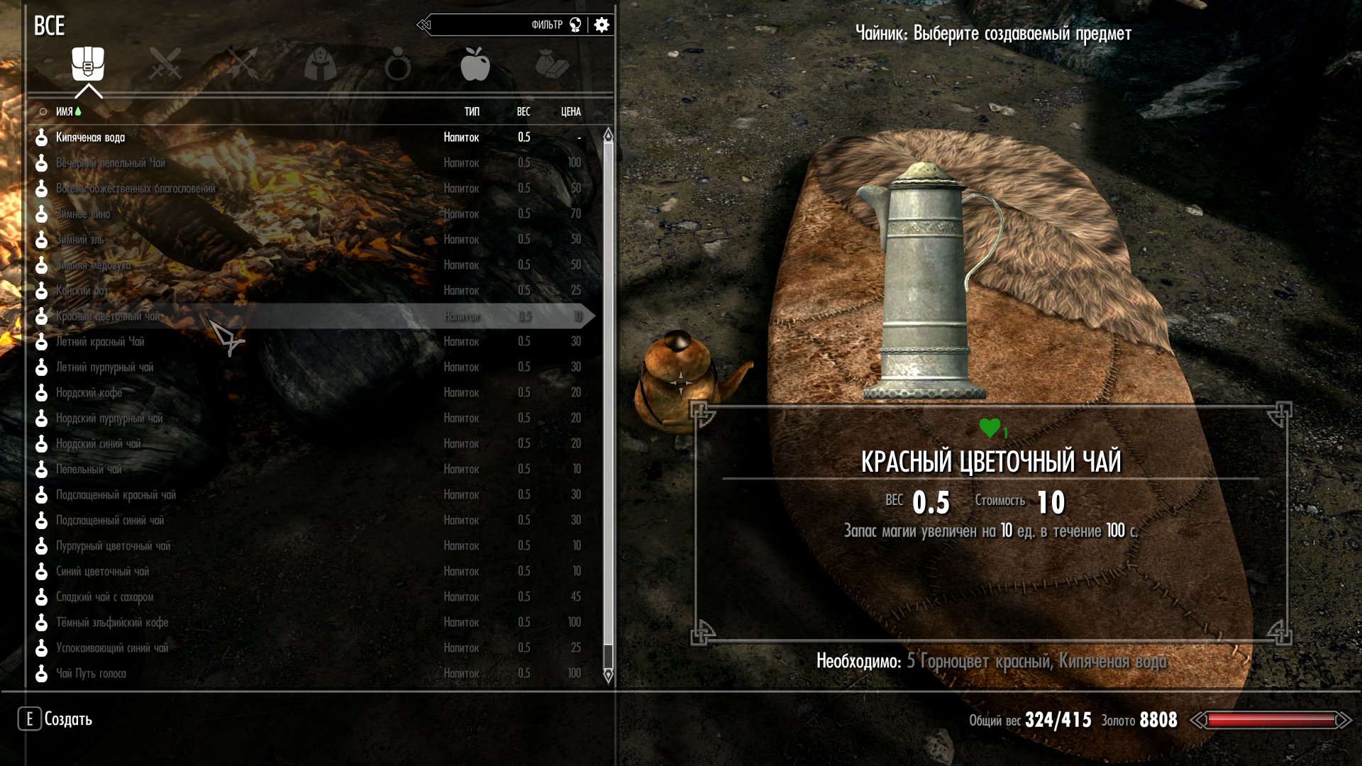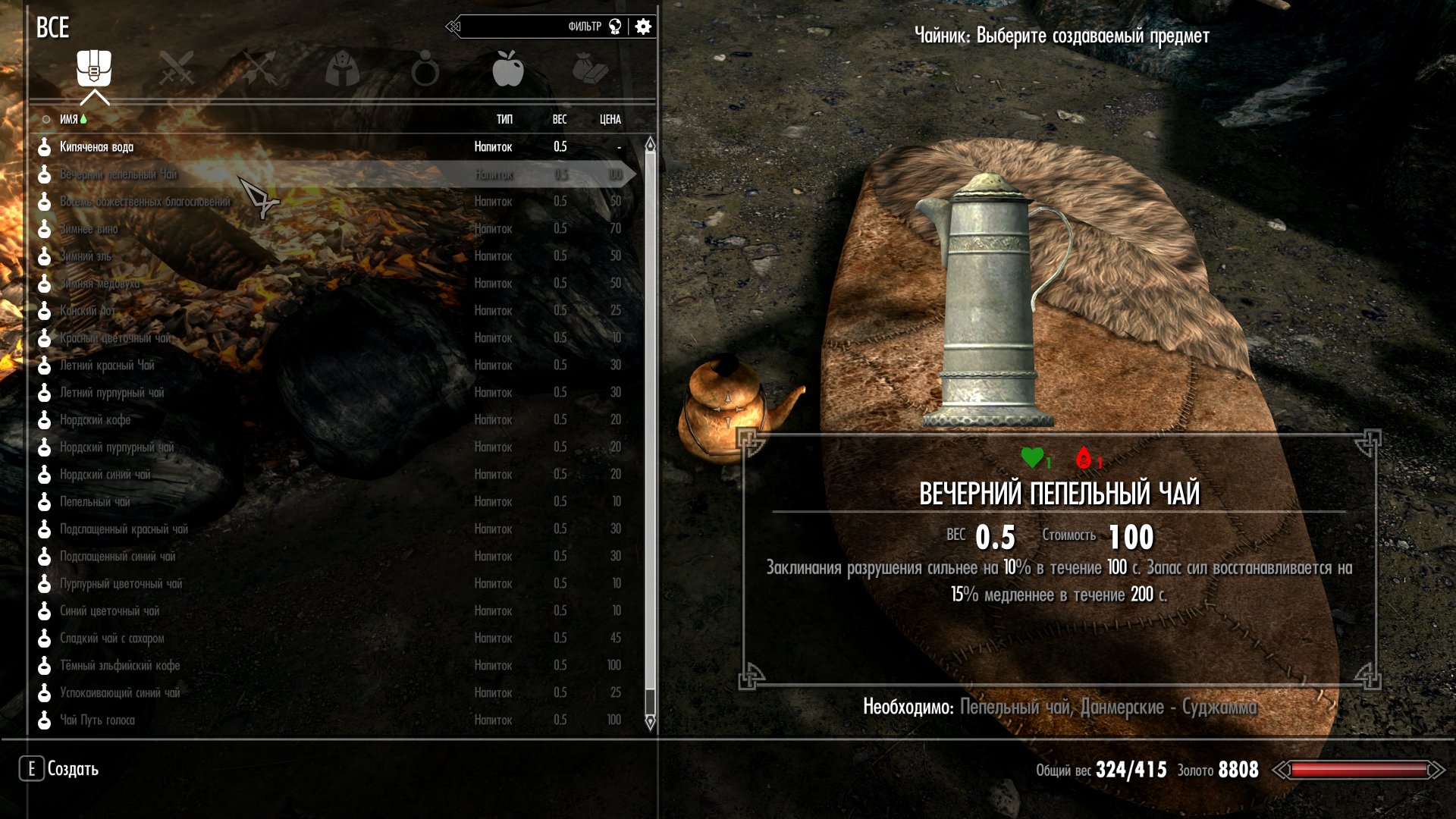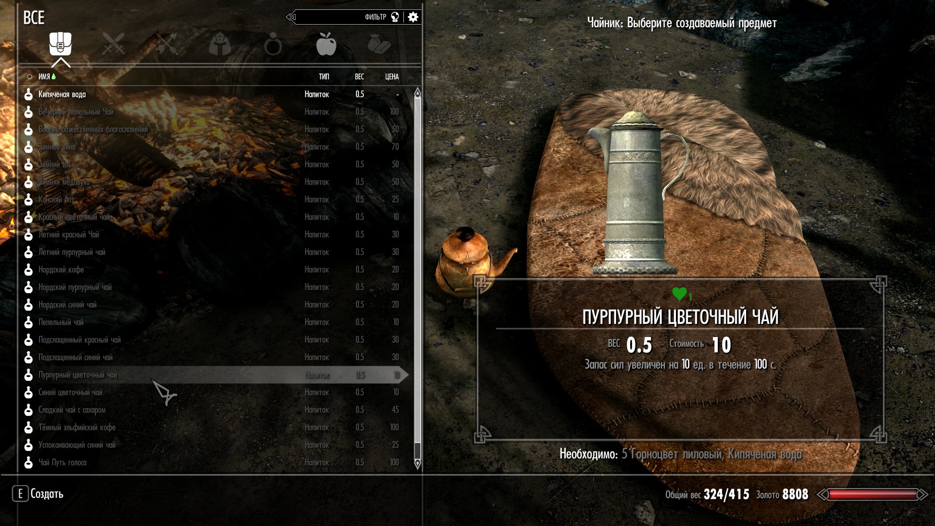 Для приготовления напитков нужен чайник, который можно создать в кузнице из старого ржавого чайника (можно купить у торговцев, таких как Белетор, или найти в разных ящиках или бочках) и двух слитков корунда.