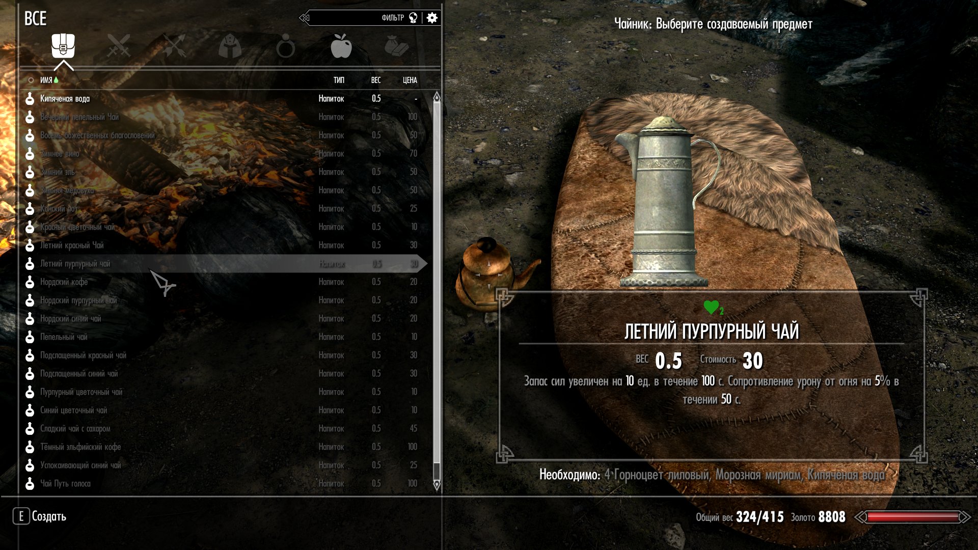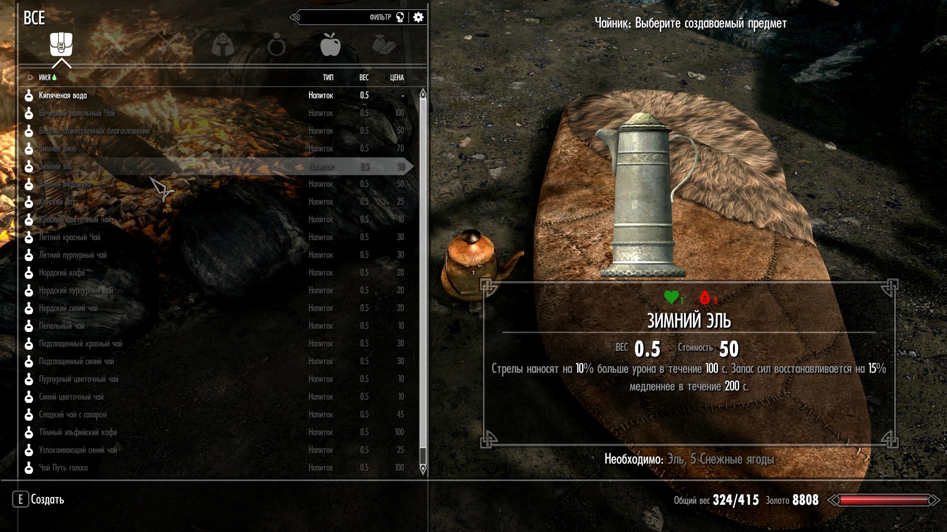 Все напитки можно приготовить или купить у торговцев.