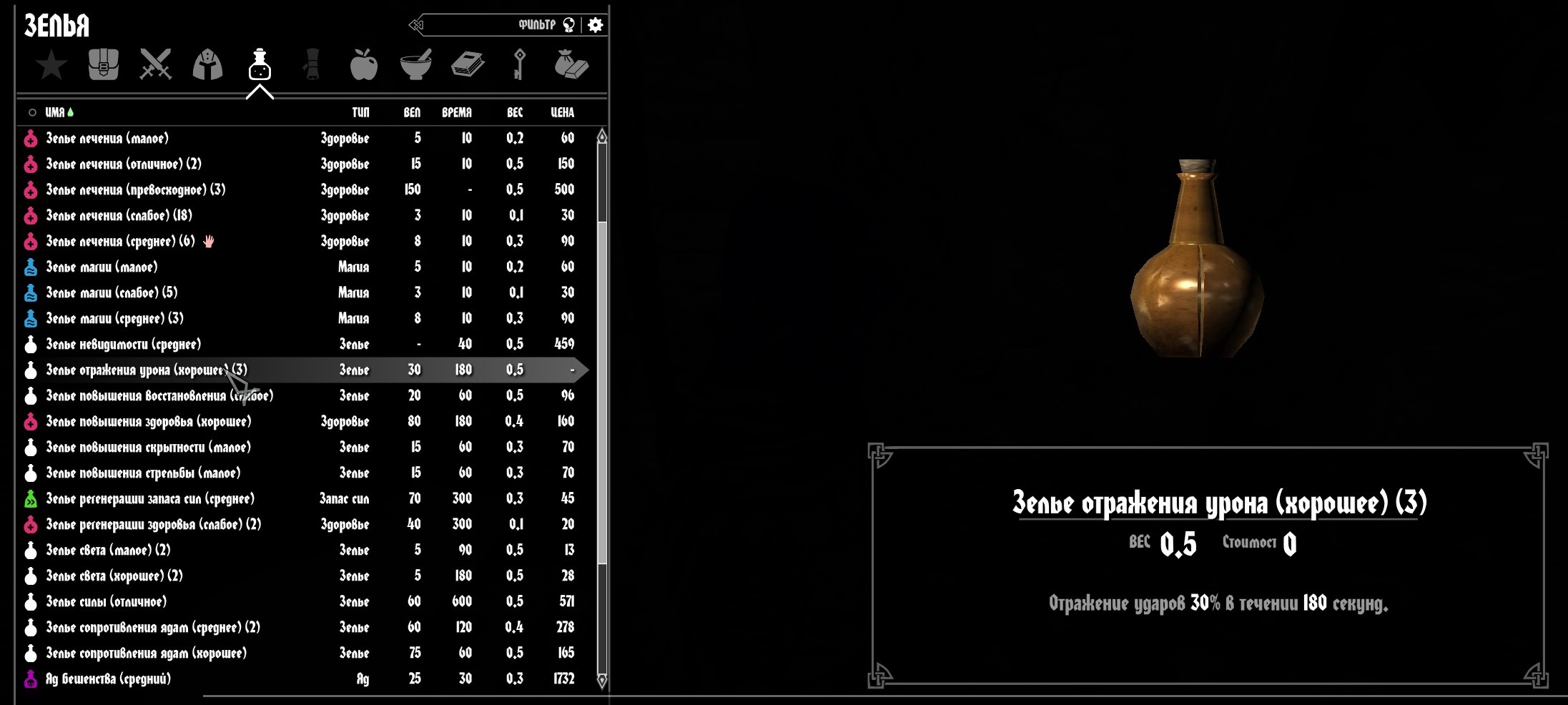 - Зелье отражение урона - отражает часть физического урона обратно в атакующего (4 вида качества).