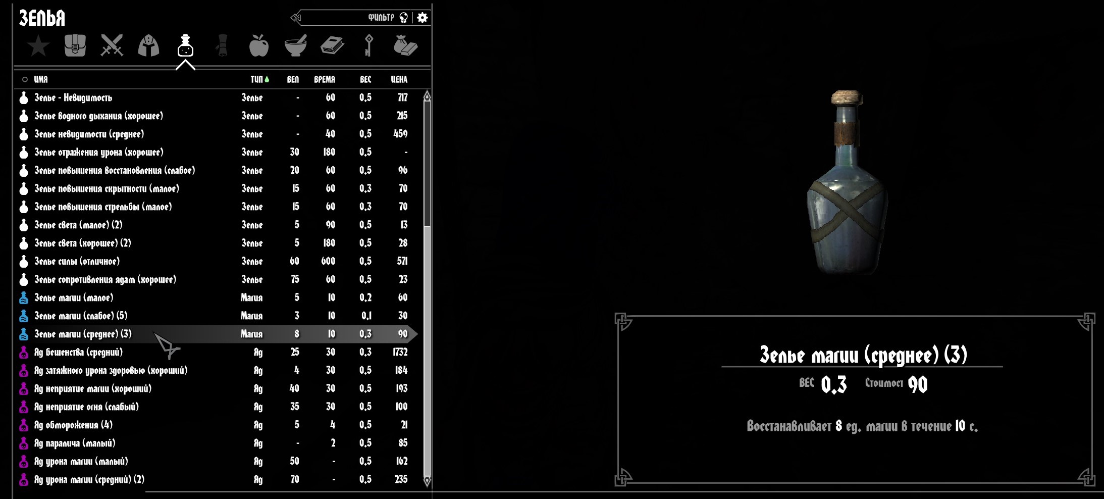 - Переименовывает названия всех зелий и ядов для более удобной сортировки и поиска от слабого к наилучшему.