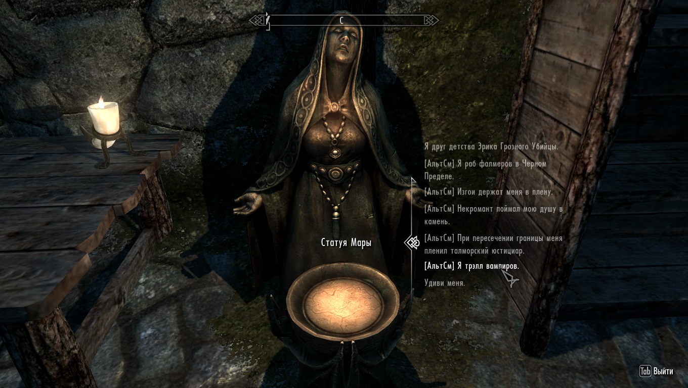 - Нет конфликта с Dragonborn's Apocrypha. Как только у вас начнётся кровотечение, мир будет затемнён и вас вышвырнут (поведение из vanilla). Предполагаю, что любой другой мод, использующий «событие кровотечения», стоящий перед «АльтСм», всегда потребует как минимум ещё один удар по вам, чтобы сработало его собственное затемнение.