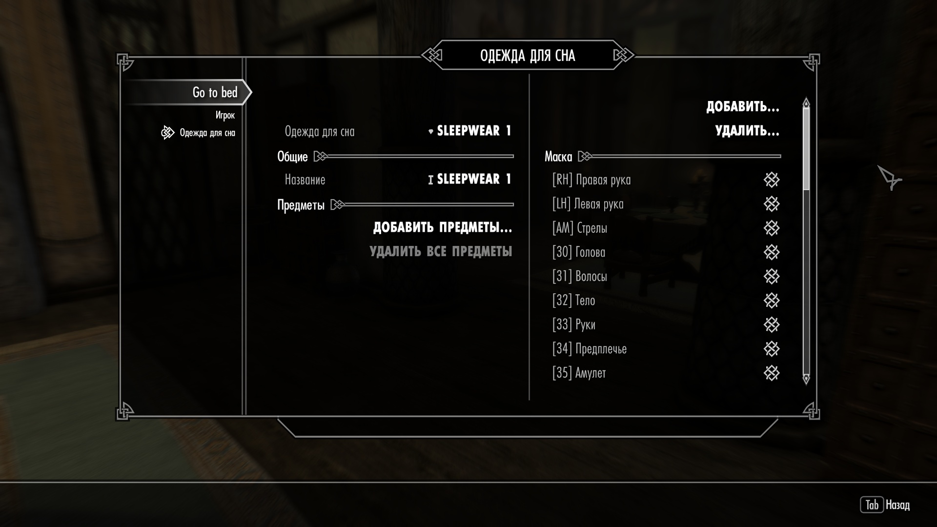 Также мод добавляет МСМ меню, в котором можно выбрать пижаму - одежду, которую будет надевать персонаж игрока для сна. Сначала создайте новый комплект для пижамы, если его еще нет, после этого вы сможете назначить комплект пижамы персонажу игрока. НИПы тоже будут использовать пижаму, если она у них есть.