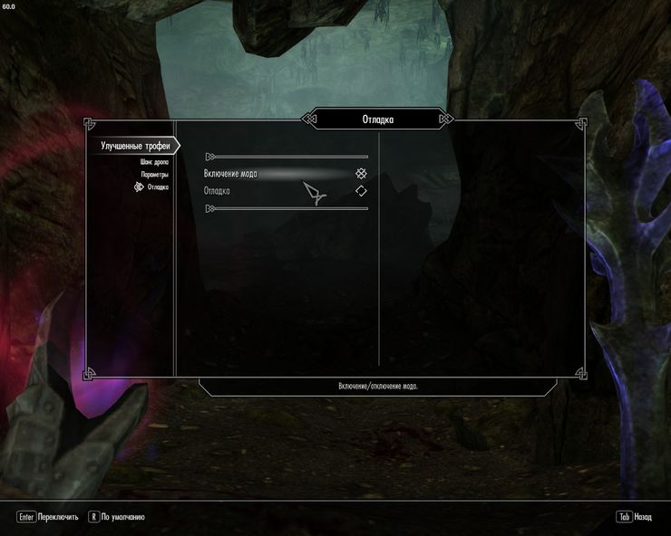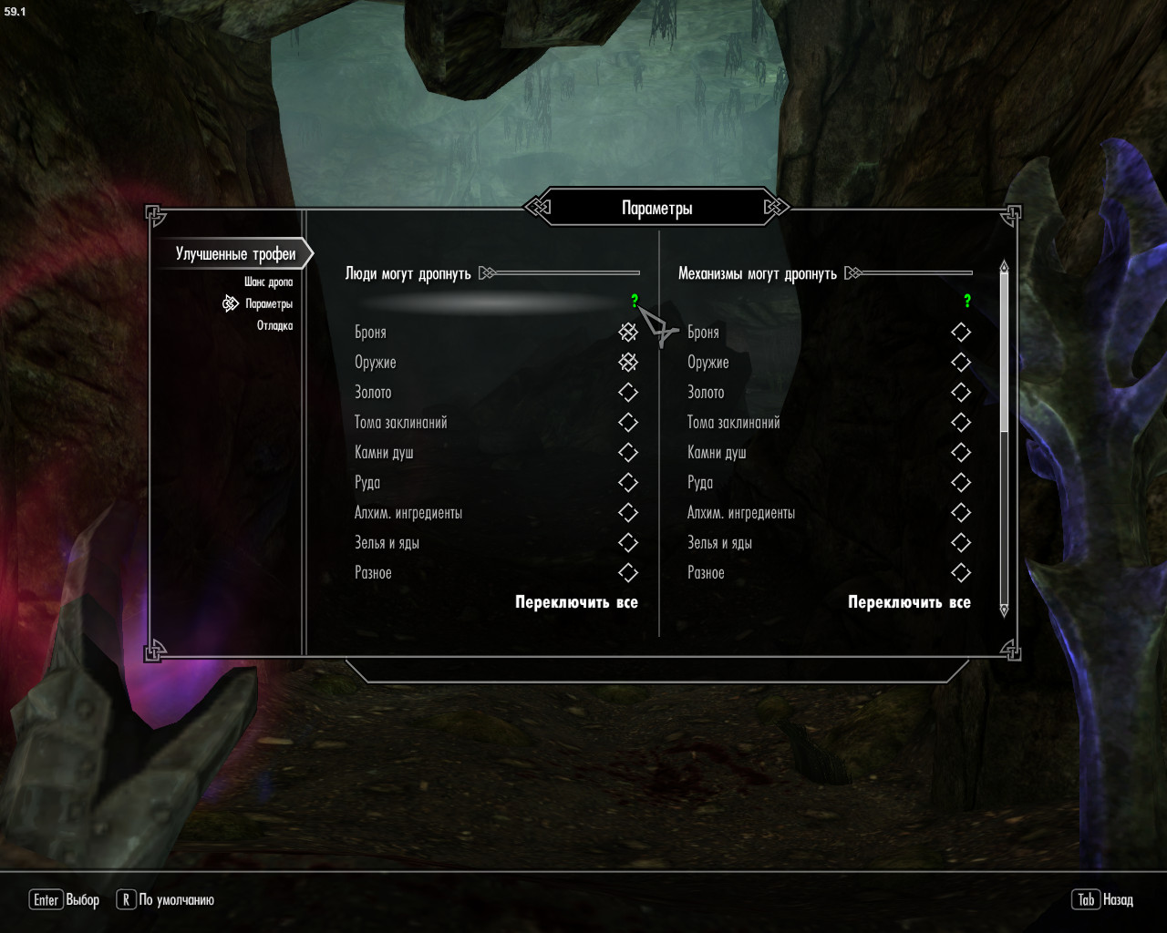 Вкладка «Параметры» позволяет настроить каждому типу врагов шанс выпадения каждого типа добычи. На данный момент вы можете включить либо отключить любой из пунктов для гуманоидов, животных, двемерских механизмов и монстров.