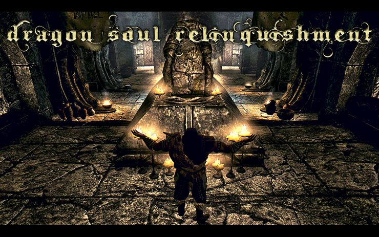Позволяет жертвовать души драконов, чтобы улучшить возможности персонажа. Мод разработан для поздней игры, когда все Крики уже открыты, а драконьи души стали бесполезным грузом, однако его можно использовать и на ранних стадиях. Отправляйтесь в Высокий Хротгар и отыщите драконий камень. Чтобы взаимодействовать с камнем, вы должны быть признаны Довакином Седобородыми и пройти их испытание (вернуть рог Юргена Призывателя Ветра и выучить последнее слово Безжалостной Силы). Затем вы сможете начать медитацию у камня, и провести с помощью специального меню церемонию жертвования любого количества драконьих душ для получения следующих бонусов: восстановление Крика (уменьшает время между Криками), сила Крика (увеличивает урон от огненного и морозного дыхания), очки способностей (добавляет очки способностей), увеличение урона без оружия, переносимого веса и атрибутов (здоровье/магия/запас сил). Каждый бонус имеет собственную цену, величину прироста и максимальный предел.