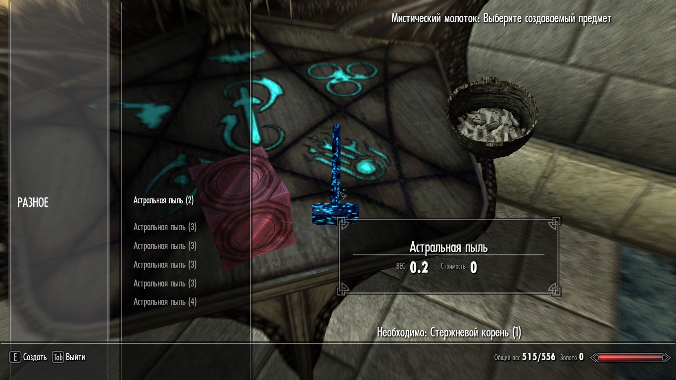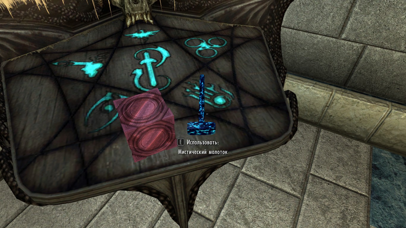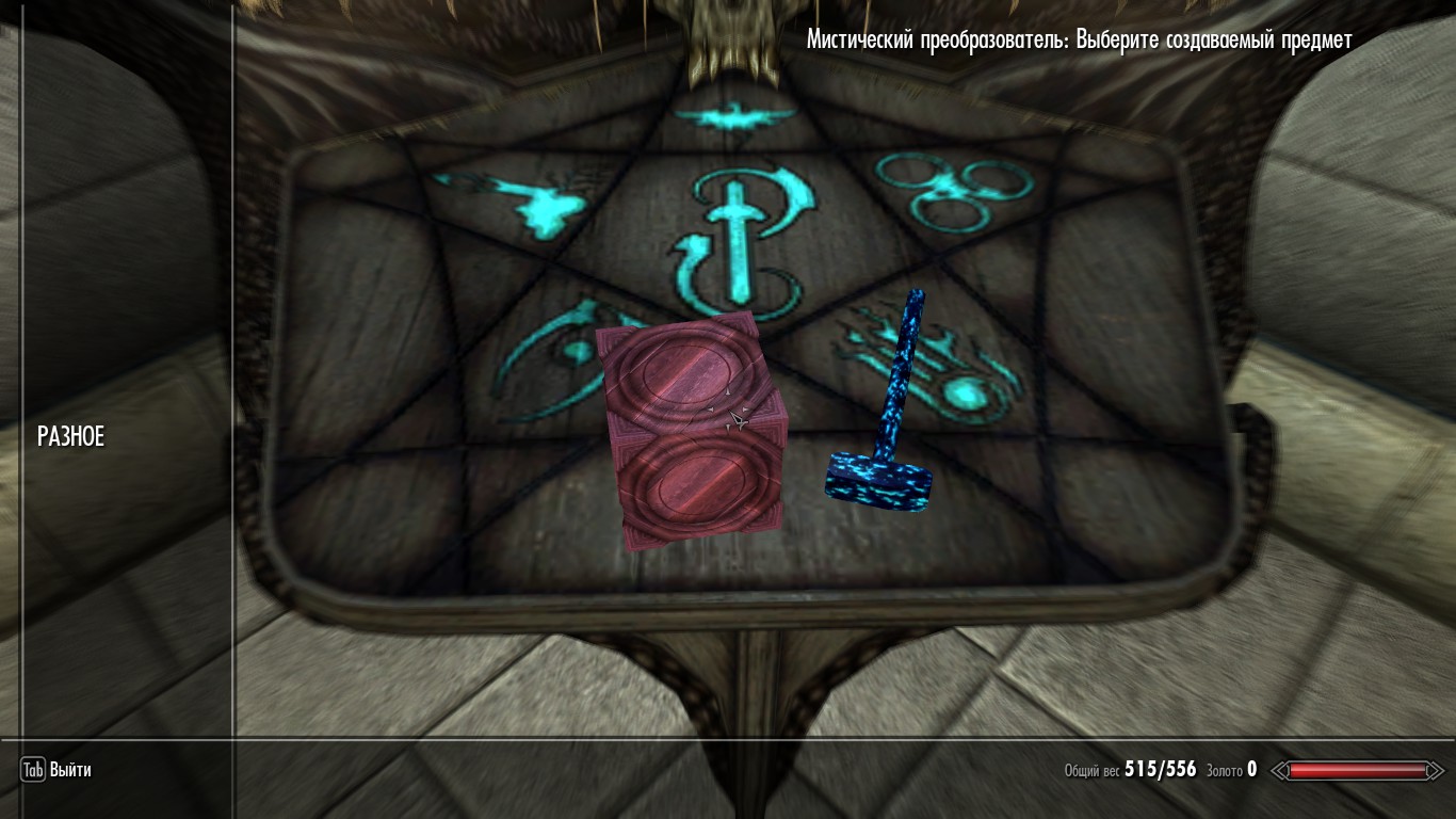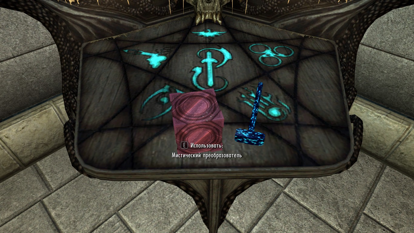 Во-первых, добавьте Мистический преобразователь и Мистический молоток в ваш дом. Наберите в консоли команду player.placeatme XX000D62 для Мистического преобразователя и player.placeatme XX001DAO для Мистического молоточка (ХХ - номер порядка загрузки этого мода, можно узнать через WryeBash). Два предмета упадут где-нибудь рядом с вами. Поднимите их и положите, где вам будет удобно.