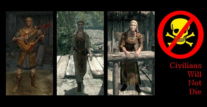 Маленький, но полезный плагин для любителей глобальных вар-модов, таких как WarInSkyrim, DeadlyDragons или MonsterWars. Вы наверняка сталкивались с проблемами массовой гибели мирных жителей во время нападений мобов. Данный мод добавляет условное бессмертие мирным горожанам, при котором игрок может нанести им ущерб или убить, а все остальные (драконы, звери, бандиты, компаньоны) - нет. Кроме того, не смотря на условное бессмертие, мирные жители будут ценить свою жизнь и по возможности спасаться бегством при возникшей опасности. Это описание актуально для текущей версии мода (v0.8).