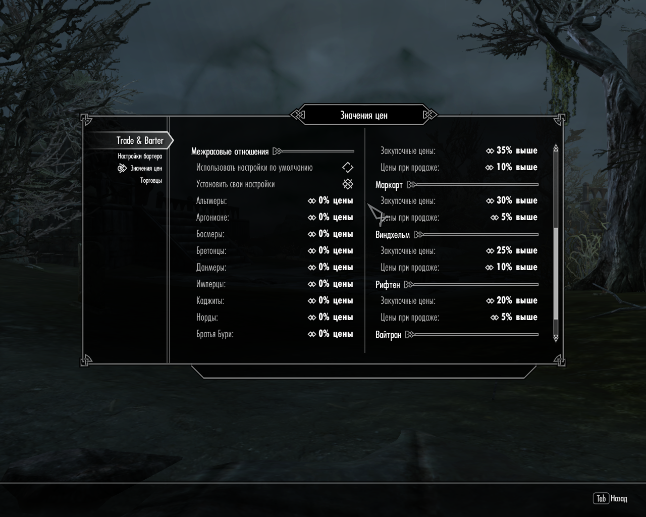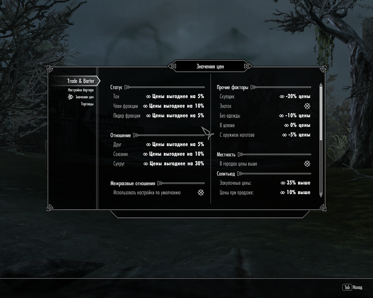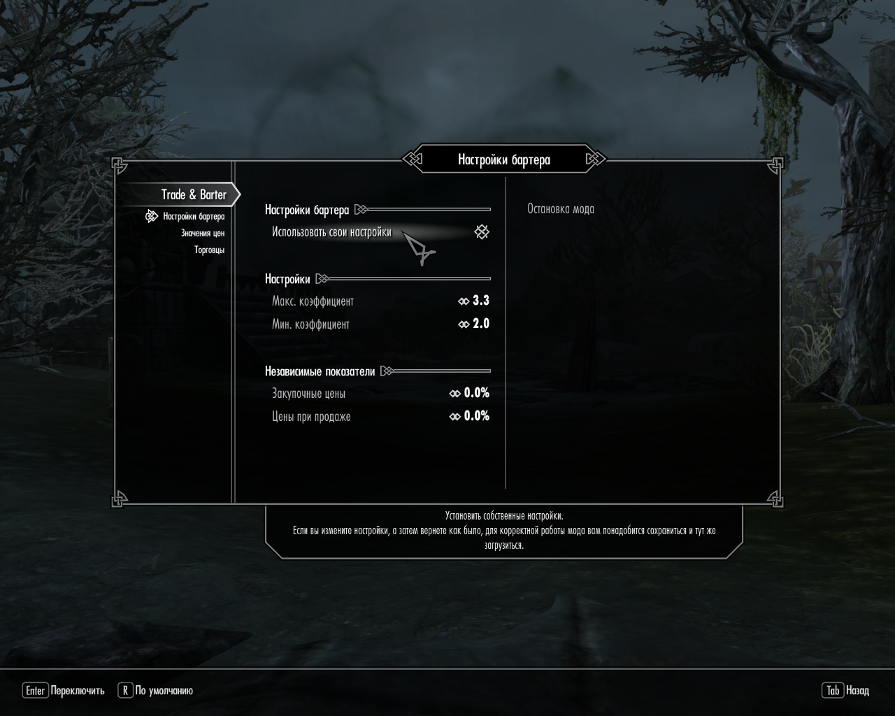 Trade & Barter позволяет настроить максимальный и минимальный коэффициенты, напрямую влияющие на цены при покупке и продаже. Чем ниже коэффициент, тем выгоднее цены, и наоборот: чем выше коэффициент, тем сложнее будет торговать.