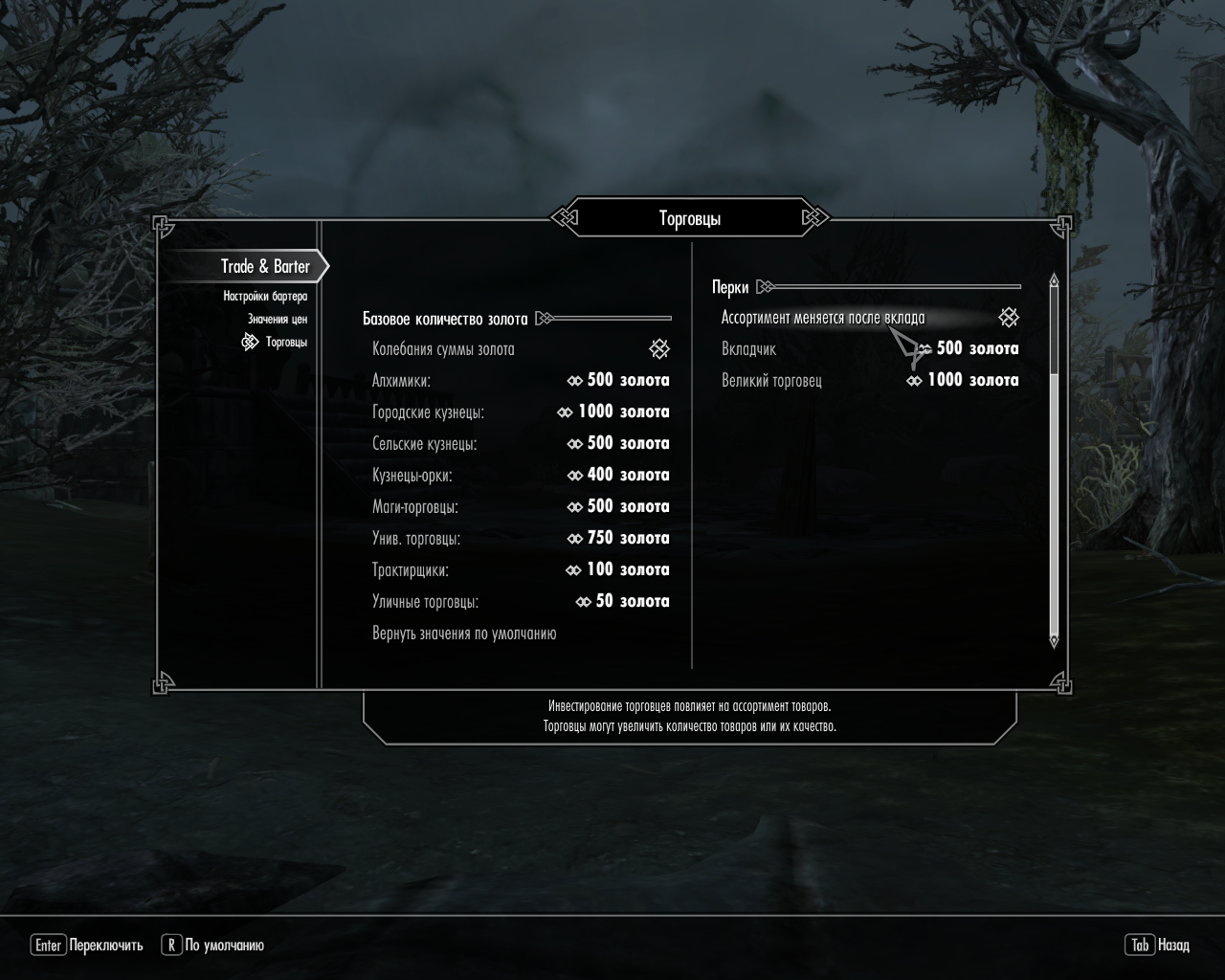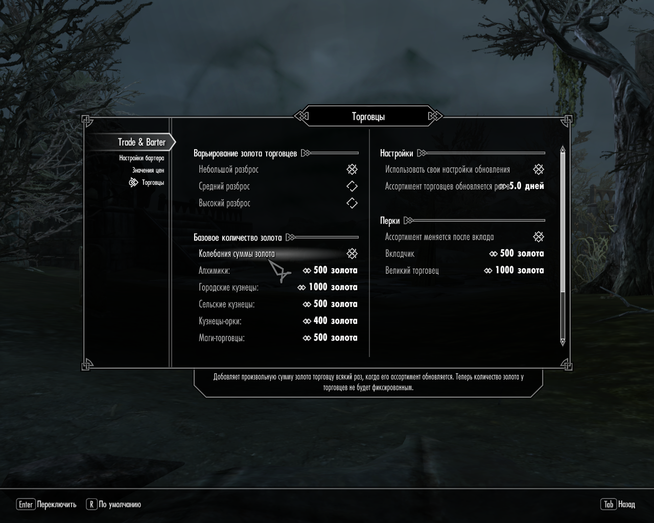 В Trade & Barter можно установить базовое количество золота у разных типов торговцев.