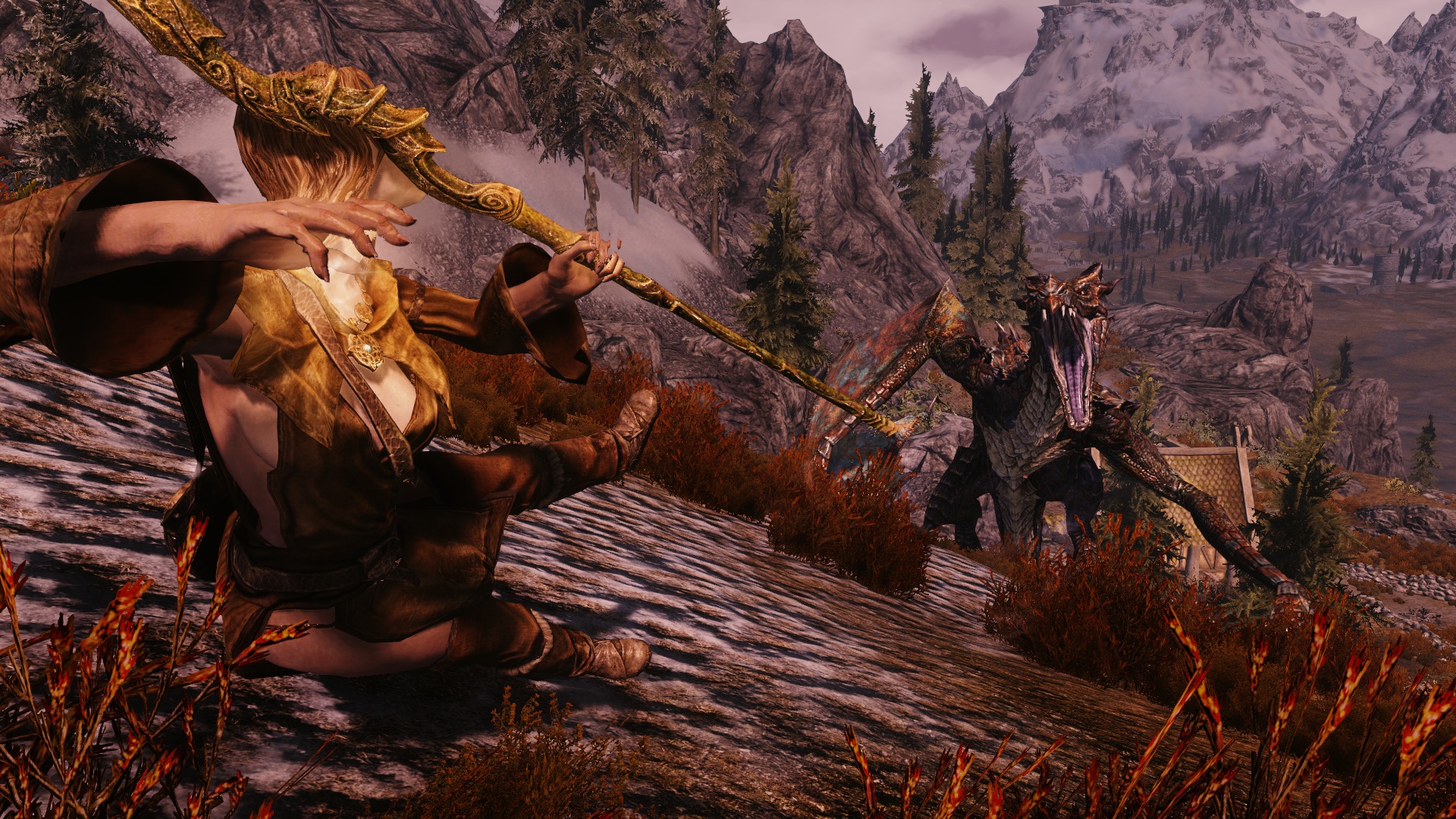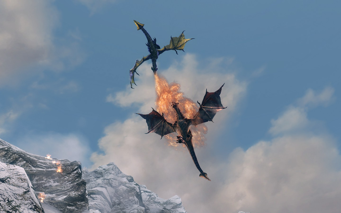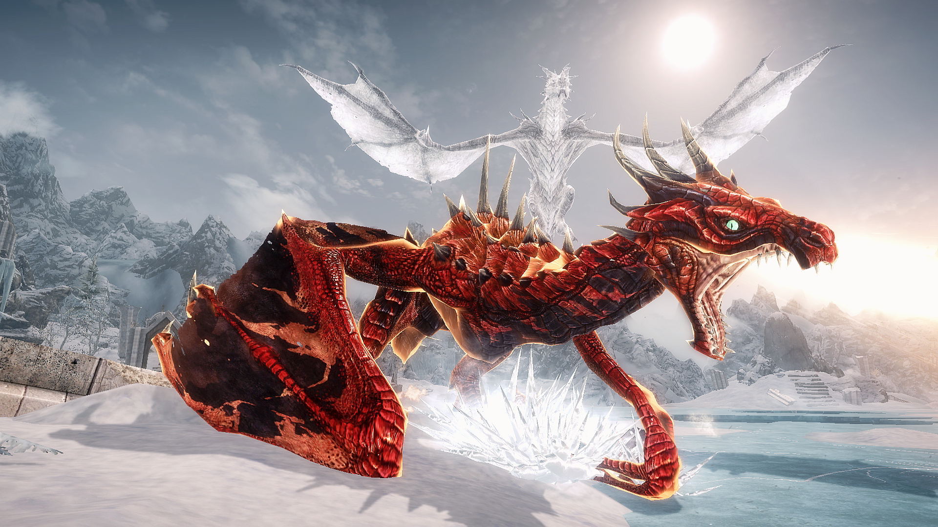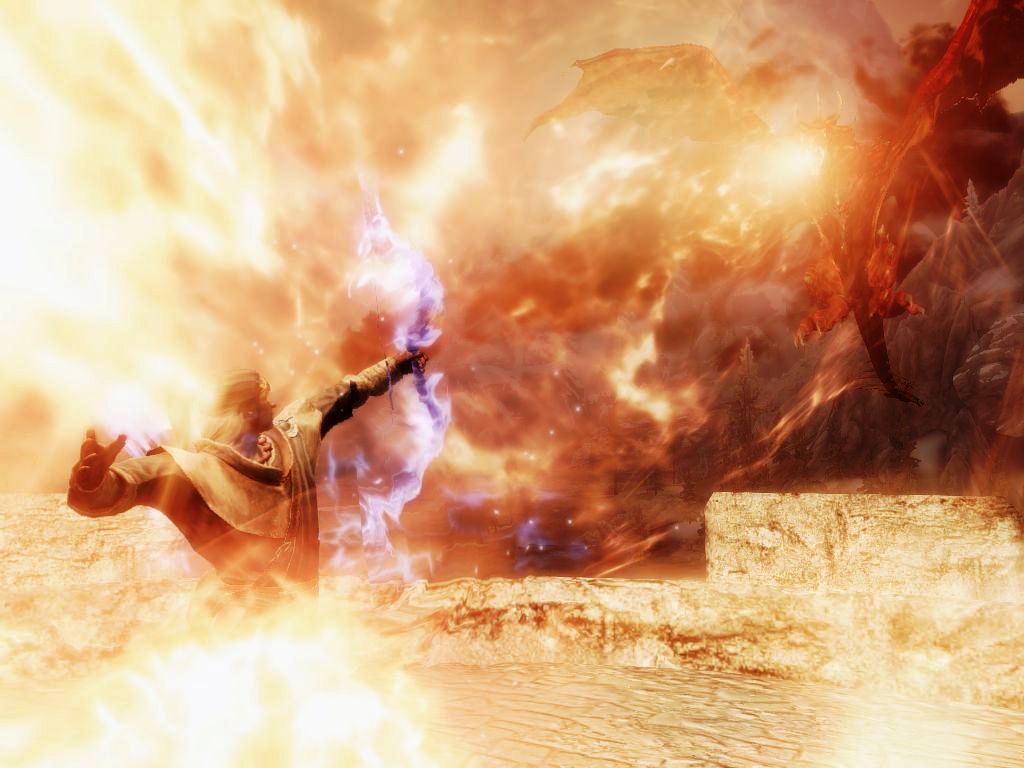 - Драконы имеют улучшенный AI относительно оригинальнального Скайрима. Есть два типа поведения = магический бой Дракона и поведение ближнего боя.