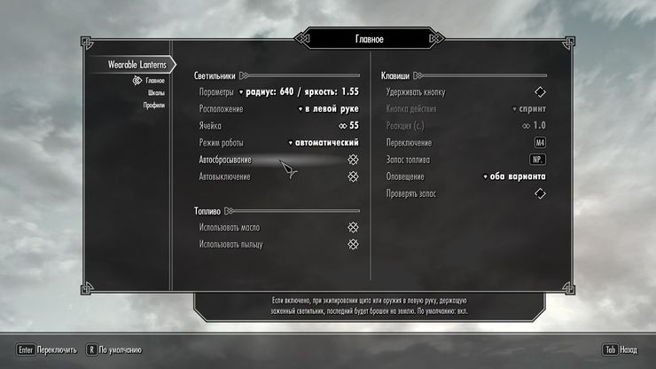 Кроме создания собственных светильников, а их два типа: фонарь и лампа, вы сможете их настроить в меню настроек модов. Кроме регулировки яркости свечения, по желанию вы сможете включить потребление ресурсов светильников, а также визуальное отображение этого процесса. Также доступен их автосброс и реагирование на время суток и местонахождение.