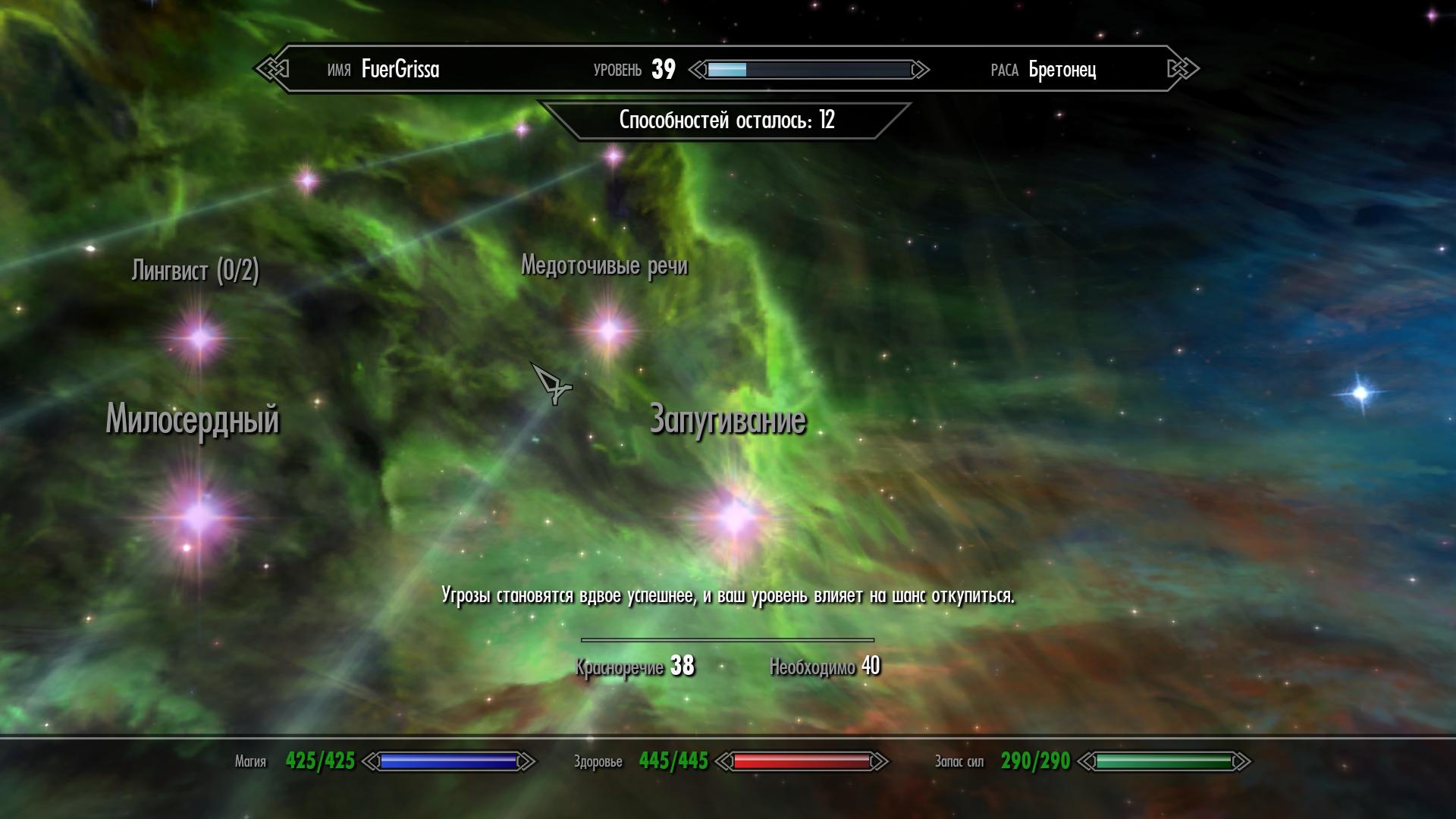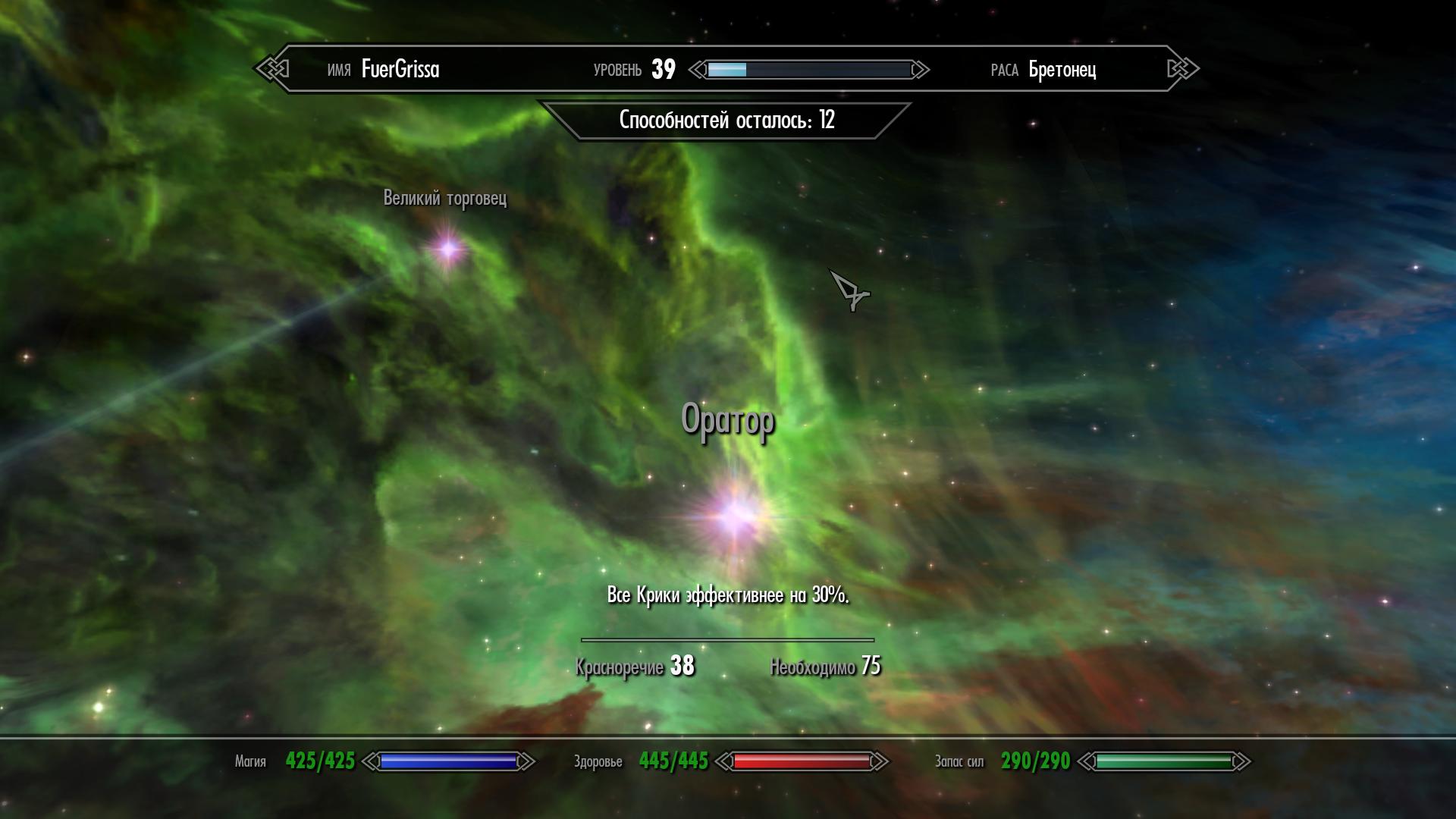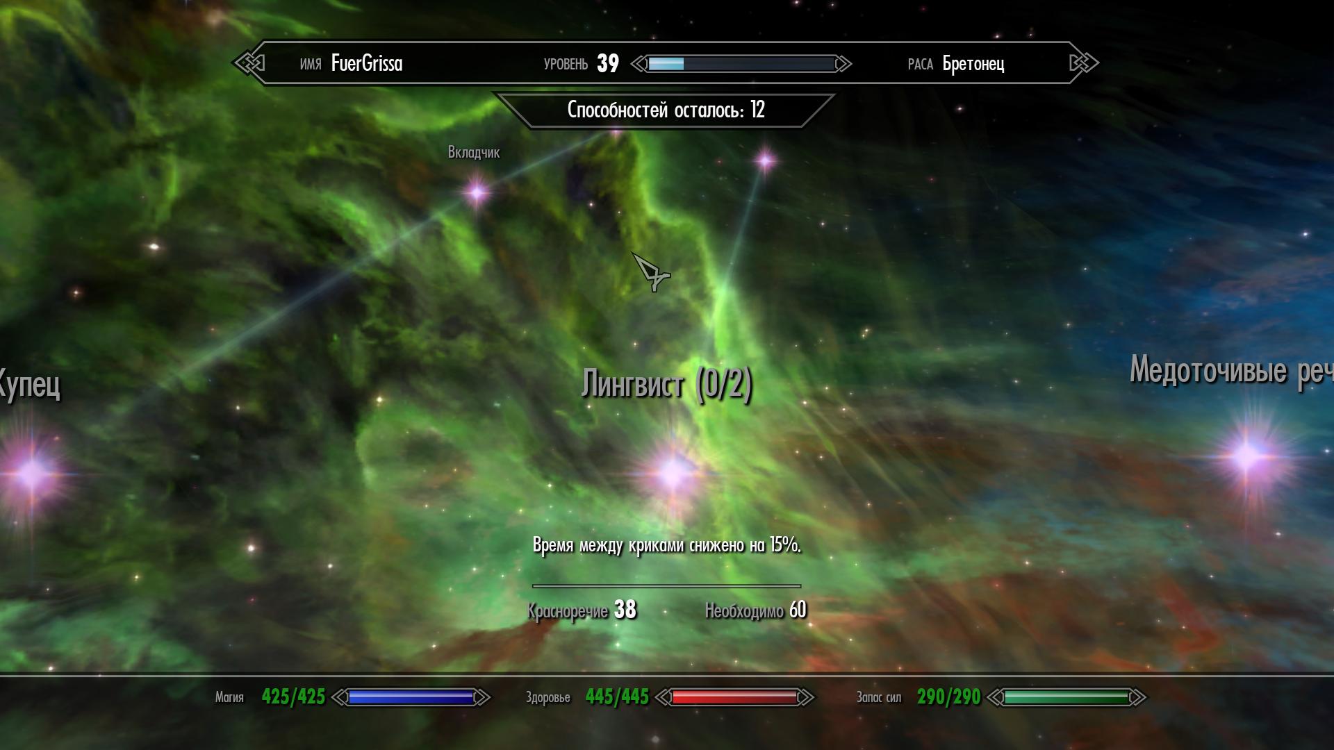 Лингвист (2 ранга) - сокращает время "перезарядки" Криков. Суммируется с амулетом и благословением Талоса.