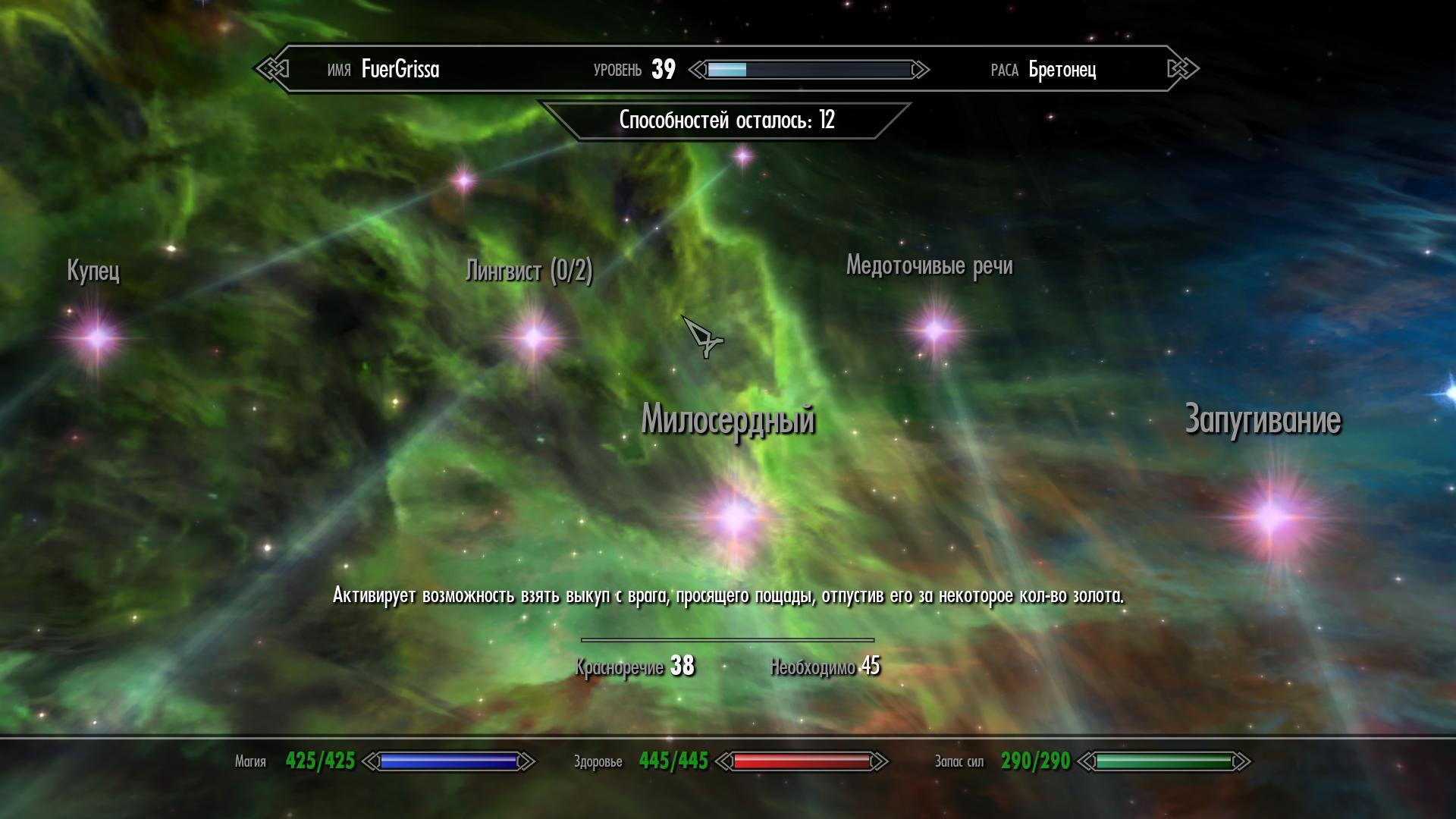 "Милосердный": когда противник, у которого осталось совсем мало здоровья, падает на колени и кричит "я сдаюсь!!!" вы можете "активировать" его (закрываться щитом, натягивать тетиву или "заряжать" заклинание не нужно), а затем с помощью появившегося меню пощадить его, забрав у него некоторую сумму золота. Пощадив врага, вы немного вылечите его (автоматически, никаких специальных заклинаний изучать не нужно). За это вы также получите опыт в навыке Красноречие.