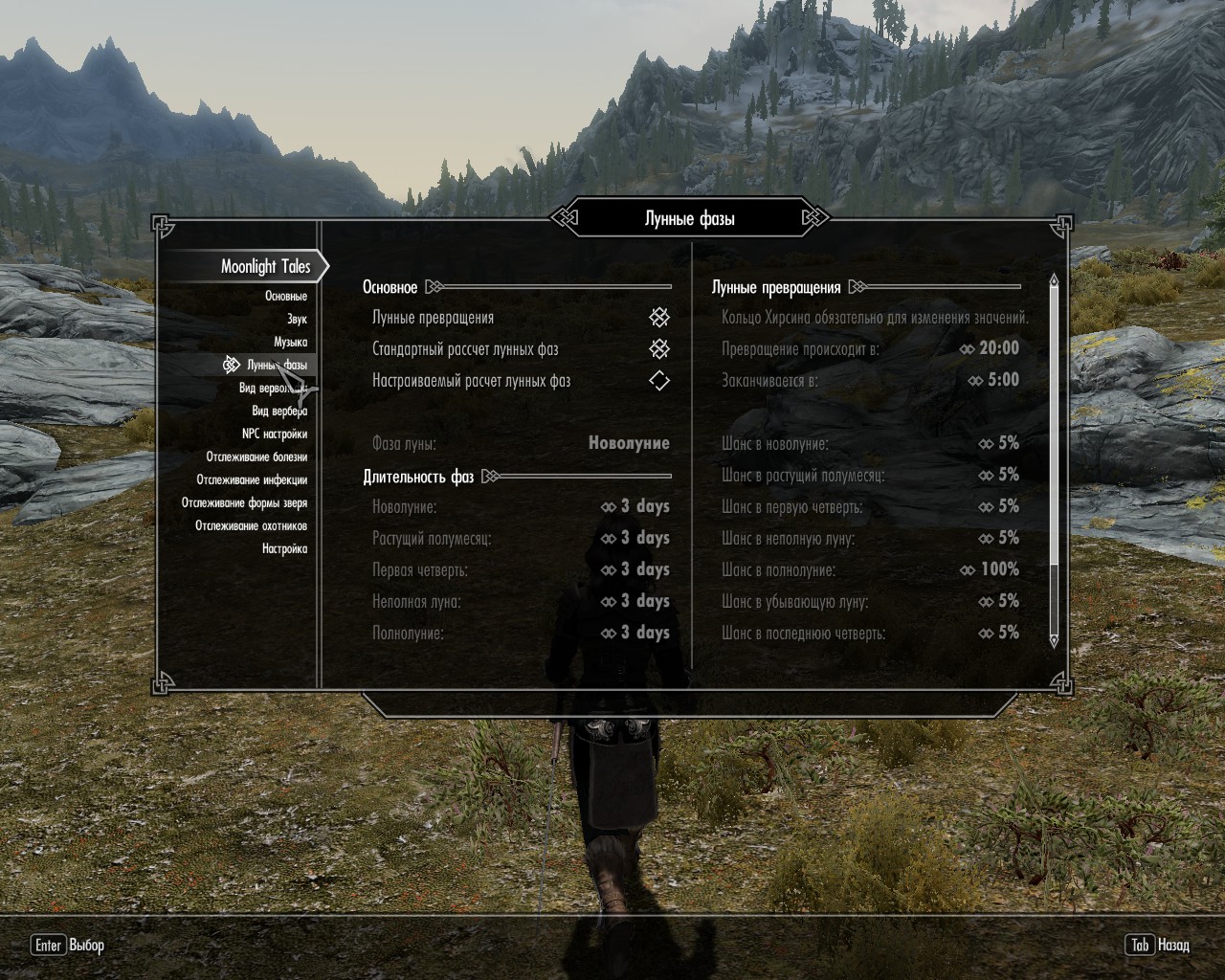 В Скайриме можно часто наблюдать прекрасные ночные пейзажи, которые, к сожалению, никак не были задействованы в игре даже, если игрок оборотень. В "Сказке Лунный свет" жизнь вервольфа и вербера будет связана с фазами луны. Если у игрока имеется "Кольцо Хирсина", то возможно контролировать внезапные превращения и настраивать их через меню MCM. Те, кто используют плагин "Tales of Lycantrophy" наверняка узнают экранные уведомления о фазах луны. Автор не хочет портить сюрприза, поэтому с некоторыми нововведениями вам предстоит познакомиться самим.