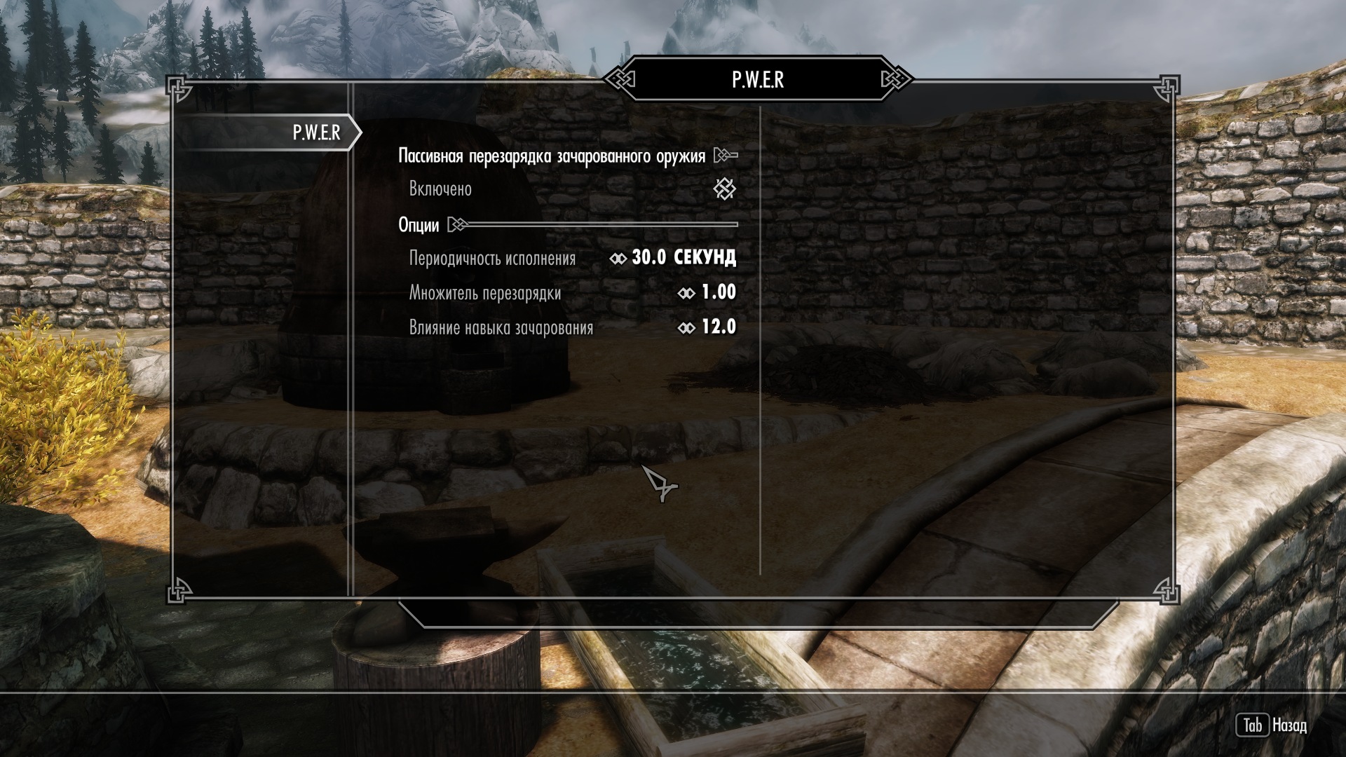 Мод добавляет пассивную перезарядку всего вашего зачарованного оружия. Скорость такой перезарядки будет зависеть от уровня вашего навыка зачарования. Мод имеет несколько настроек, которые вы сможете легко изменить при помощи МКМ-меню. Вы также сможете и дальше перезаряжать оружие при помощи камней душ.