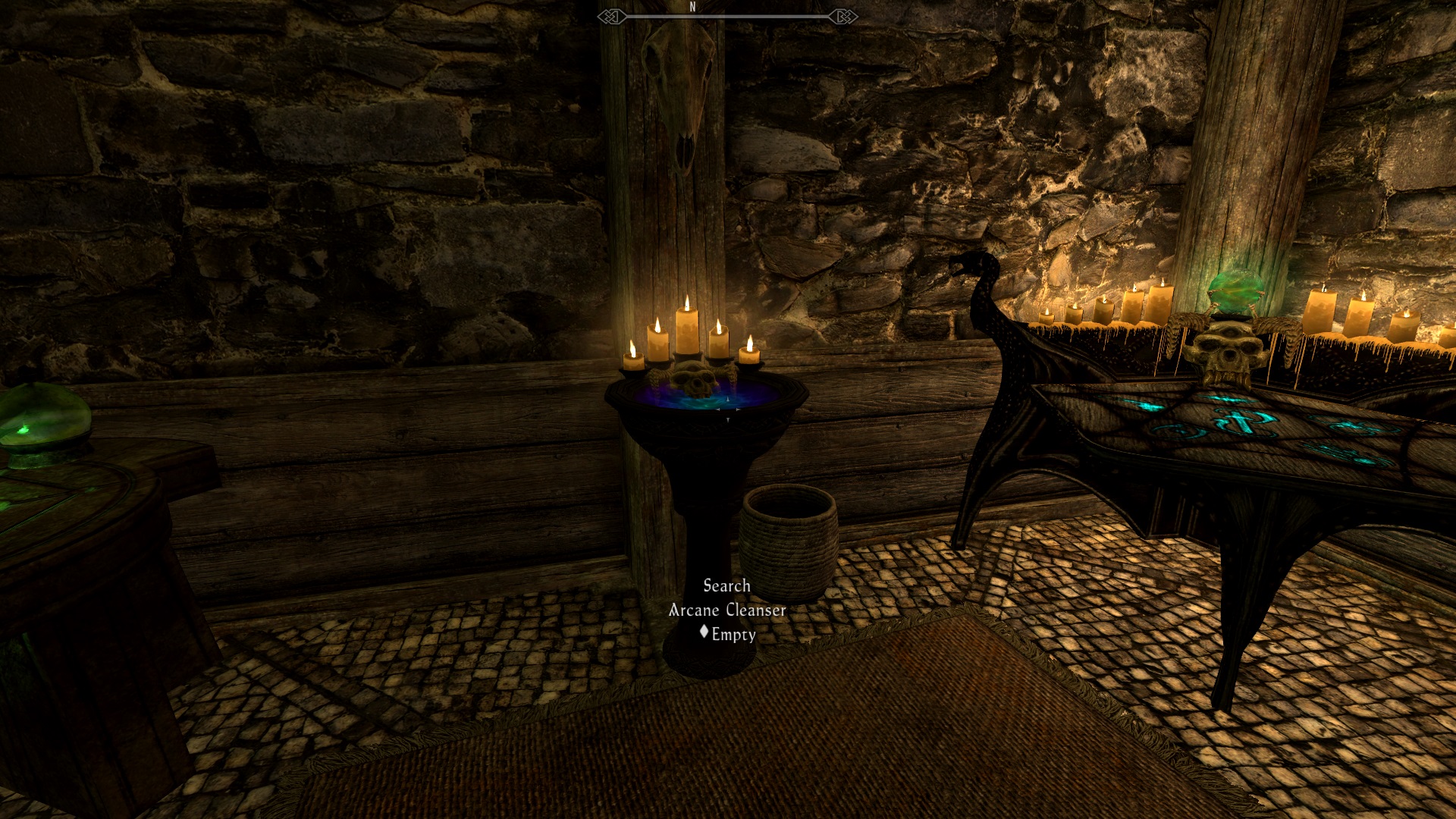 В Вайтране в Драконьем пределе, в Рифтене в крепости Миствейл, в Виндхельме в Королевском дворце и в поместье Морвейн на Солстейме есть чаша на подставке. Предназначение сего предмета снимать чары с вещей зачарованных игроком, а также со стандартных игровых предметов с чарами. Зачарования из пользовательских модов так-же с успехом удаляет (кроме тех предметов что существуют только в зачарованном виде). Предметы из официальных дополнений также очищает,но кроме тех которые существуют только в зачарованном виде. Например Рунный молот из DLC Dawnguard останется не очищенным так как в другом виде в игре не встречается. При снятии чар с колец и обручей получаем не зачарованный аналог- золотое или серебренное кольцо с камнем или без. То же касается и обручей.