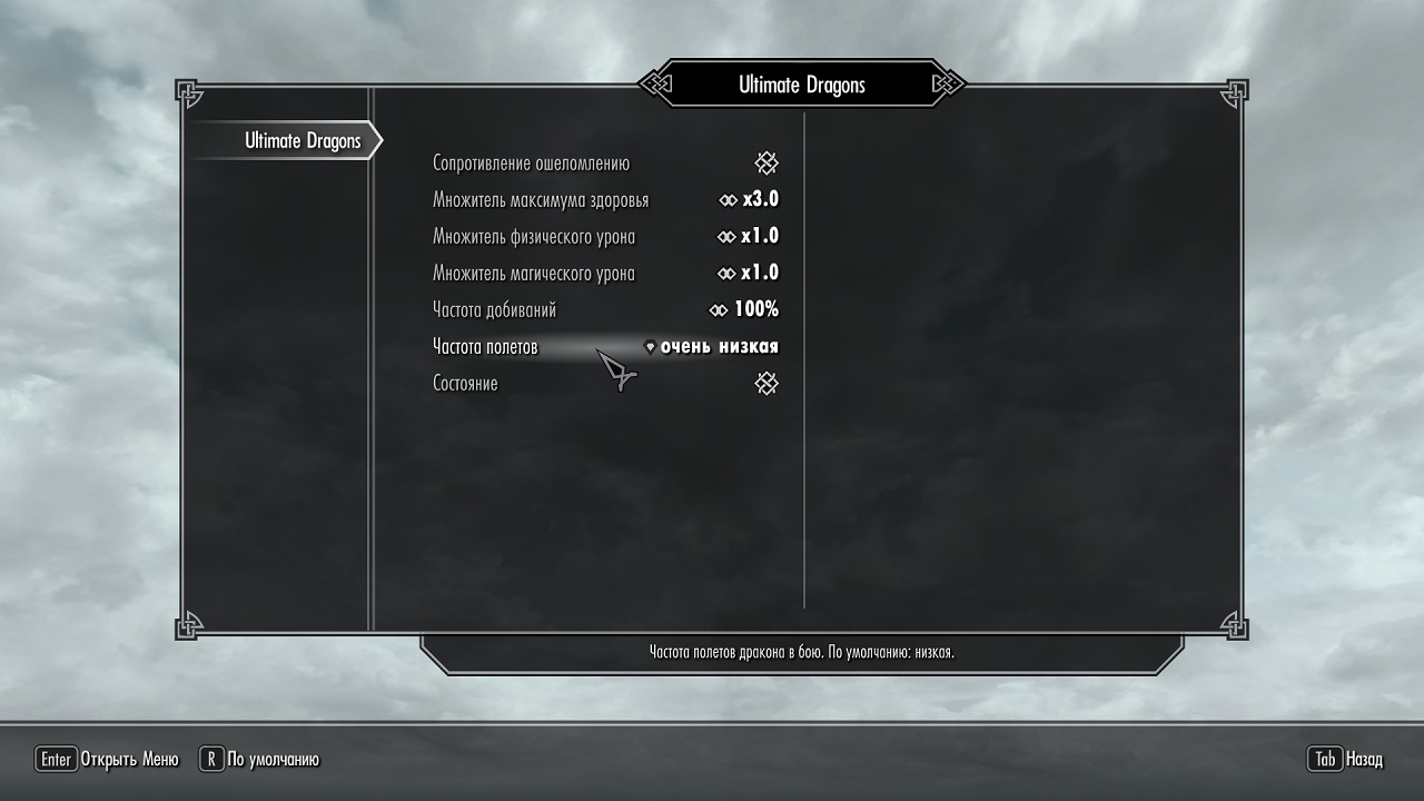 в) Настройка сопротивляемости ошеломлению драконов, величина их здоровья, частота добиваний, а также выключение мода доступны пользователям SkyUI.