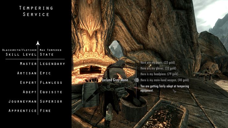 - Из-за опции износа кузнецы и мастера могут теперь улучшать ваше снаряжение (за исключением артефактов) за деньги. Кузнецы обойдутся дороже, но они могут улучшать все. Услуги мастеров стоят дешевле, но ограничены легкой броней, луками и одноручным оружием.
