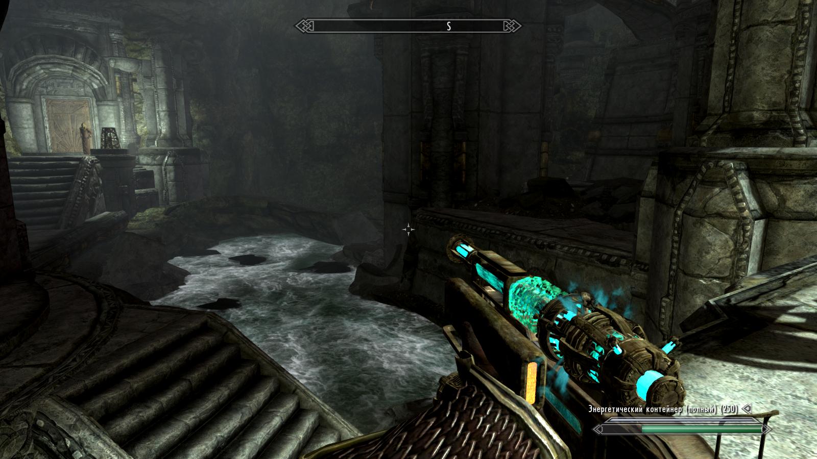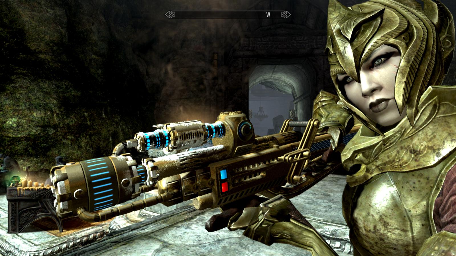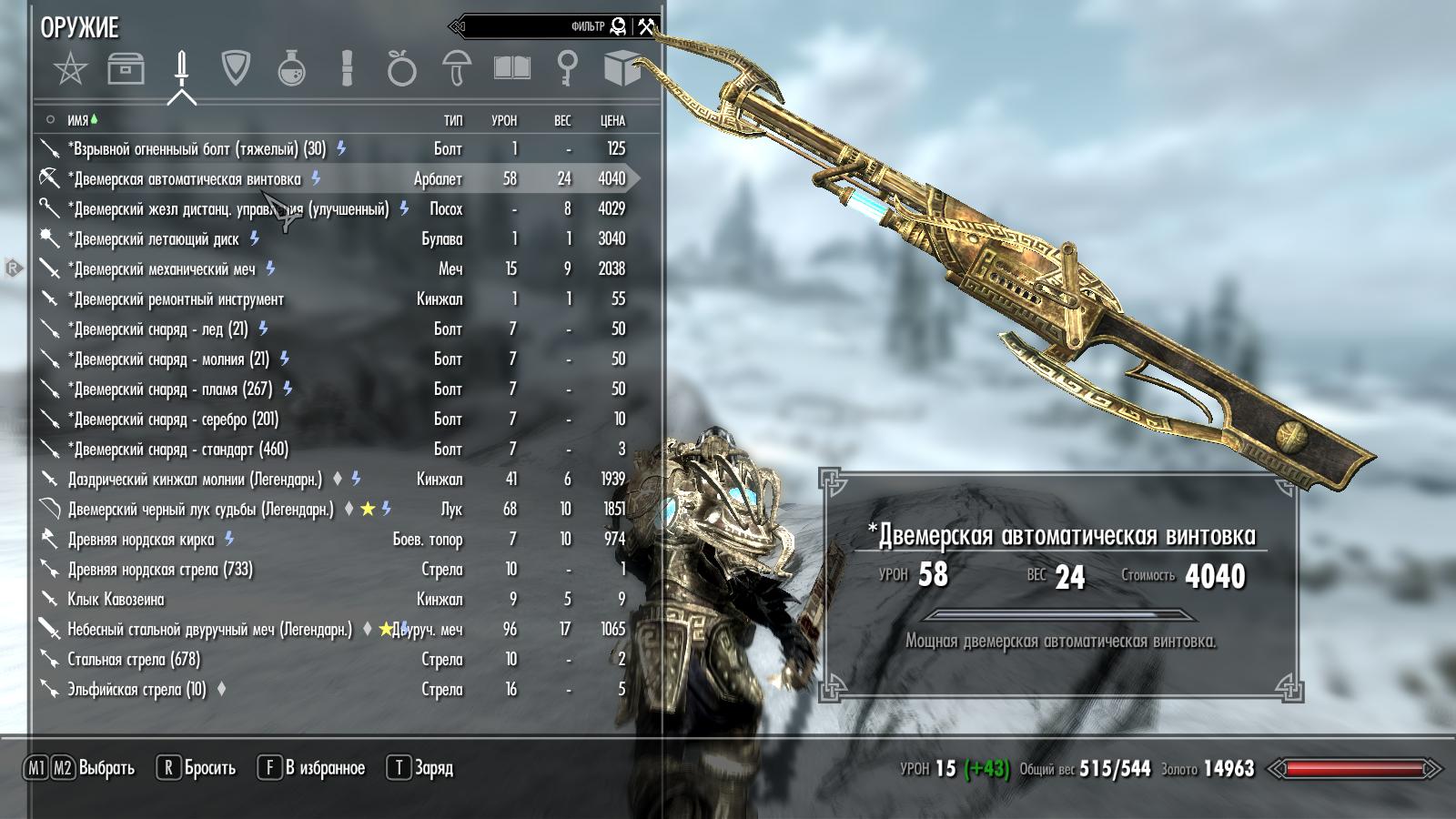 Как стрелять из нового оружия: удерживайте ЛКМ и нажмите кнопку активации (по умолчанию Е).Двемерская автоматическая винтовка. Очень мощное оружие дальнего боя, стреляет снарядами напоминающими болты. Всего пять видов снарядов: огненные, ледяные, электрические, серебряные и стандартные.