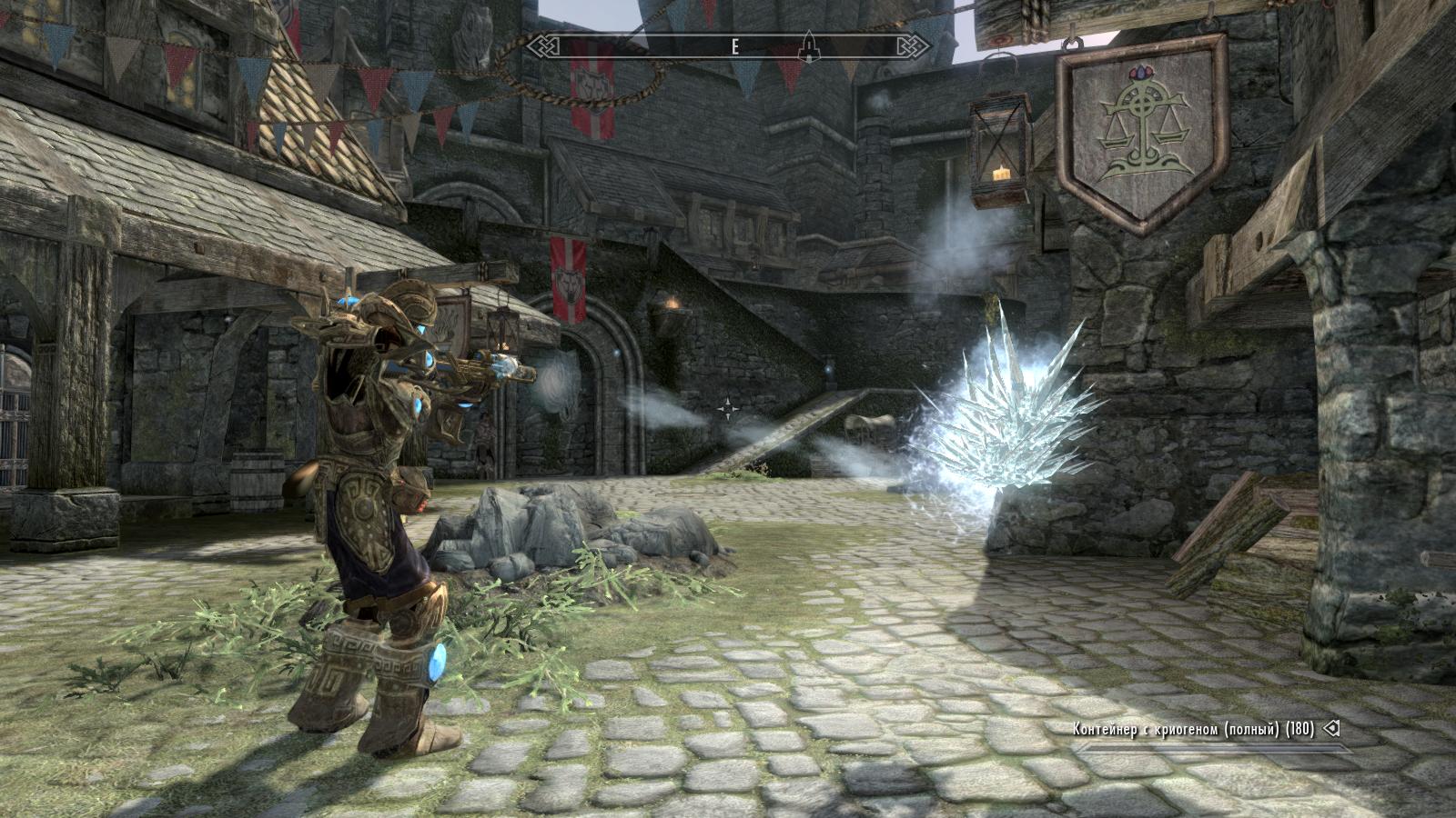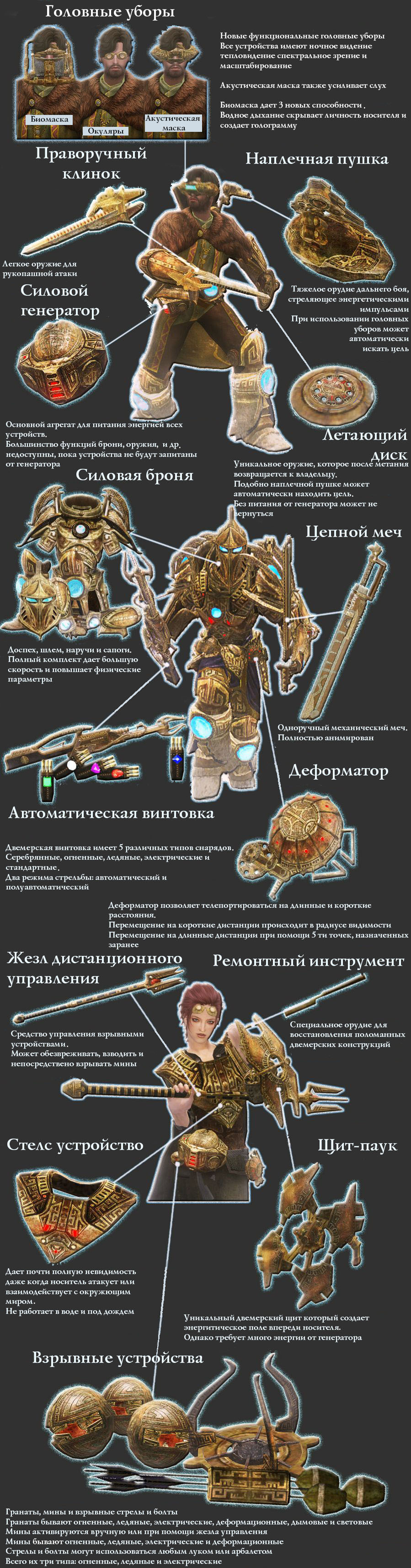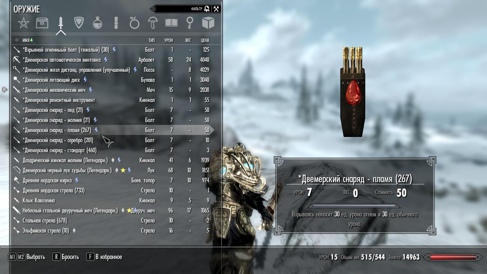 Как стрелять из нового оружия: удерживайте ЛКМ и нажмите кнопку активации (по умолчанию Е).Двемерская автоматическая винтовка. Очень мощное оружие дальнего боя, стреляет снарядами напоминающими болты. Всего пять видов снарядов: огненные, ледяные, электрические, серебряные и стандартные.