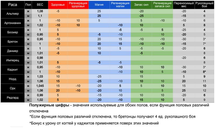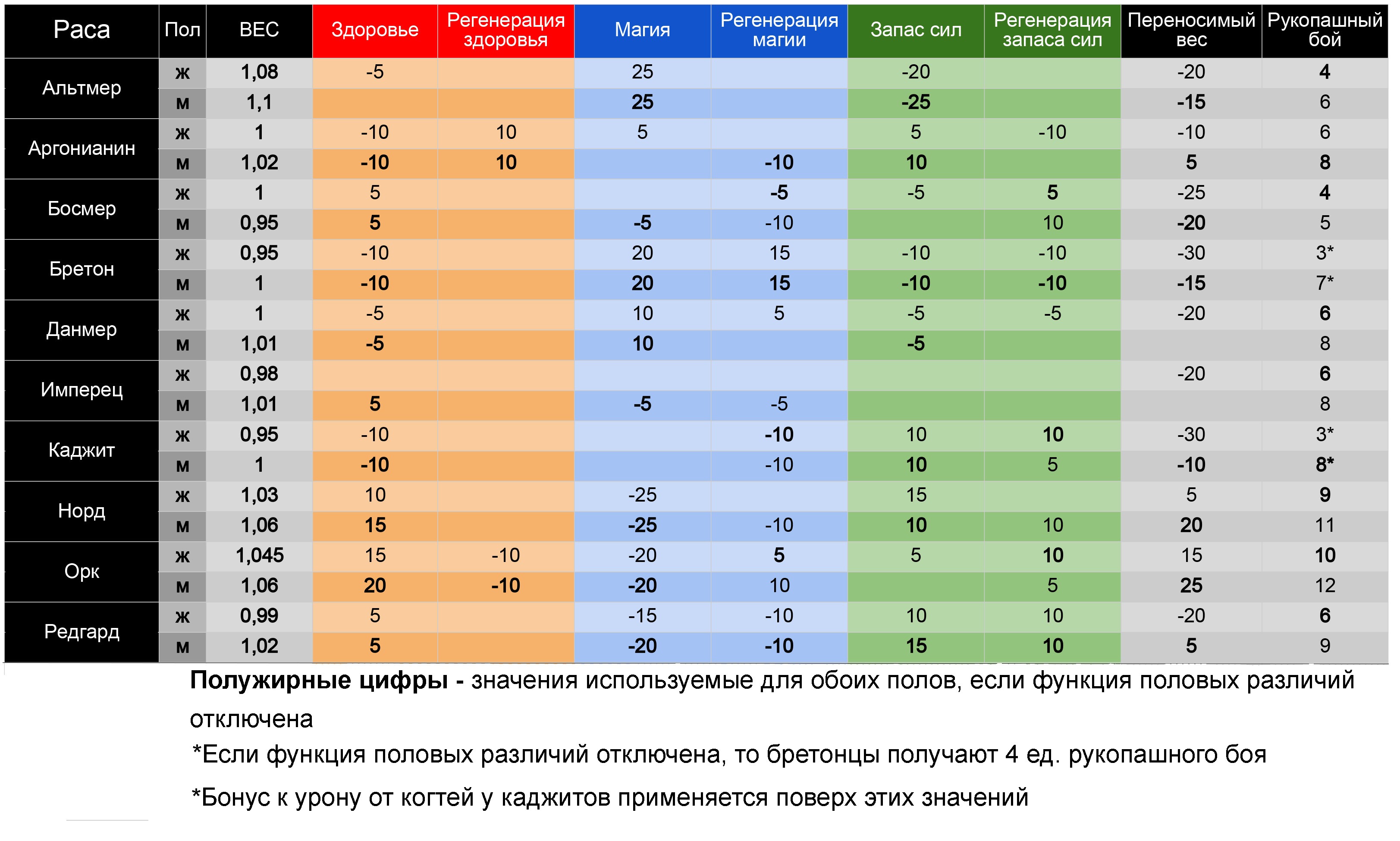 В зависимости от выбранной расы определяются такие атрибуты как рукопашный бой, скорость передвижения, шанс запугивания, масса тела, переносимый вес, начальное количество и регенерация здоровья, магии, запаса сил. Эти значения вы можете просмотреть на соответствующей картинке.