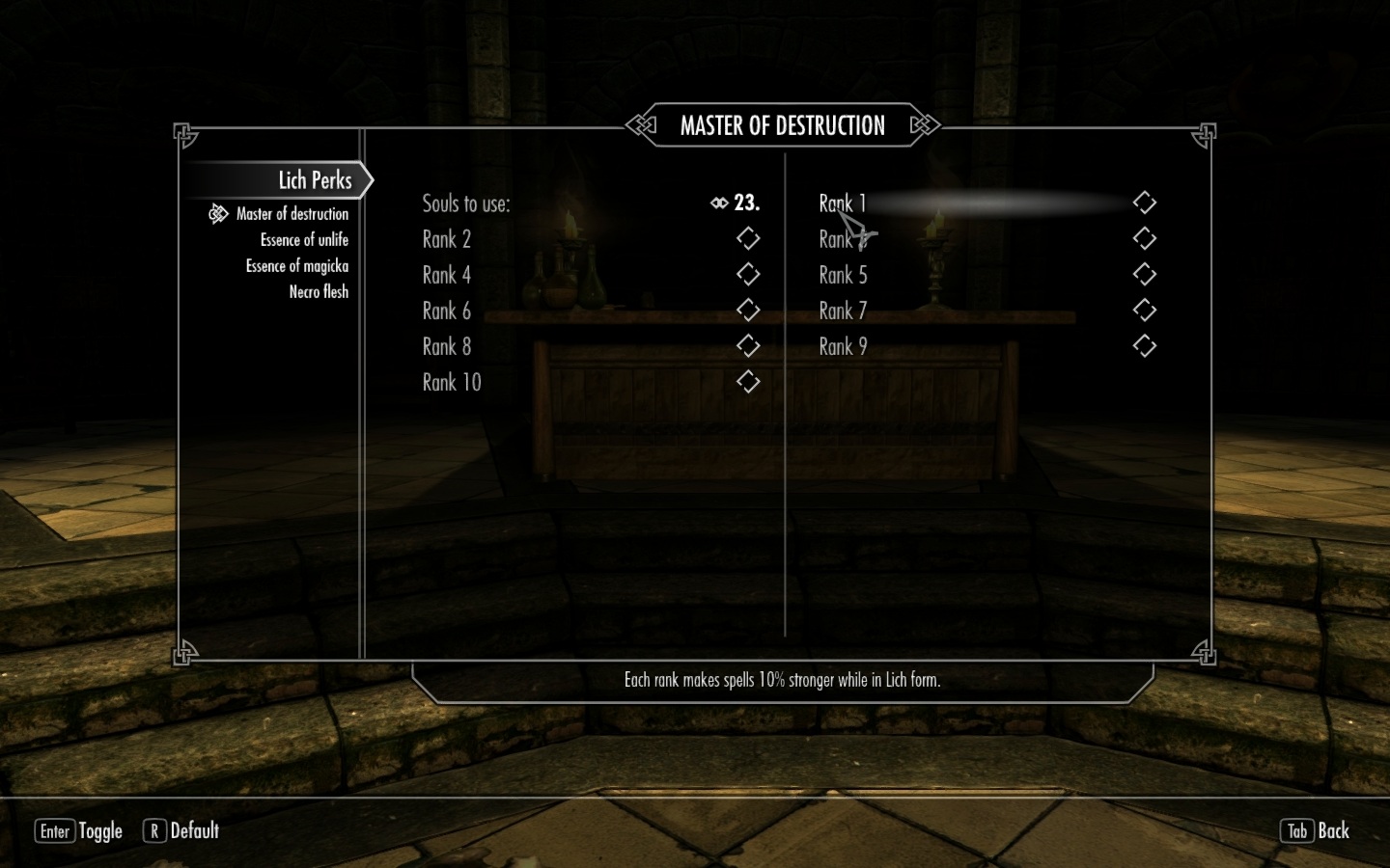 Для того, чтобы получать новые перки нежити, вам понадобятся души, много душ, которые вы сможете обменять на очки навыков. Для улучшения и получения новых способностей нужны только черные камни душ(Заполненные). Новые перки будут работать только в форме нежити. Мод добавляет около 12 новых способностей(всего в 1 способность можно вложить 10 ед. навыков), которые вы сможете изучить. Некоторые увеличивают ваши показатели, некоторые выживаемость, некоторые магию, а другие усиливают вашу армию мертвецов. Мод полностью совместим с модом "