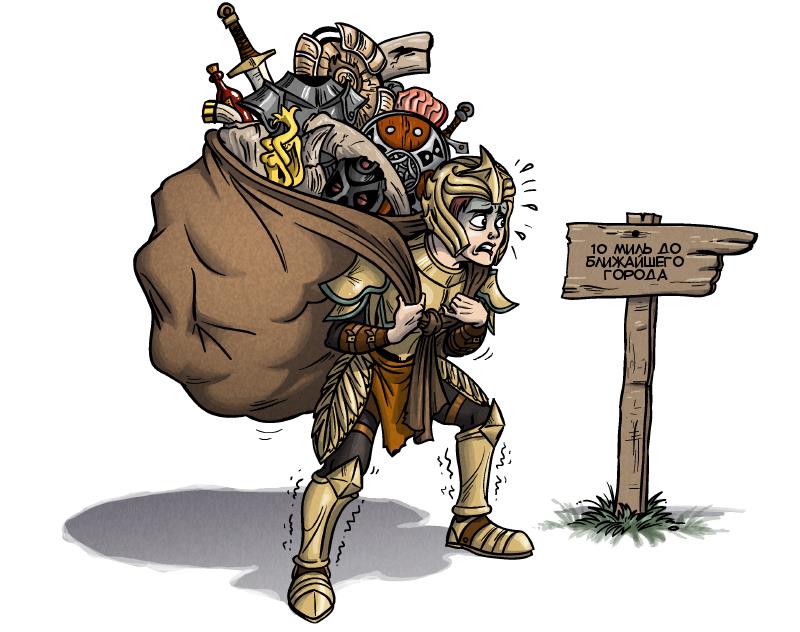 - №1 Герой самостоятельно избавляется от перегруза, постепенно выбрасывая лишнее. Здесь выбрасываются даже квестовые щмотки, но их можно обратно подобрать. Важно, что выбрасывается золото (в виде стеков монет). Пока Довакин не избавится от лишнего нужно ждать. Скидывает он шмотки случайно и в случайных количествах.