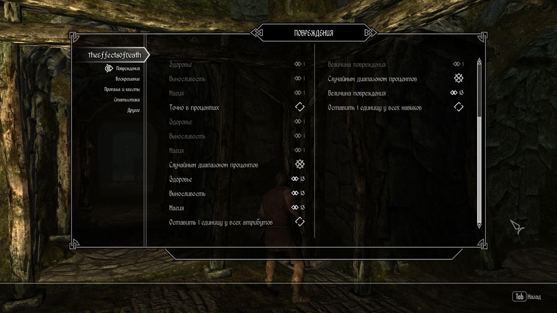 Т.е. каждый раз после смерти вы будете повреждать базовый максимум атрибута на выбранное в меню мода количество.
