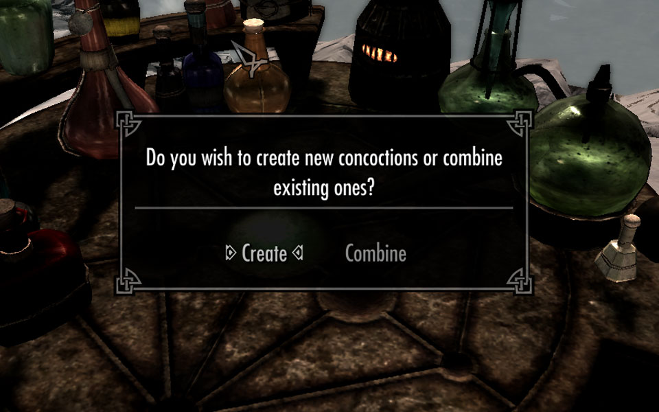 Когда вы активируете Алхимическую лабораторию, вам будет предоставлен выбор (см. скриншот). Это крошечный скрипт, который, если вы выберите "Комбинировать", откроет новое меню Алхимической лаборатории, которое предназначено для комбинирования зелий (скриншот). Ведь намного лучше использовать для приготовления зелий и ядов предназначенную для этого Алхимическую лабораторию, а не кастрюлю на кухне.