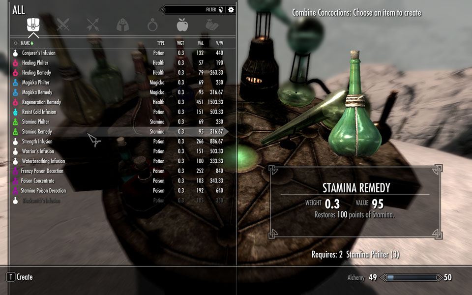 Вы объединяете два предмета одного ранга, чтобы получить один предмет следующего ранга. Возможности сочетаний ограничены вашим навыком алхимии. Самое высокое требование к навыку - 80 и это необходимо для создания элементов последнего уровня, имеющих наивысшую силу действия (например, как у последнего зелья повышения здоровья (ванильное название «Эликсир здоровья»)).