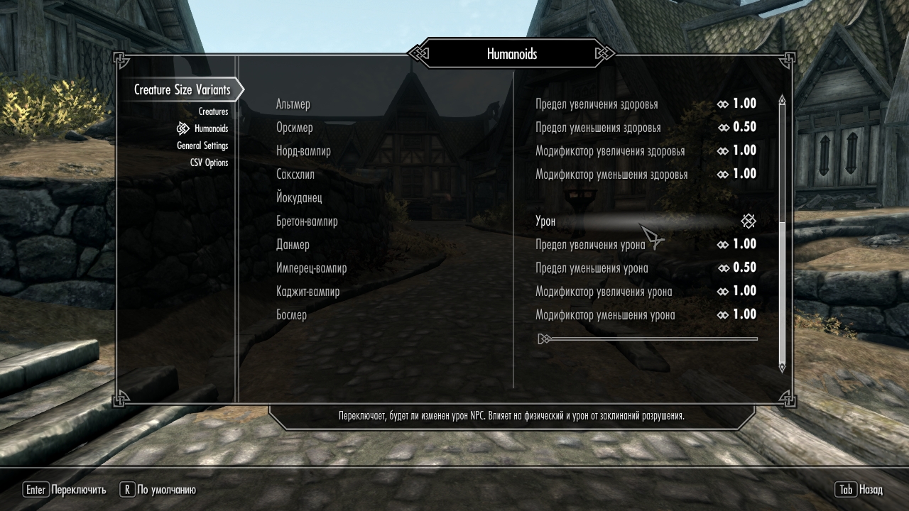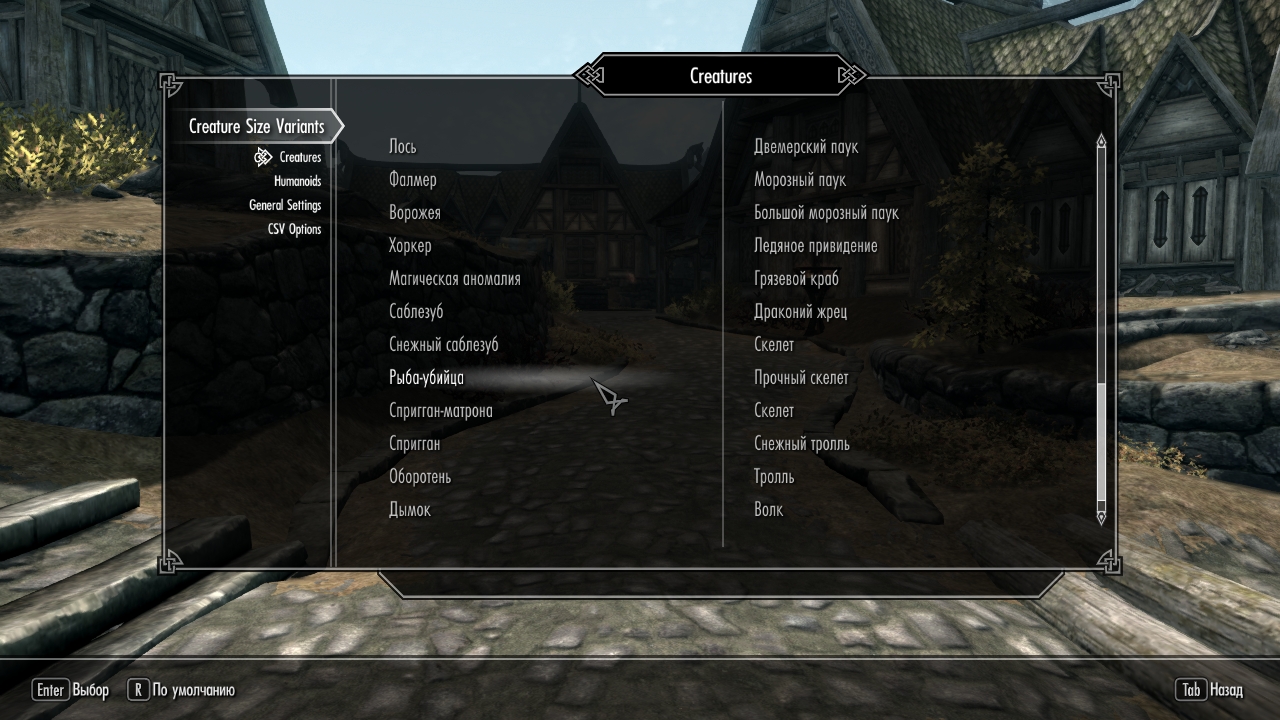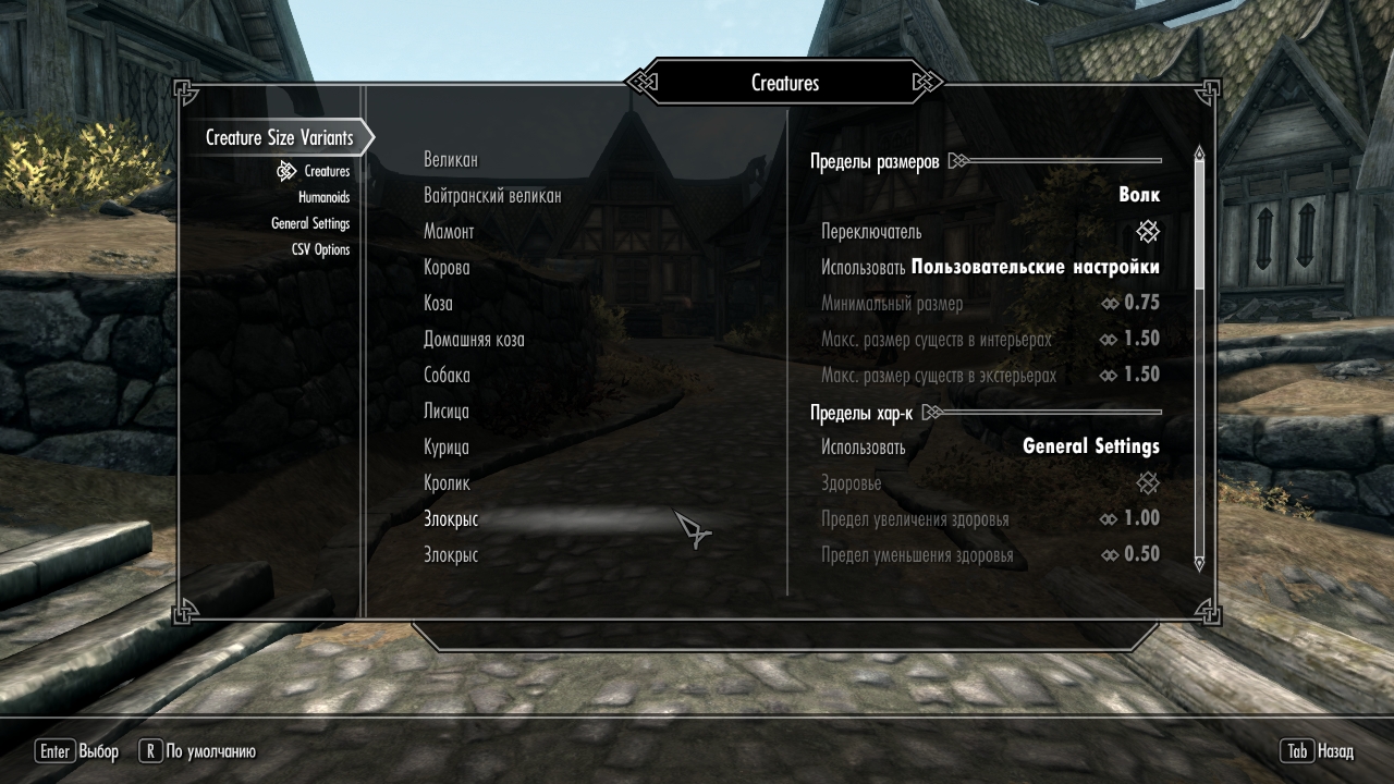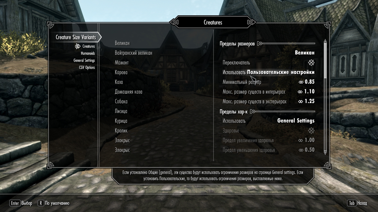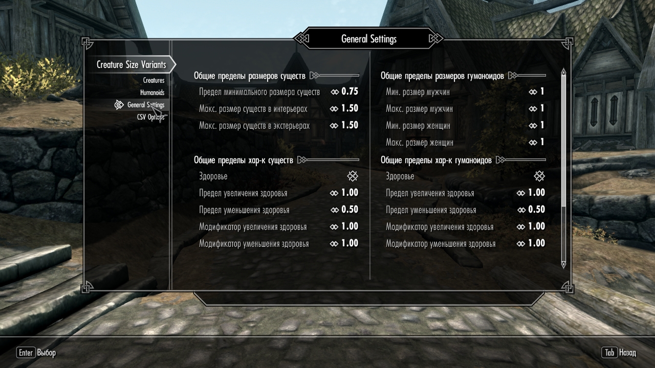 Также, помимо существ, возможно изменение размера гуманоидных NPC, это может делаться в зависимости от их расы и является отдельной настройкой. Мод не влияет на уникальных персонажей, лошадей и гигантских морозных пауков во избежание багов и каламбуров.